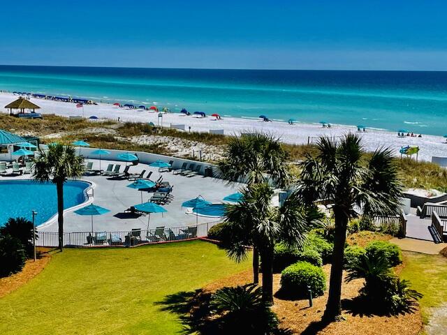 If you know, you know that location & size matters! This 2 bed/2 bath larger floorplan condo is ideally located on the 4th floor, BEACH front condo with unobstructed views! Updates galore, wood look tile flooring throughout for seamless continuity, granite countertops in the kitchen & bathrooms, the primary bedroom with an ensuite bathroom and access to the balcony. Conveys fully furnished and rental ready with room to sleep 6. Skip the elevator with easy stair walk up option and exterior owner's closet! Edgewater Beach is a well-known unique beachfront resort with over 400' of PRIVATE beach centrally located in Miramar Beach...gated with 2 levels of covered parking,