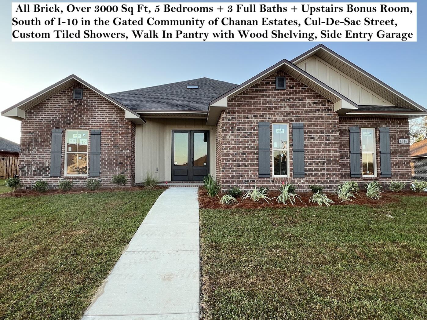 CLOSE IN 30 DAYS! South of I-10 Located in the Gated Community of Chanan Estates with County Property Taxes. PRIVACY FENCED BACKYARD! Be the 1st to live in this BRAND NEW 2025 Brick Home. FLOOR PLAN and Updated photos are attached, and some SAMPLE PHOTOS ARE LABELED. Perfect for MULTIGENERATIONAL Living or HOME OFFICE, HUGE UPSTAIRS BONUS Room Plus 5 Bedrooms & 3 Full Baths Downstairs. Oil Rubbed Bronze Finishes, QUARTZ Counter-Tops, STAINLESS Appliances Include, ISLAND RANGE HOOD, Slide-In Range, MICROWAVE, Dishwasher, UNDER & OVER CABINET LIGHTING, Single Bowl Apron Sink, WALK-IN PANTRY with CUSTOM WOOD Shelving. MASTER SUITE - Private French Door Rear access to the Back Porch. Tray Ceiling with Stacked Crown Molding & Rope Lighting, Ceiling Fan, CUSTOM WALK-IN TILED SHOWER with Oversized Recessed NICHE. Freestanding SOAKING TUB, with TILE SURROUND, 2 Separate Quartz Top Vanities, Walk-in Closet with Custom Built Wood Shelving combined with Vented Shelving, Private Water Closet. Over 2500 Square Foot of Vintage Gray Porcelain Tile on the First Floor with Carpet upstairs. 8 Foot French Door Entry. 2 Car Side Entry Garage. ALL BEDROOMS Have Walk-in Closets and Ceiling Fans. BUILDER PAYS MOST CLOSING COST, ASK FOR DETAILS. No City of Crestview Property Taxes. Mechanical and Other Information: AstroGuard Hurricane Fabric for Windows & Doors is Included with this Home. SPRAY FOAM ATTIC INSULATION. The Yard will have a Sprinkler System Installed. ALL THE FINISHES IN THE SAMPLE PHOTOS WILL BE THE SAME ON THIS HOME EXCEPT THE EXTERIOR VINYL ITEMS COLOR, GARAGE DOOR COLOR, HARDI BOARD COLOR, AND SOME OF THE LIGHT FIXTURES MAYBE DIFFERENT. HOA Dues $220.00 Per Quarter + $41.00 Per Quarter SA & CC of 0.25%.
