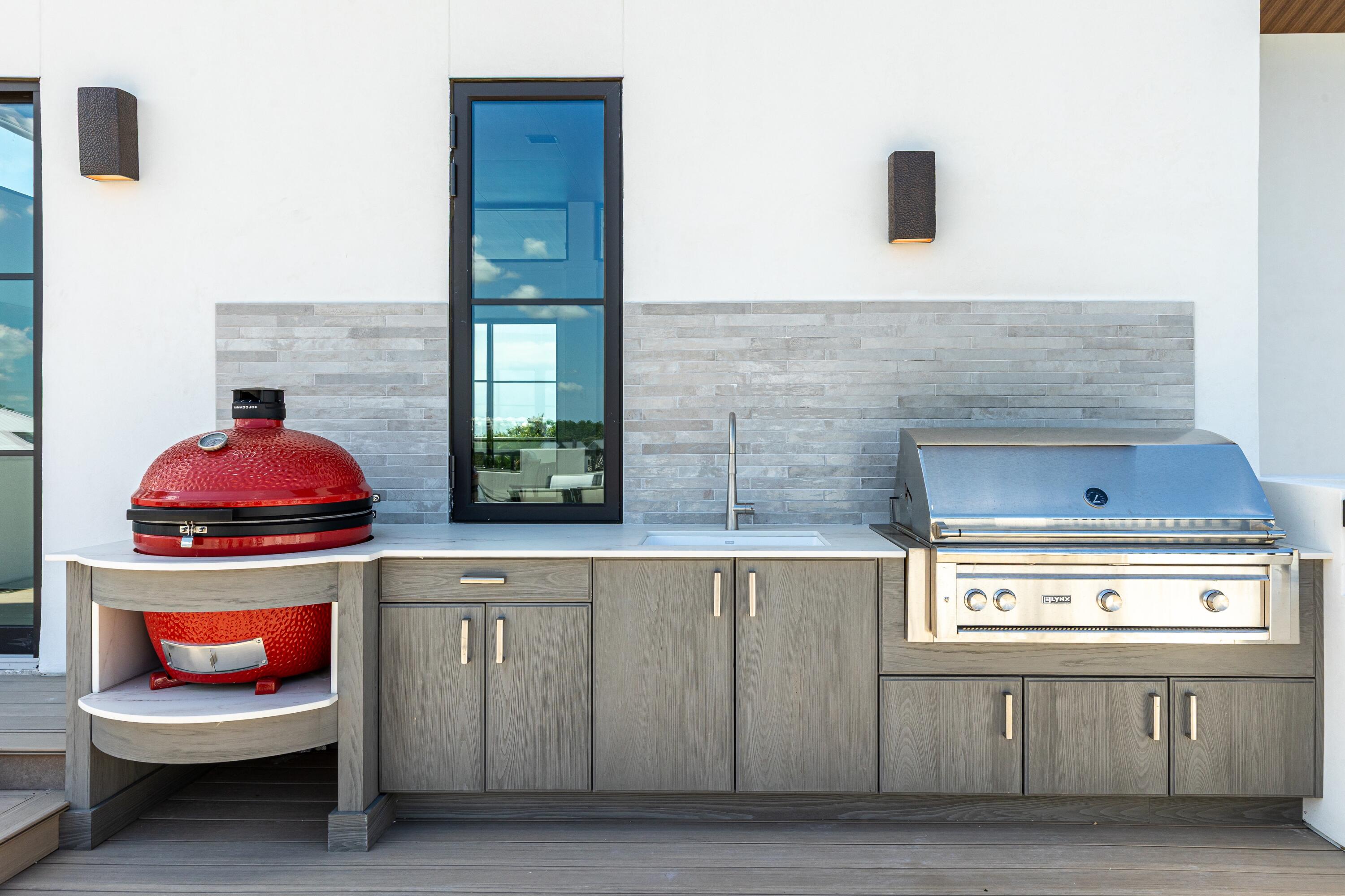The third-floor recreation area offers a showstopping rooftop retreat, opening directly onto a private resort-style pool deck with panoramic views of the Gulf. On the opposite side, a spacious patio with a fully equipped outdoor kitchen overlooks the tranquil waters of Camp Creek Lake. These rare dual waterfront vistas create a truly unique and elevated coastal living experience and are the focal point of the more than 2000 square feet of outdoor living area.