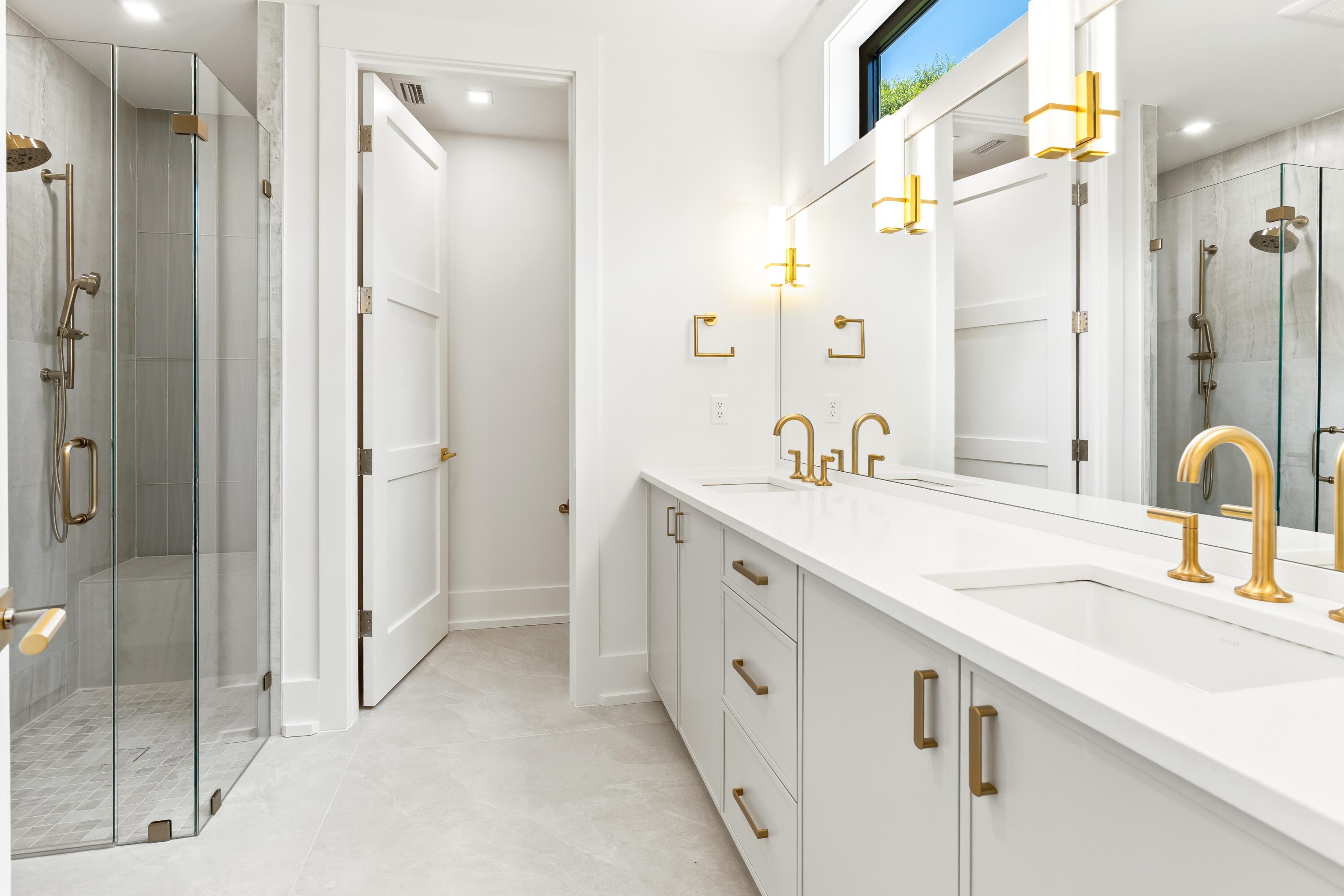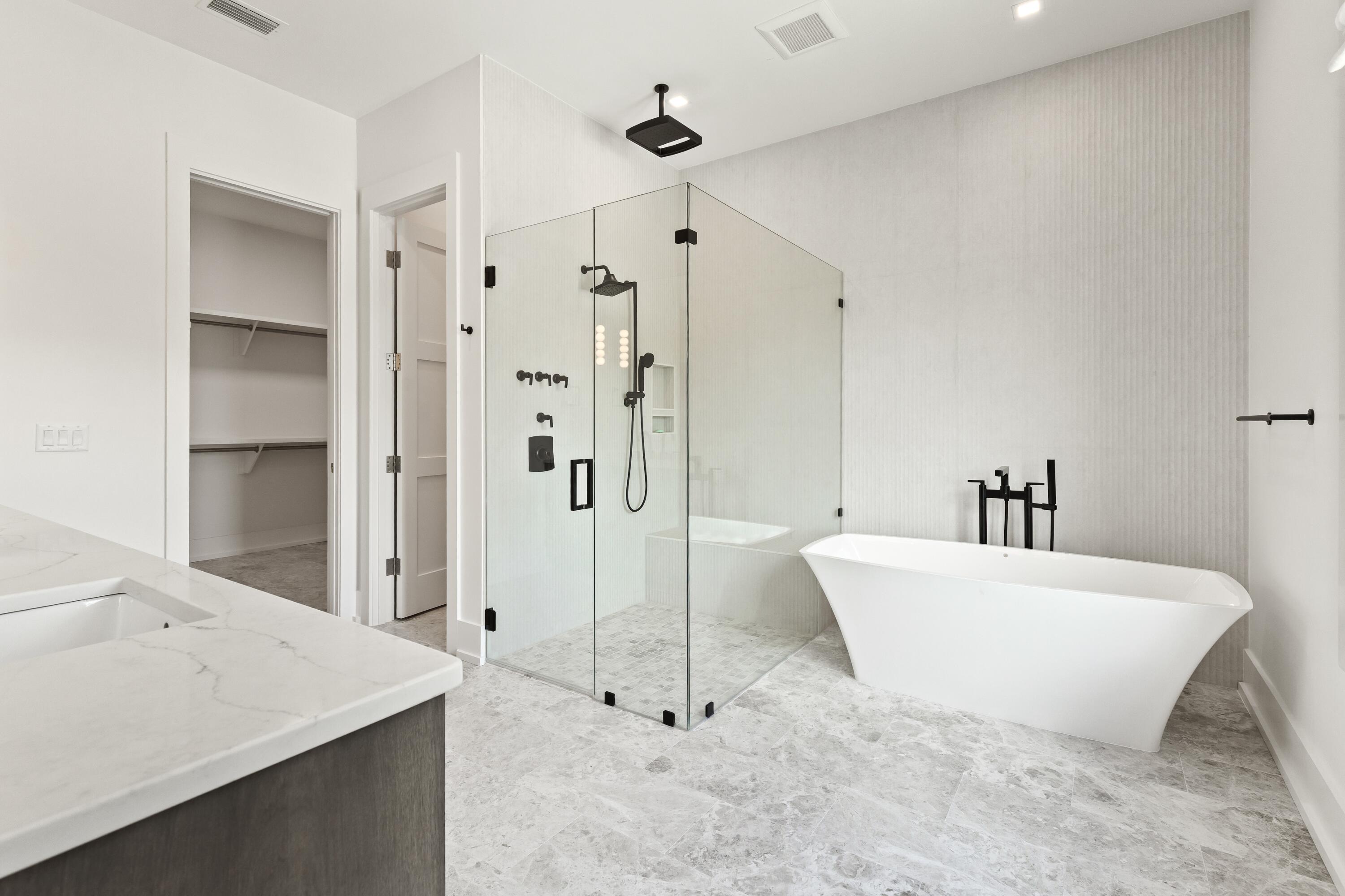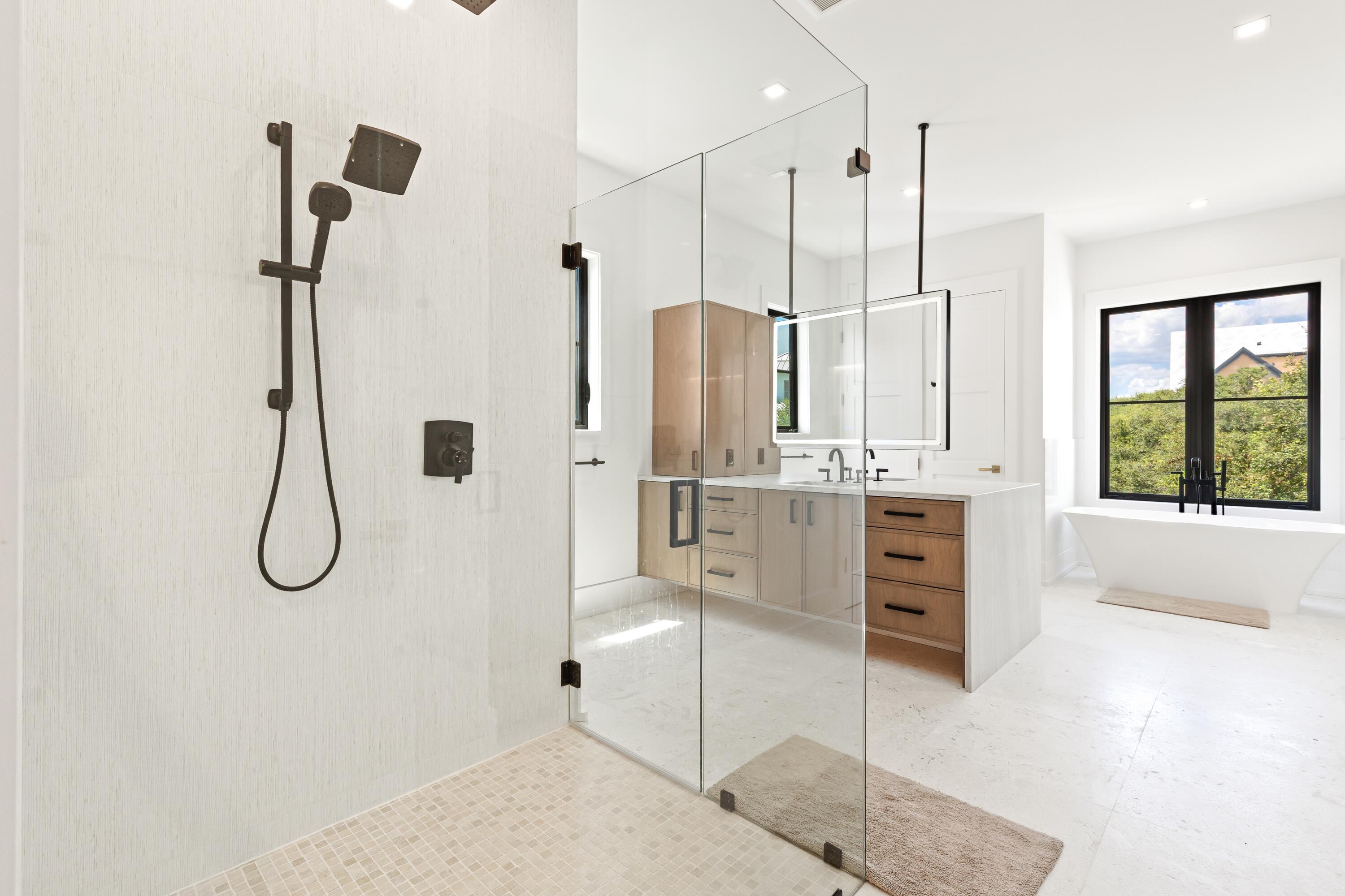 The primary suite is a private sanctuary, thoughtfully positioned for maximum privacy and natural light. It features a spa-inspired master bath with a soaking tub, oversized glass shower, and dual vanities with elegant custom finishes. A spacious walk-in closet completes the suite with style and functionality.