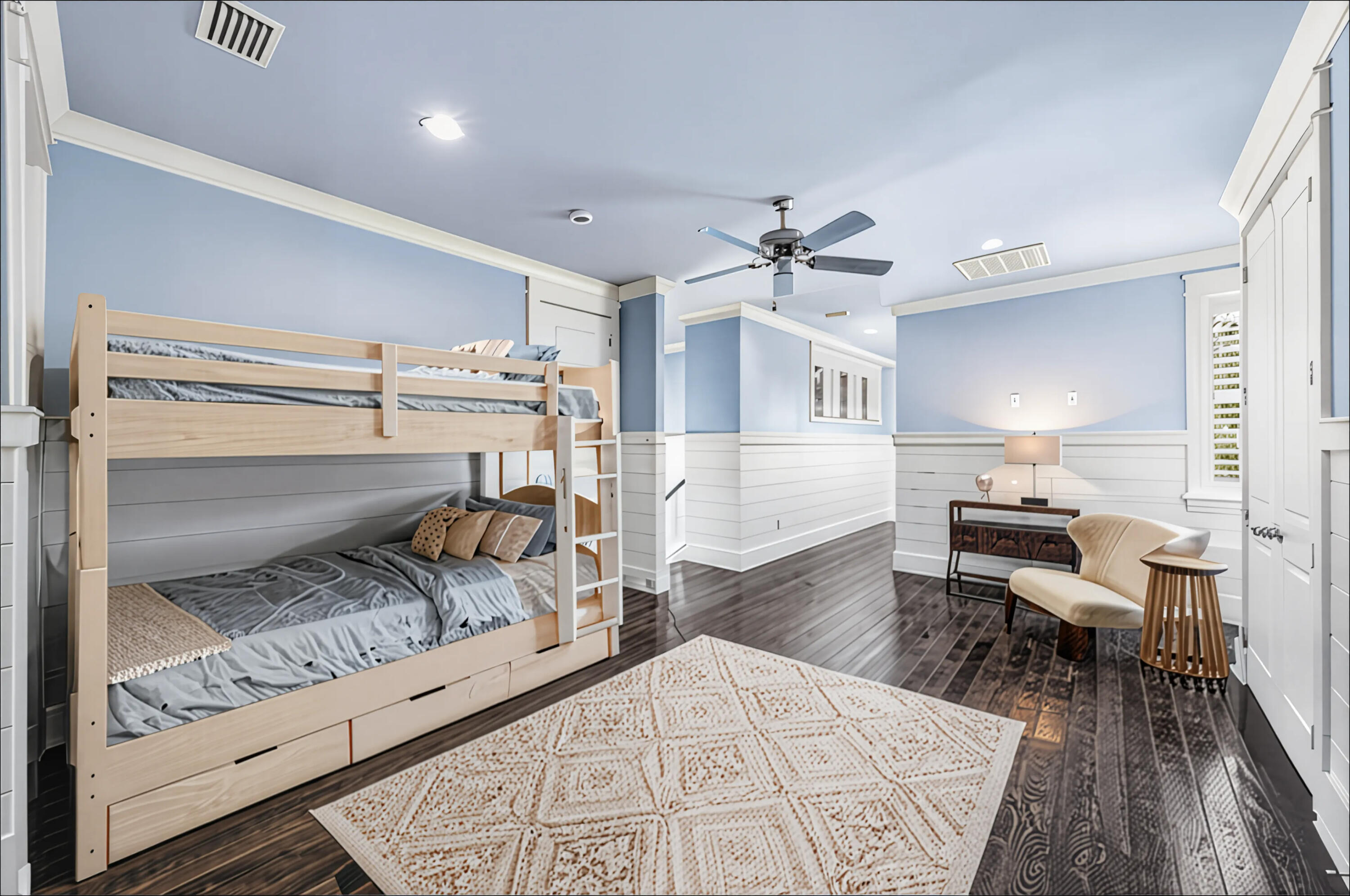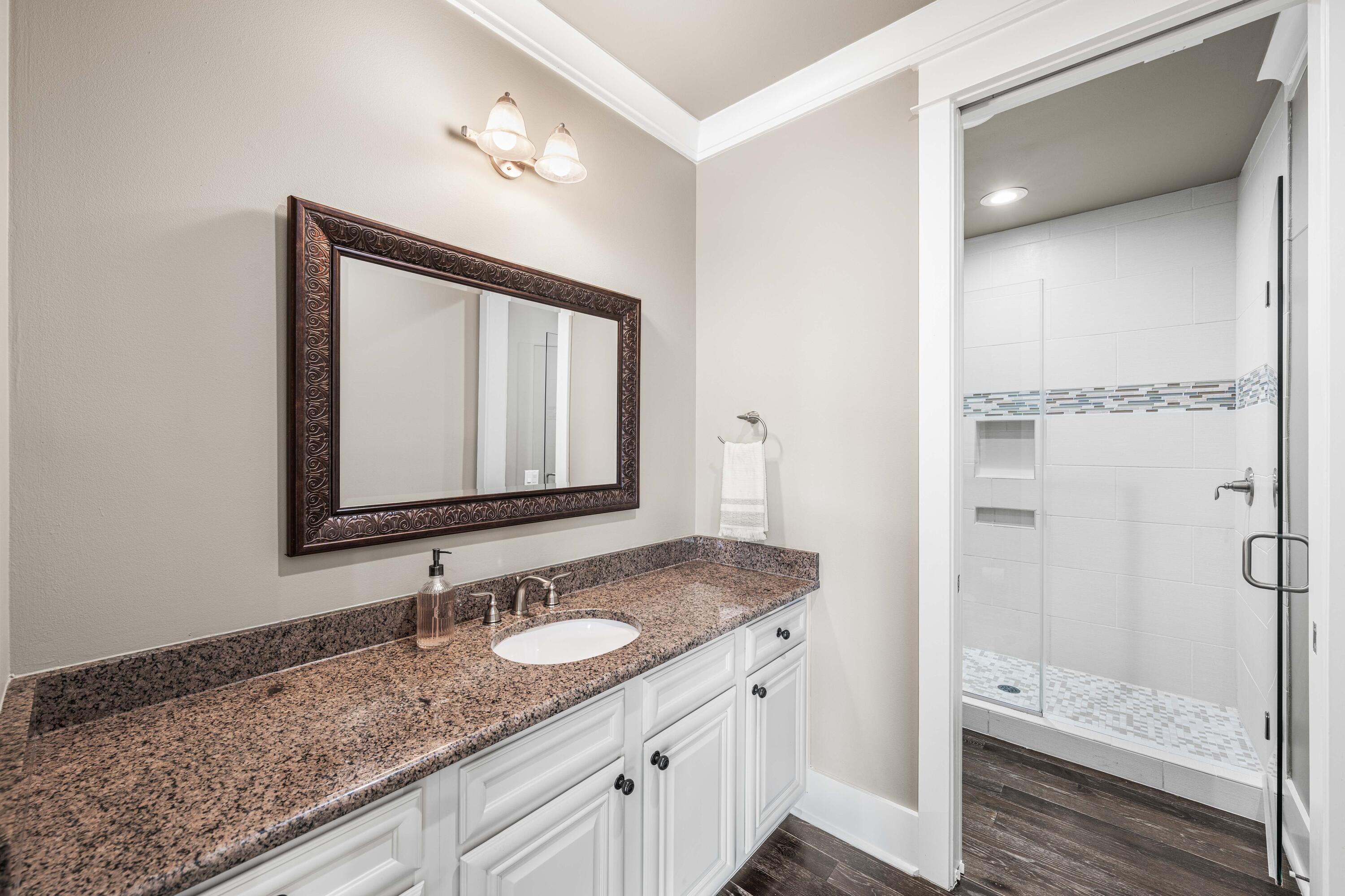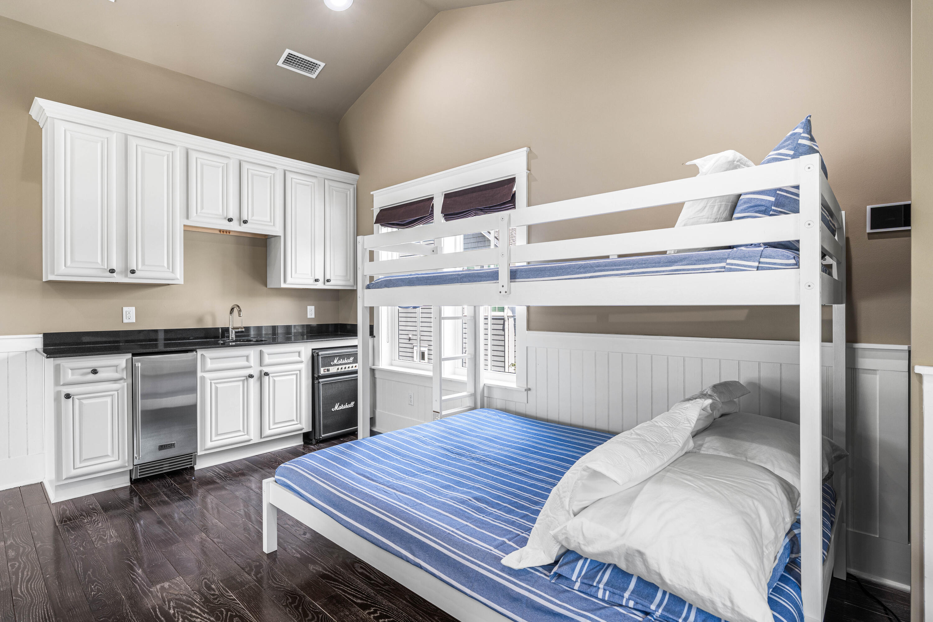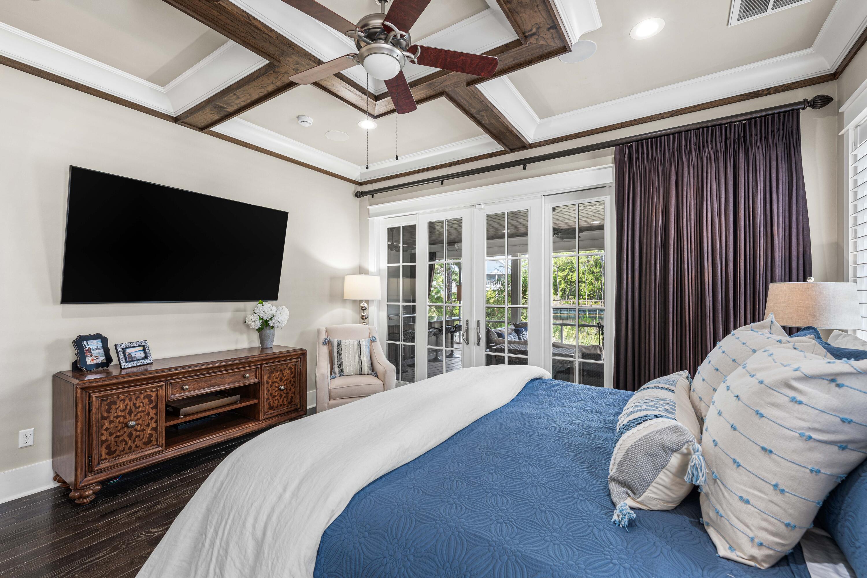 The main level primary bedroom has a stunning tray ceiling with wood beams and is a spacious and peaceful retreat with direct access to the screened porch. The luxurious ensuite includes a soaking tub and large shower plus a walk-in closet with custom cabinetry ensuring ultimate comfort and privacy. The second floor includes two additional guest bedrooms, each with its own ensuite bath and walk-in closet, providing a private and comfortable space for visitors. The fourth bedroom includes an ensuite bath and breakfast bar with beverage refrigerator, ice maker and sink and offers flexibility as an office, bedroom or second living area- the possibilities are endless. The second level also has a spacious open space off the stairs perfect for an additional living or bunk area.