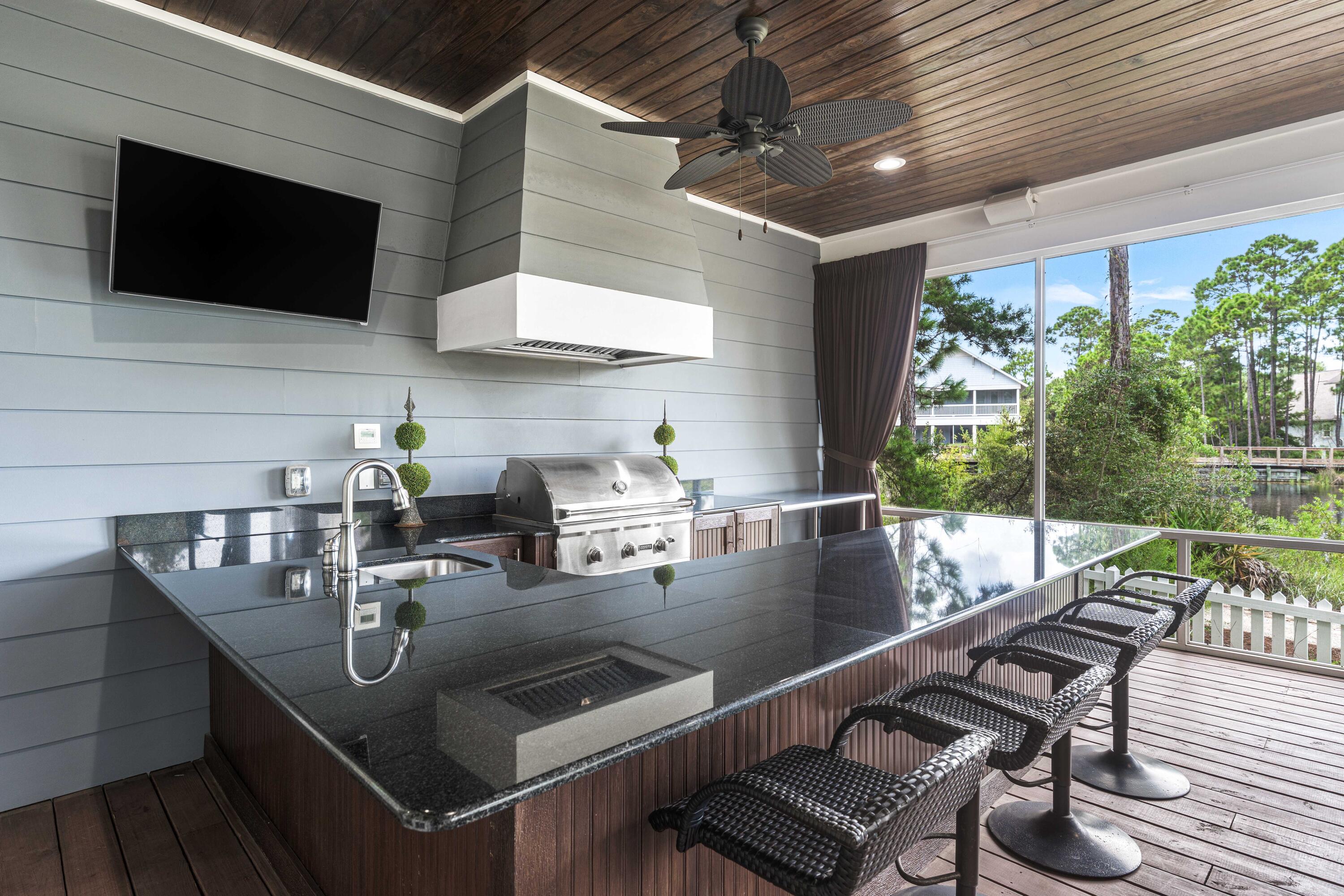 Enjoy the coastal life in the prestigious WaterSound West Beach community! This one owner 4BR/4.5BA lakefront residence boasts unparalleled luxury and comfort, perfect for those seeking a serene lifestyle along Scenic Highway 30A with deeded Gulf and beach access. This furnished property offers beautiful hardwood floors throughout, charming millwork including shiplap details and oversized crown molding enhance the coastal aesthetic and create a cozy, inviting atmosphere. The gourmet kitchen features stainless-steel appliances, granite countertops, a center island, large pantry with wine fridge and a custom breakfast table with banquet seating. Enjoy breathtaking lake views from two generous screened porches, offering the perfect blend of indoor and outdoor living. The first-floor screened porch is a haven for relaxation, featuring a cozy fireplace, a spacious sitting area, vented grill and a fully equipped bar with ample seating for effortless entertaining. The second-floor screened porch is your personal sanctuary, complete with a spacious sitting area and a soothing hot tub to unwind after a long day.