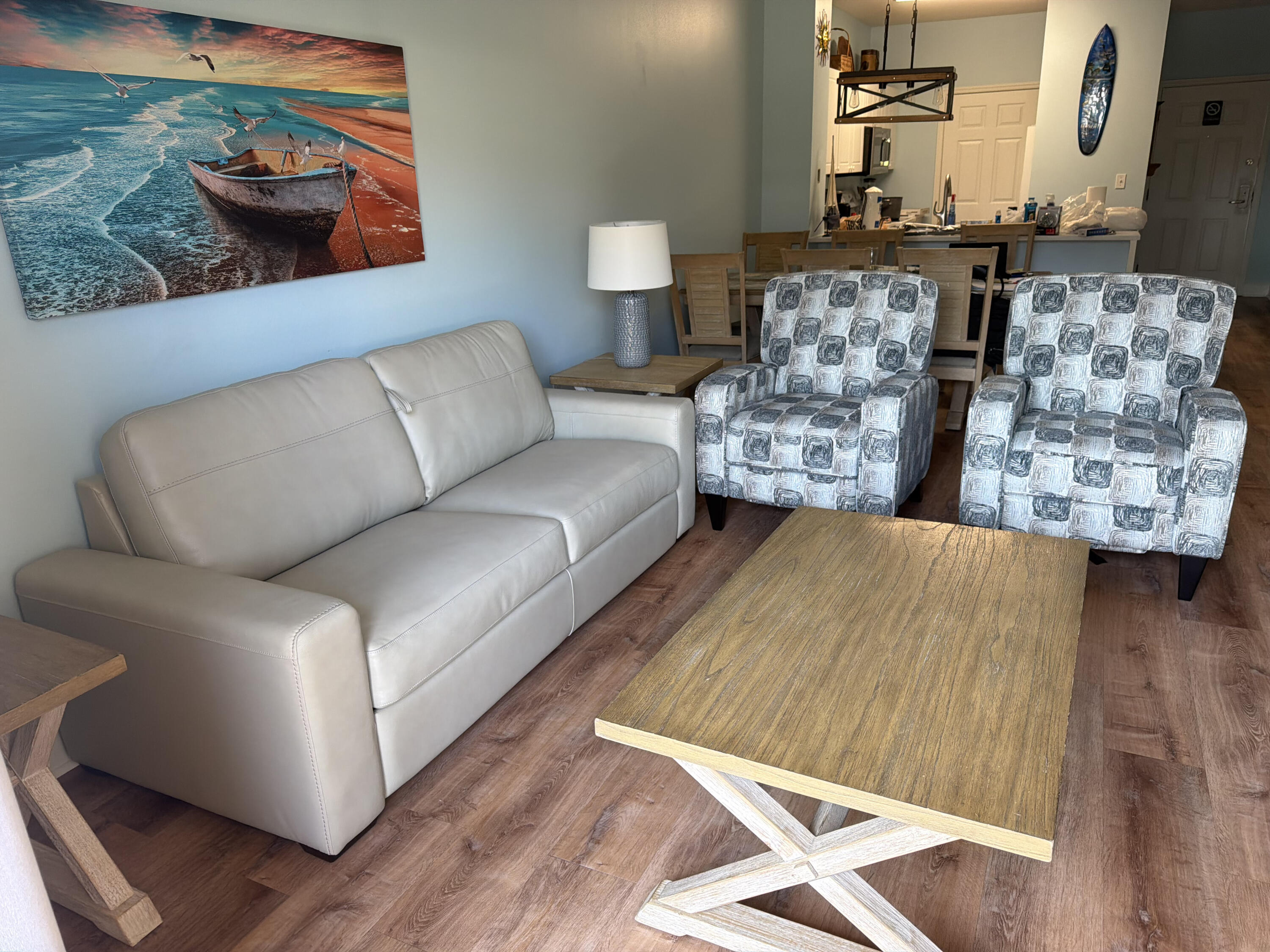 This Stunning highlly desirable Emerald Waters Beachside Condo update has deeded and direct beach access. Just walk right across the street to the Emerald Green waters and White Glistening Sand. This updated 2/2 provides a coastal ambiance that vacationers seek out. Kitchen has new gorgeous quartz counter tops. Bathroom with new vanties and counter tops. New Luxury vinyl flooring throught! New Bedroom furniture in both bedrooms, drapes and blinds and patio furniture . Access to everthing fun is right here! This is a low density building with only 36 units and does have elevators.Unit is self-managed.
