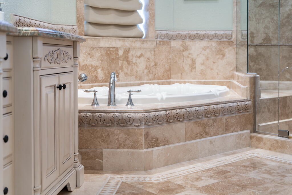 The stairs are travertine, and they went the extra mile to accent them with travertine trim.
