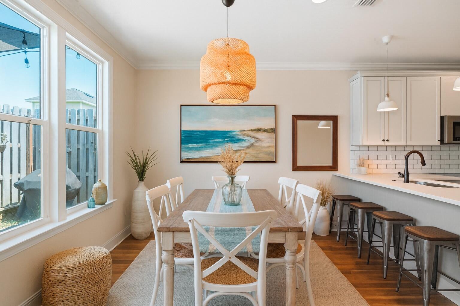 Welcome to 104 Hatton, where comfort and convenience meet coastal charm. Perfectly positioned on a desirable end lot beside a peaceful green space, this home offers added privacy and openness without the upkeep of a large yard. Just steps from the community pool, it's ideal for those who want to enjoy a relaxed, low-maintenance lifestyle. Inside, you'll find stylish custom finishes throughout - from shiplap accents and quartz countertops to quality appliances and an open-concept layout that makes entertaining a breeze. The main level features a spacious great room, a well-appointed kitchen with pantry, a guest suite, powder room, and a large laundry area. The oversized two-car garage provides extra storage for bikes, beach gear, and more. Upstairs, the primary suite serves as a private retreat with a spa-inspired bath and generous walk-in closet, joined by two guest bedrooms connected by a Jack-and-Jill bath. Outside, the cozy patio is perfect for grilling, morning coffee, or dining al fresco without the burden of heavy yard maintenance.