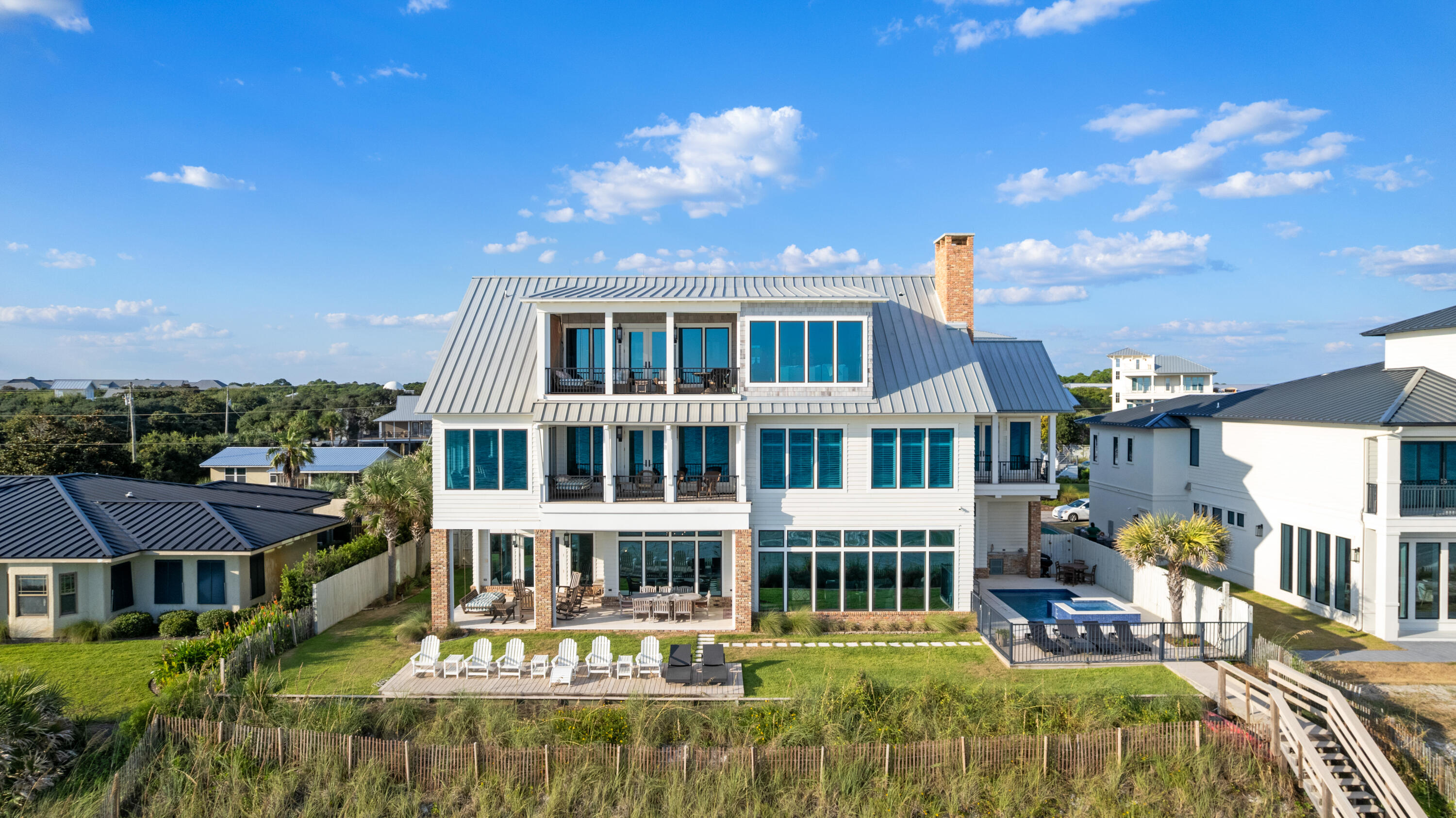 Sited on approximately 0.30 acres with 100 feet of pristine beachfront, the property exemplifies architectural refinement and superior craftsmanship. The three-story structure is clad in durable Hardie board with brick accents and crowned by a classic metal roof, reflecting both timeless coastal tradition and enduring quality.