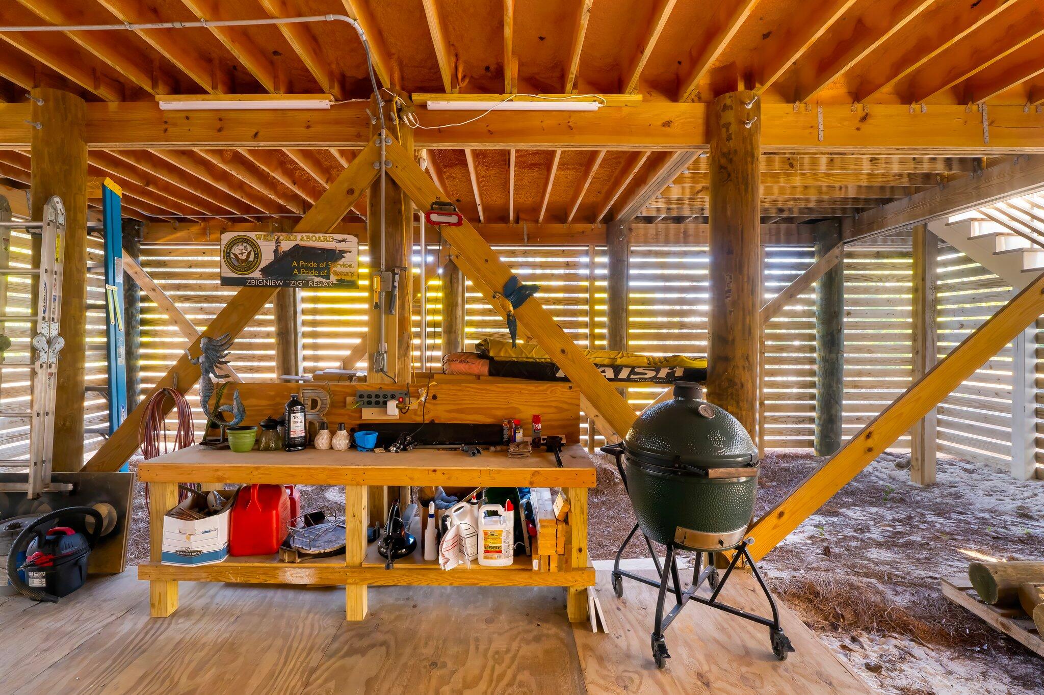 Outside, the expansive private yard is ideal for backyard entertaining, complete with a barbecue area, and under the house storage offering over 1,500 SF of storage space. Perfect for all of the beach toys. The newly painted exterior complements the lush surroundings, while the oversized two-car garage includes a separate storage space and a convenient sink.