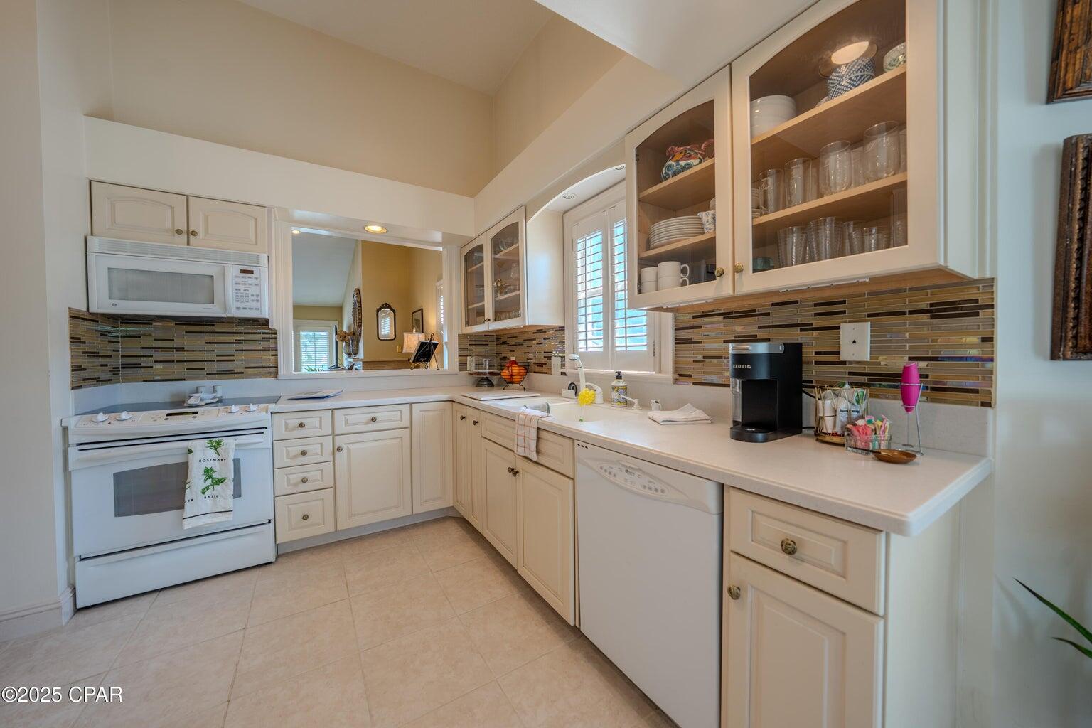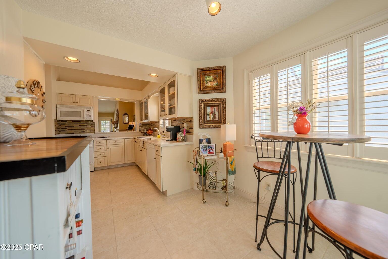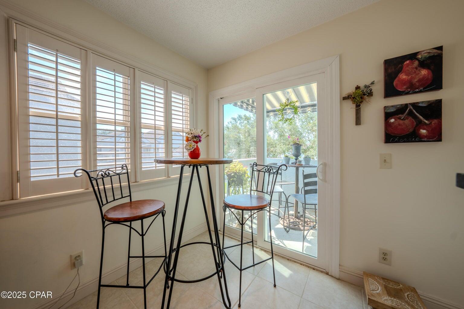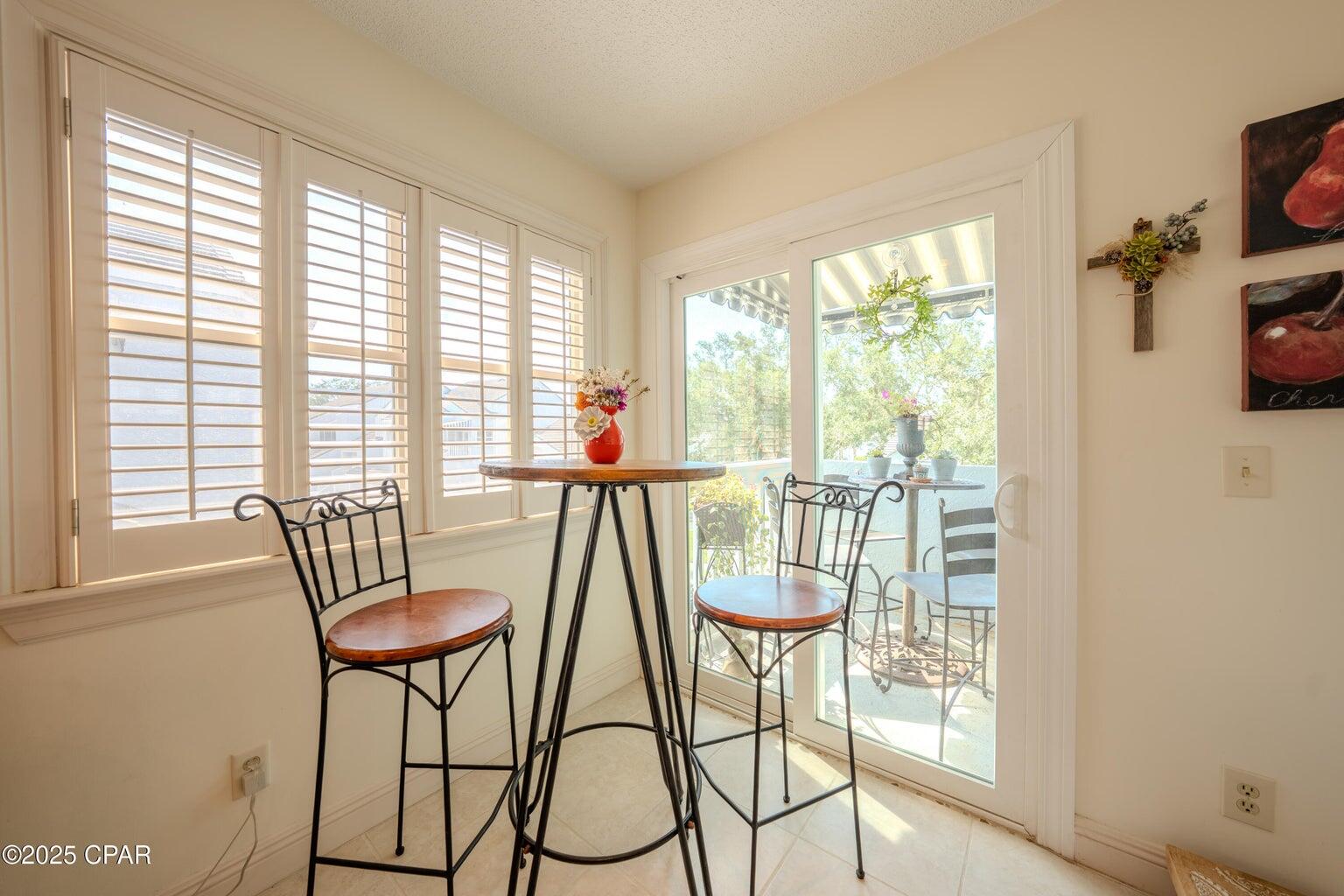 Absolutely gorgeous, 2BR/2BA at Marina Club Village--with direct views over the pool and deck and peeks of Grand Lagoon from both balconies. From the foyer, built-in bookcase/curio shelving set the tone. A dry bar adjoins the living/dining area. Throughout the home you'll find custom 3'' plantation shutters and abundant natural light. The light, airy kitchen features tile floors, updated countertops, cabinets, and sink, plus a mosaic glass tile backsplash. It opens to a cozy breakfast room with its own balcony and lagoon view--a perfect morning coffee spot. The living room offers high ceilings, a fireplace (ideal for electric logs), and large windows to the main balcony. A true split plan: the oversized guest bedroom sits opposite the private primary suite. The primary suite opens to the l large main balcony overlooking the pool and deck; its spacious bath includes double vanities, a separate jetted soaking tub and tiled shower, plus a large walk-in closet. Additional highlights: one-car garage, the unit has been wired for an in-home generator (located in the garage; configured to power most of the homeexcludes AC and stove), Community perks: residents' pool & sun deck, manicured grounds, and all the advantages of Bay Pointa guard-gated, golf-centric community with a Nicklaus-designed course, active clubs, and proximity to the full-service marina. Grocery, shopping, and some of the area's best restaurants are just outside the gates. Ideal as a full-time residence or coastal retreat.