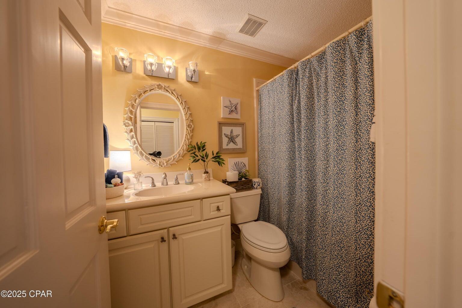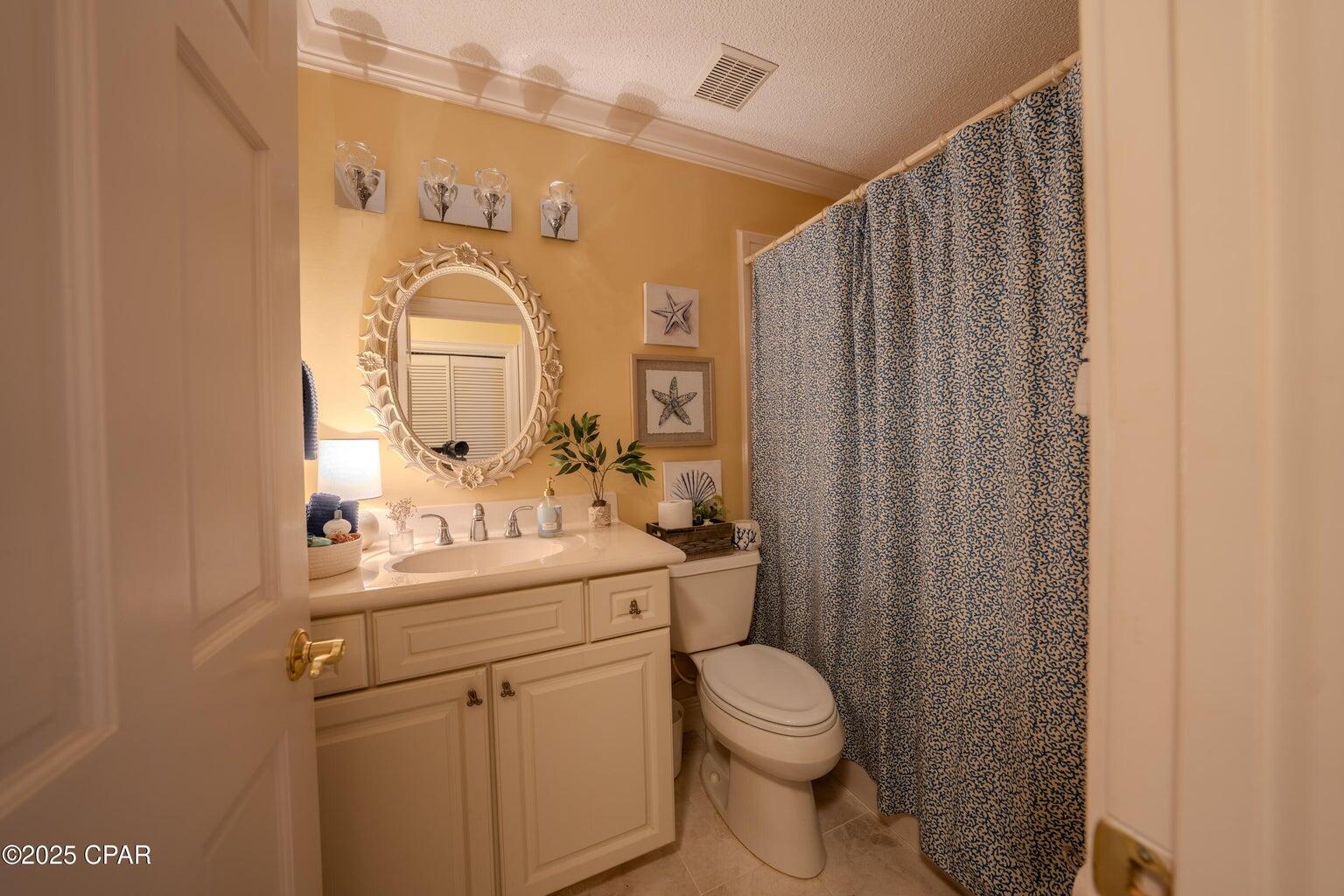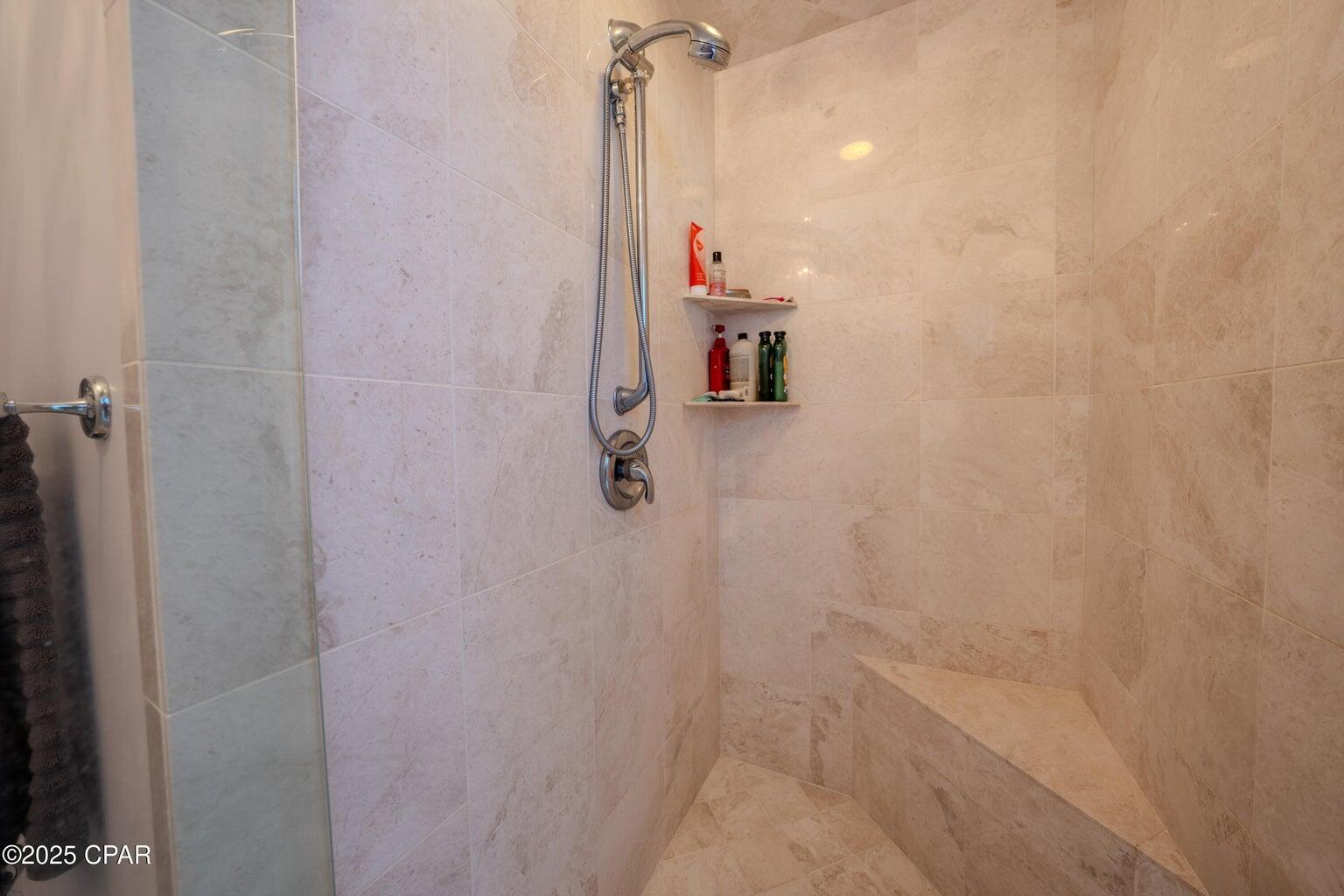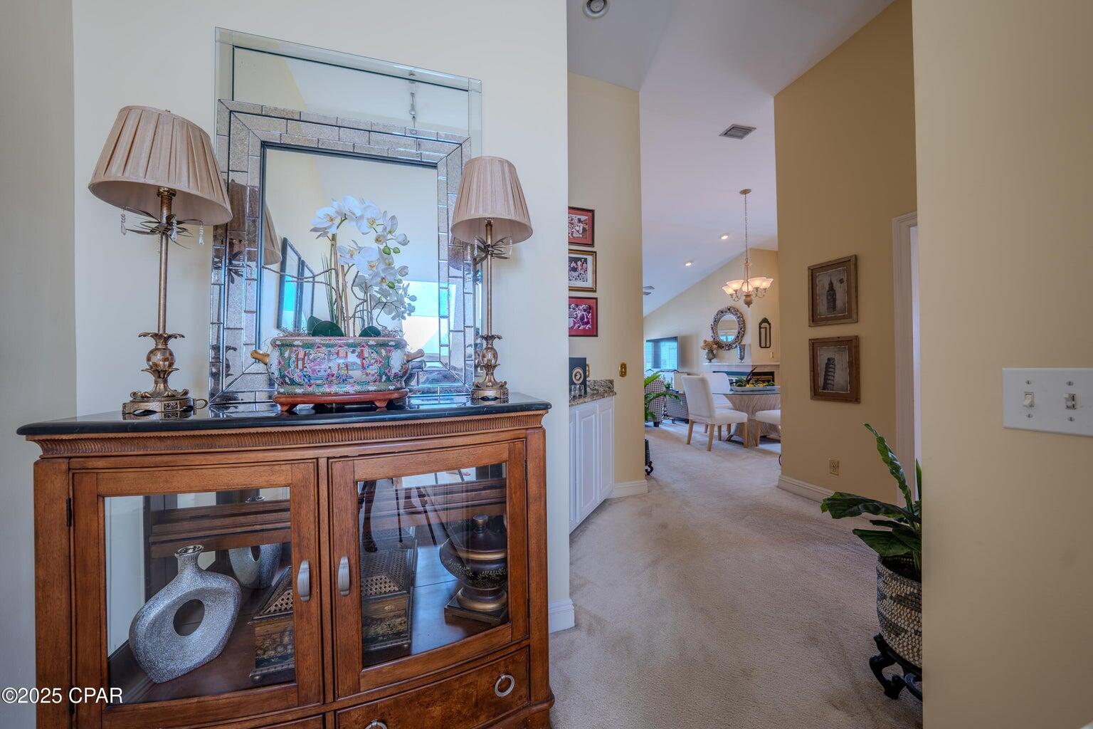 Absolutely gorgeous, 2BR/2BA at Marina Club Village--with direct views over the pool and deck and peeks of Grand Lagoon from both balconies. From the foyer, built-in bookcase/curio shelving set the tone. A dry bar adjoins the living/dining area. Throughout the home you'll find custom 3'' plantation shutters and abundant natural light. The light, airy kitchen features tile floors, updated countertops, cabinets, and sink, plus a mosaic glass tile backsplash. It opens to a cozy breakfast room with its own balcony and lagoon view--a perfect morning coffee spot. The living room offers high ceilings, a fireplace (ideal for electric logs), and large windows to the main balcony. A true split plan: the oversized guest bedroom sits opposite the private primary suite. The primary suite opens to the l large main balcony overlooking the pool and deck; its spacious bath includes double vanities, a separate jetted soaking tub and tiled shower, plus a large walk-in closet. Additional highlights: one-car garage, the unit has been wired for an in-home generator (located in the garage; configured to power most of the homeexcludes AC and stove), Community perks: residents' pool & sun deck, manicured grounds, and all the advantages of Bay Pointa guard-gated, golf-centric community with a Nicklaus-designed course, active clubs, and proximity to the full-service marina. Grocery, shopping, and some of the area's best restaurants are just outside the gates. Ideal as a full-time residence or coastal retreat.