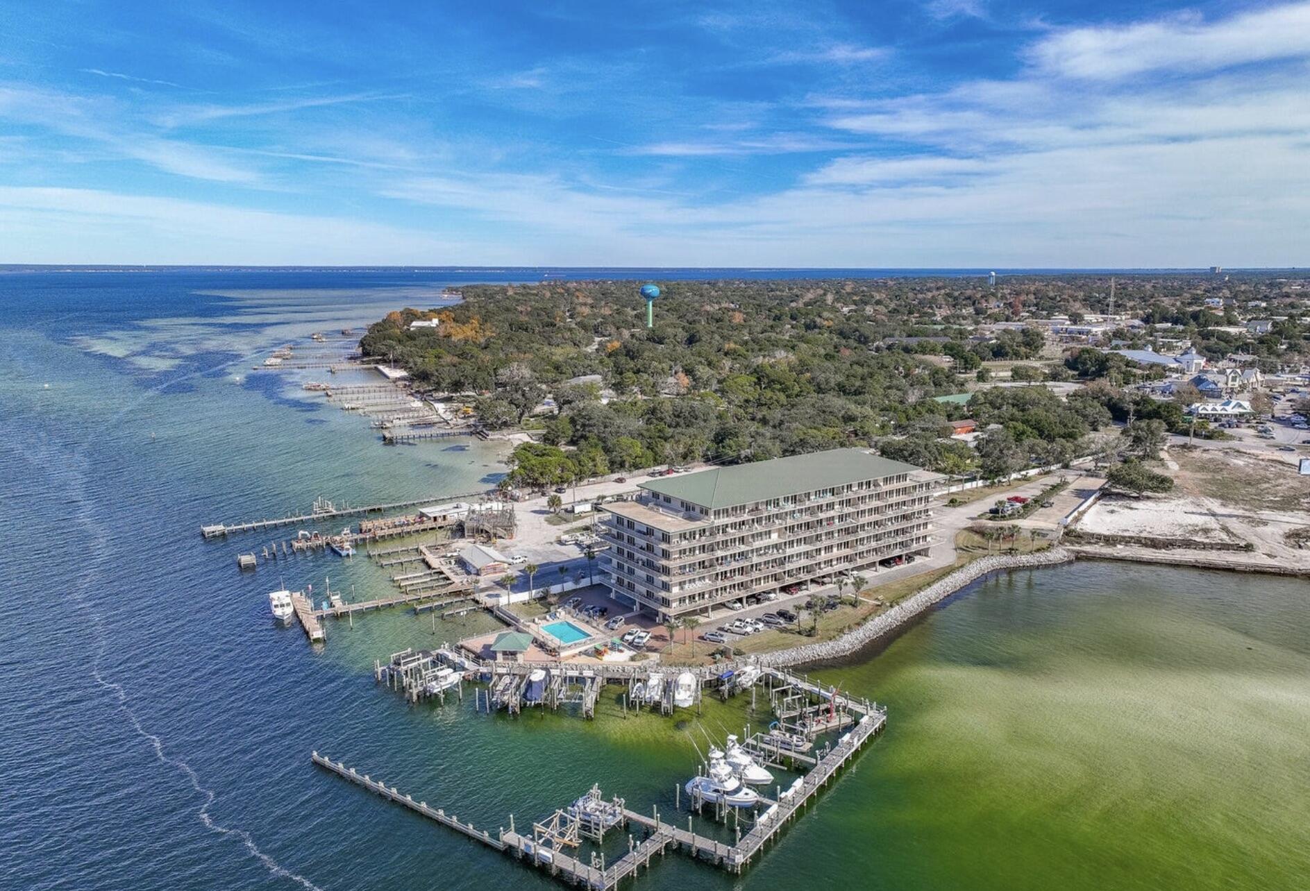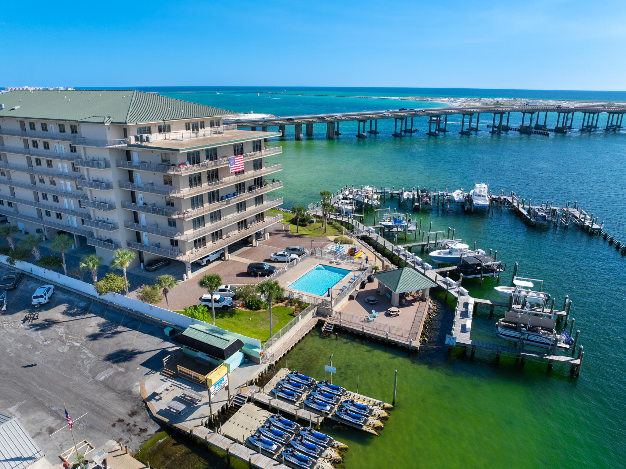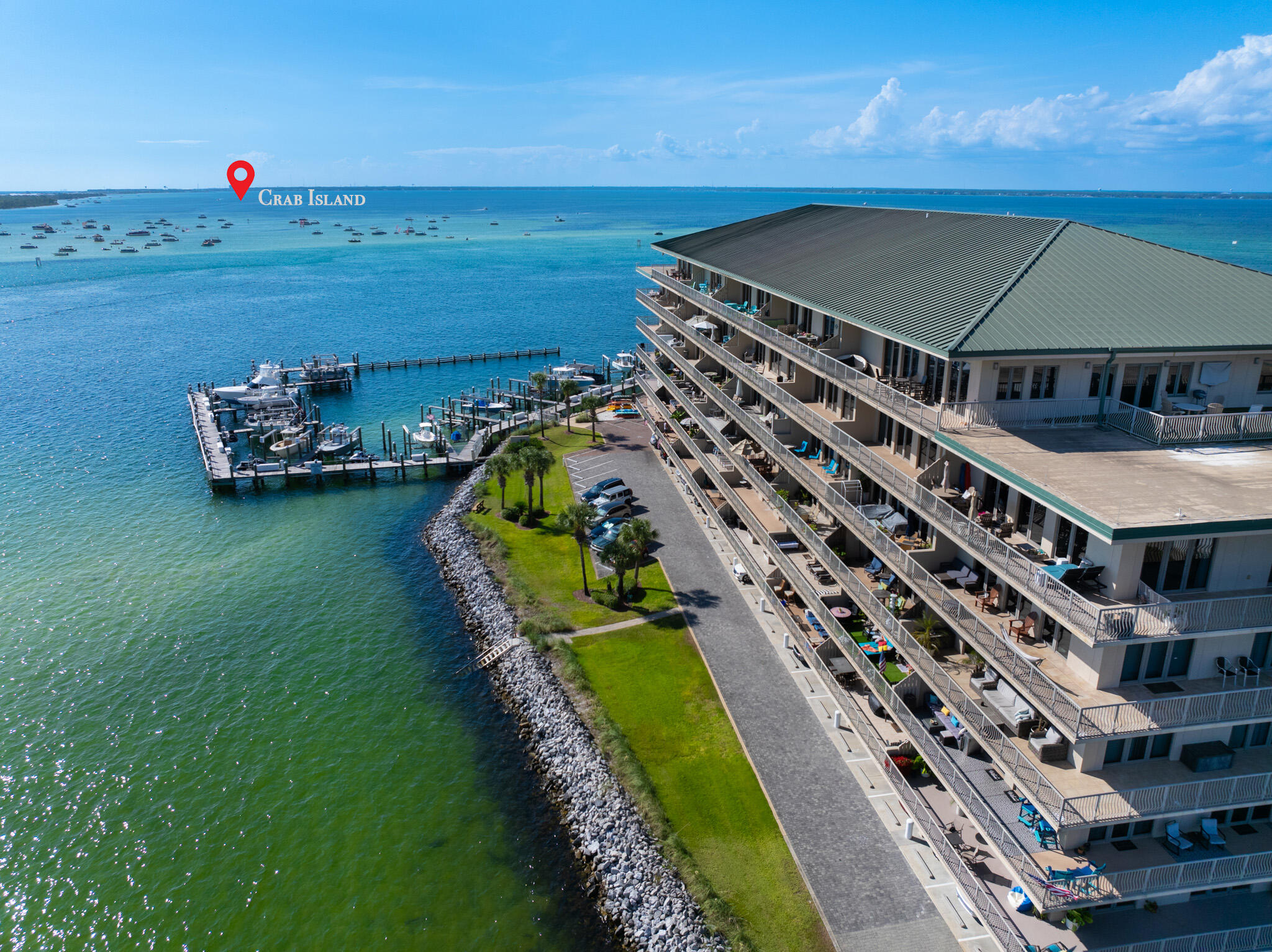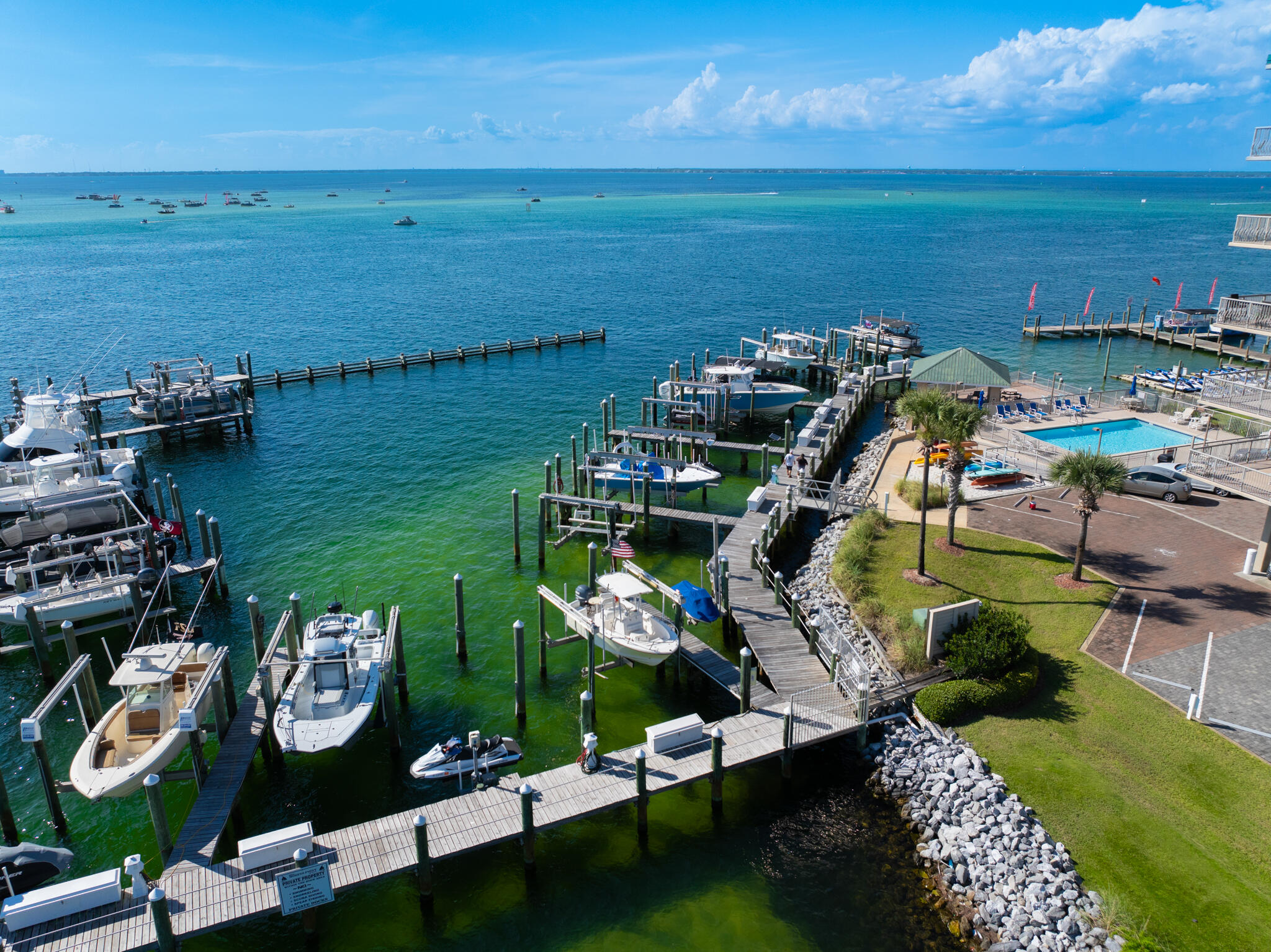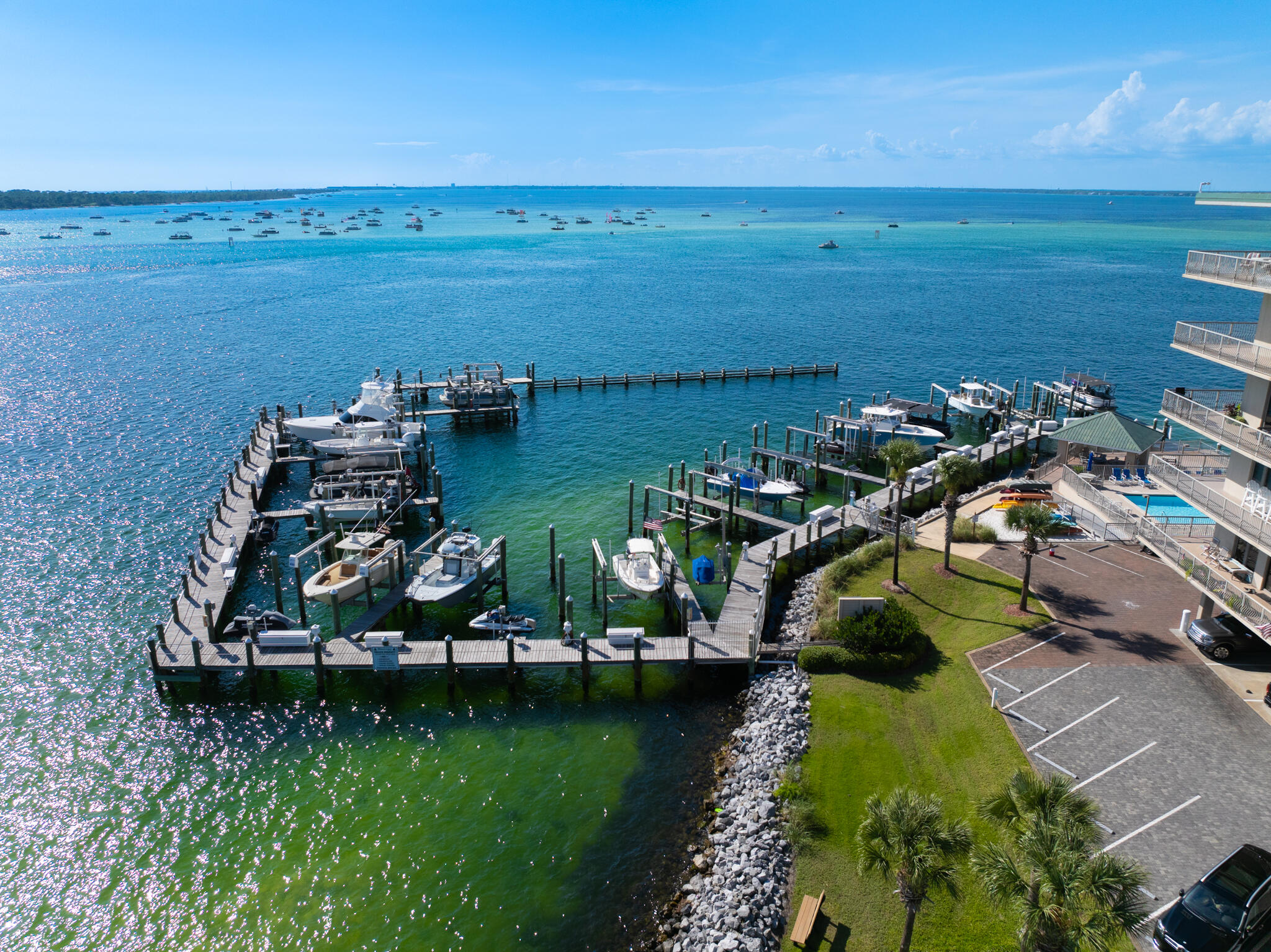Experience coastal living at its finest in this beautifully updated waterfront condo complete with a 30' deeded boat slip and a 12k lb lift, offering panoramic views of the Destin Harbor, East Pass, Crab Island and Gulf waters! Watch boats cruise by, dolphins play, and enjoy breathtaking sunsets right from your private balcony! Spacious 3 Bedroom/3 Bathroom with 2,196 square feet of stunning living space to include 10ft ceilings and 8ft doors throughout! Expansive floor-to-ceiling windows bring in natural light and frame the stunning water views. The open layout connects seamlessly to the balcony, perfect for indoor-outdoor living. Beautiful modern kitchen equipped with stainless steel appliances, double ovens, wine cooler, tons of custom cabinetry, granite countertops, and pantry space. A perfect breakfast bar is attached and offers additional seating and entertaining space. A formal dining area is open to the living space and is the ideal spot to have family dinners as you enjoy the breathtaking water views!