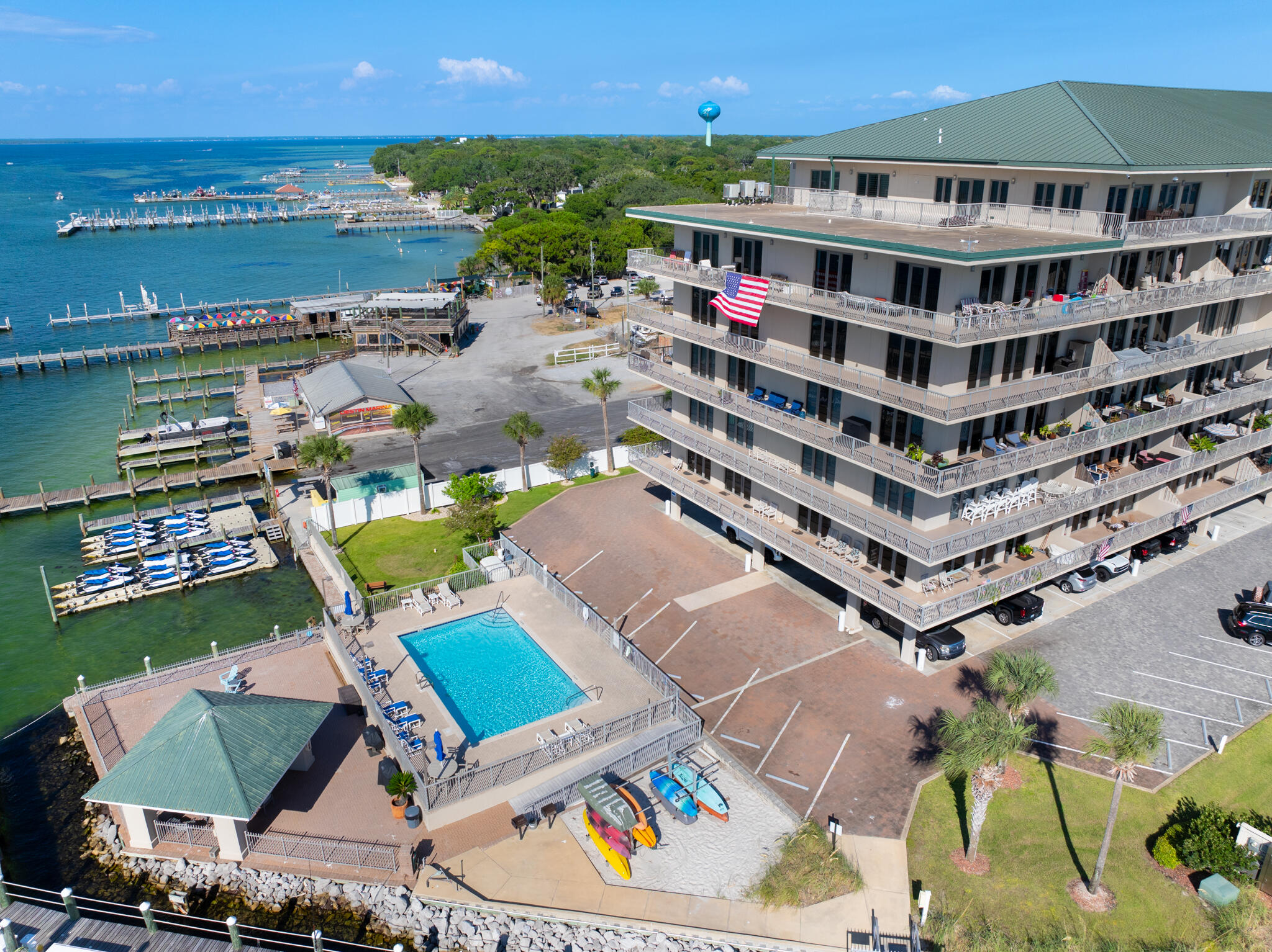 Heading west on Hwy 98 (Harbor Blvd.), left on Calhoun (just past McGuire's), and first left into driveway. Gated entrance requires a code.