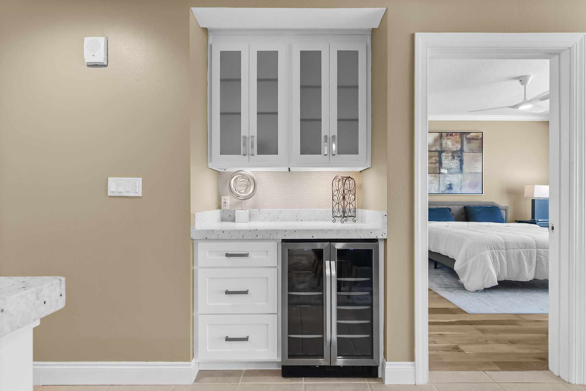 Adjacent to the kitchen, a recessed beverage center with a Danby Silhouette dual-door fridge is perfect for entertaining. The dining area showcases a solid wood table and chairs, while the living space invites relaxation with its leather sectional and custom floating media shelving beneath a mounted 65" TV. The primary suite is a serene retreat, complete with a king-size bed, padded headboard, solid wood furnishings with soft-close drawers, and breathtaking Gulf views. The en suite bathroom has been completely redesigned to include a double vanity and a spacious corner shower with both side and waterfall showerheads. A tucked-away laundry center with LG washer and dryer adds everyday convenience.