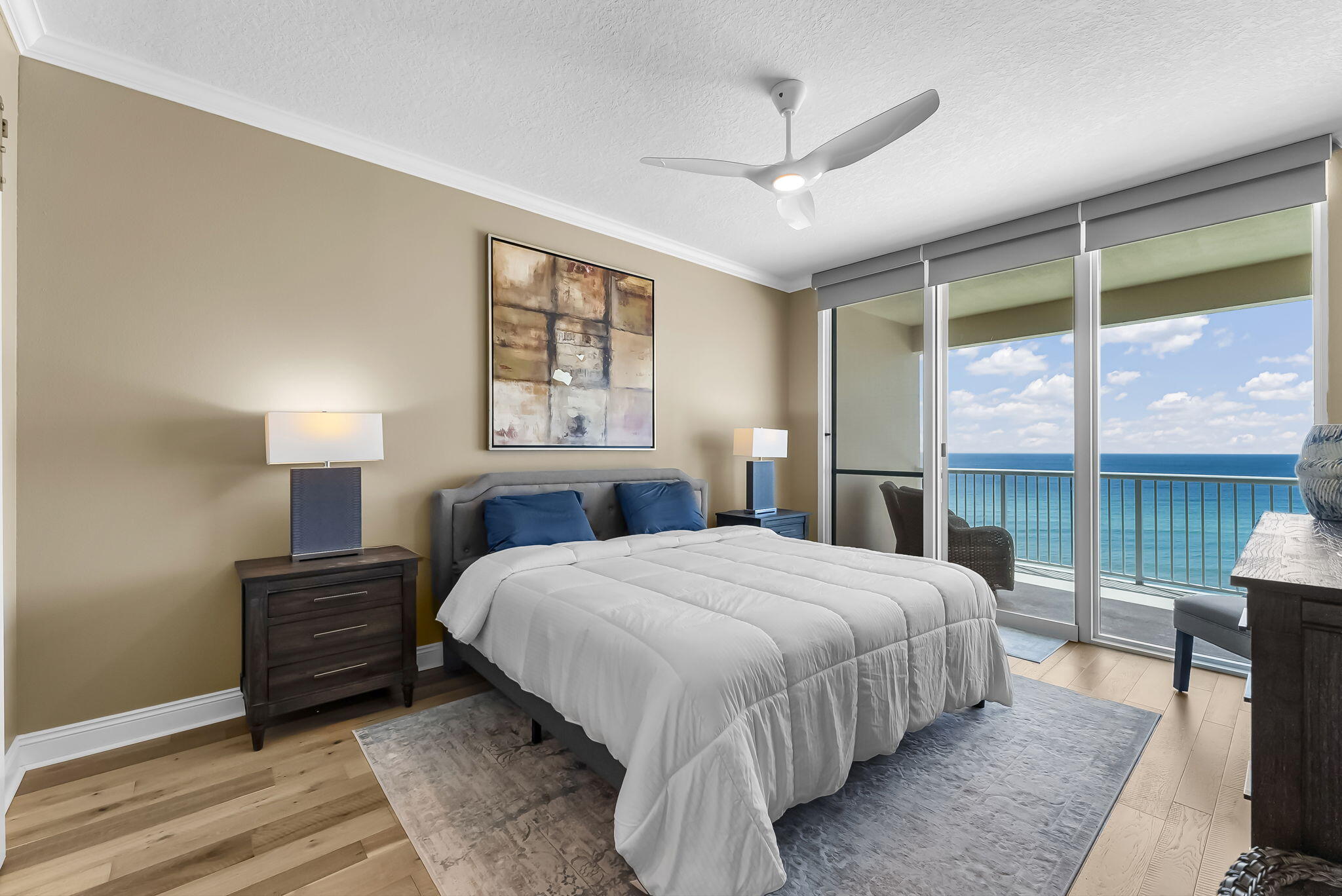 Looking for 30A-inspired living in Panama City Beach? Look no further than Palazzo 207--a beautifully updated 3-bedroom, 3-bathroom Gulf-front condo that combines luxury, comfort, and convenience in one exceptional package. Ideally situated just yards from the second-floor fitness center, this unit has been thoughtfully reimagined from front door to balcony. As you enter, you're welcomed by a striking combination of tile and Bella Cera luxury wood floors that guide you through the open, light-filled space. Floor-to-ceiling windows draw your gaze to the balcony, where expansive Gulf views create the perfect backdrop for coastal living. The layout is as functional as it is stylish. One guest suite offers a private en suite bath--perfect for visitors. While a second bedroom features a trundle bed for additional flexibility. A reimagined storage area with frosted glass doors adds a modern, practical touch. The kitchen is a true showpiece, featuring white shaker cabinetry with soft-close doors and drawers, double-thick granite countertops, a farm-style sink, and high-end stainless steel appliances, including a GE WiFi-enabled cooktop and oven. There's even a Whirlpool trash compactor for added convenience.