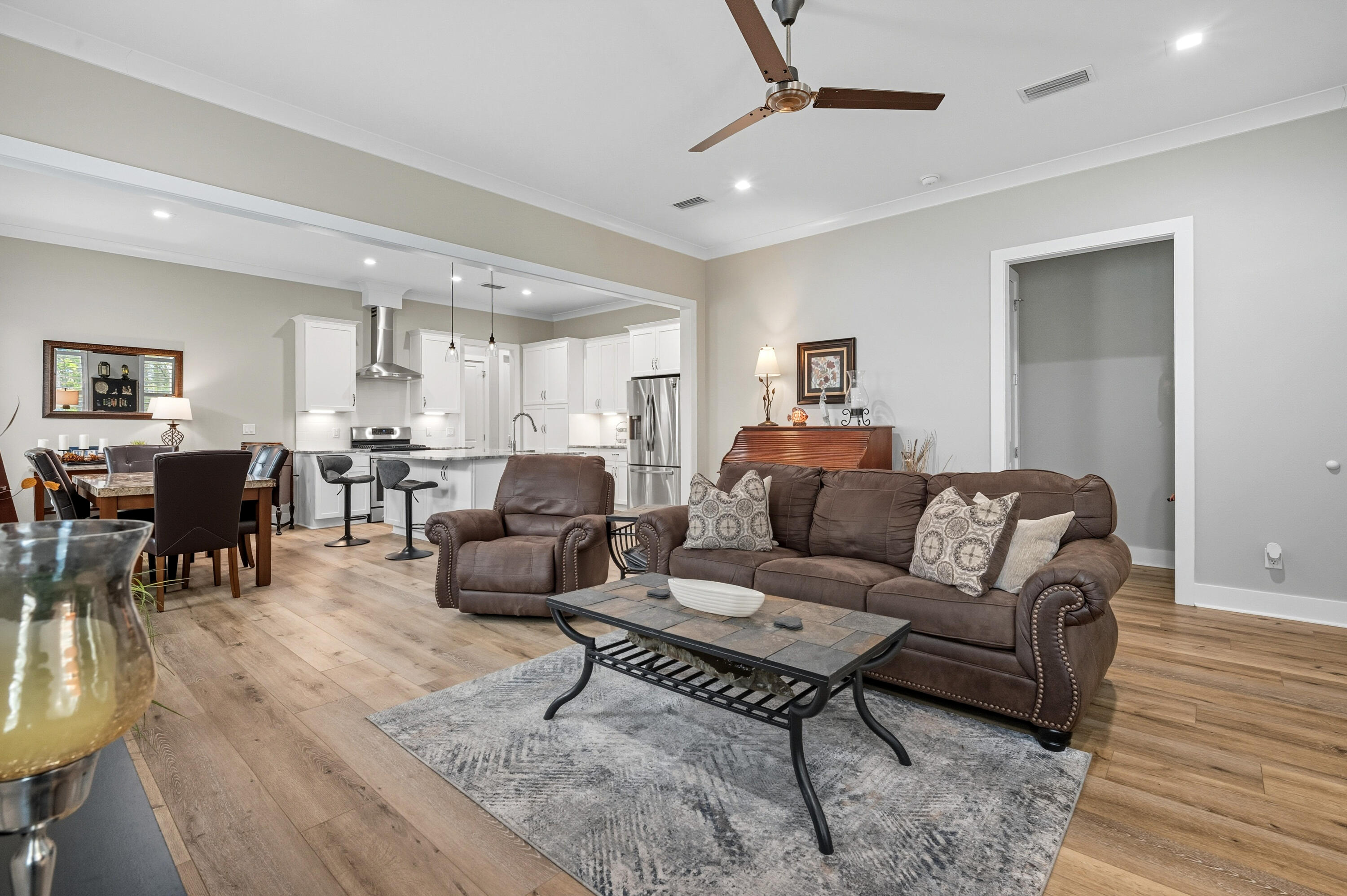 Welcome to your dream home in Niceville's most sought-after new community--Deer Moss Creek! This Craftsman-style park-front home offers 3 bedrooms, 2 full bathrooms, and a spacious 3-car garage, all thoughtfully built by an award-winning builder known for exceptional quality and low-maintenance living. Step inside to an open-concept floor plan filled with natural light and finished with luxury vinyl plank flooring throughout. The kitchen features elegant granite countertops, stainless-steel appliances, and a layout perfect for both cooking and entertaining. With impact-resistant windows and doors and ceiling fans in the living room and all bedrooms, comfort and peace of mind are built right in.The 3-car garage offers ample room for vehicles, storage, or even a home gym or hobby space. Outside your door, enjoy the unmatched lifestyle of Deer Moss Creeka master-planned community designed around the area's natural beauty, including scenic creeks, wetlands, and a full trail system. The 8'-10' wide paved trails wind throughout the neighborhoods and connect seamlessly to a stunning array of already completed amenities, including a resort-style community pool, clubhouse, pergola, bike paths and half basketball court. Whether you're biking along Deer Moss Loop's dedicated lane or strolling the 5' wide sidewalks, the entire neighborhood promotes a connected community lifestyle.