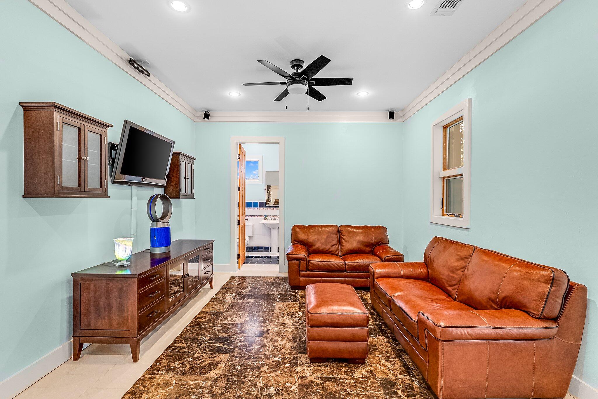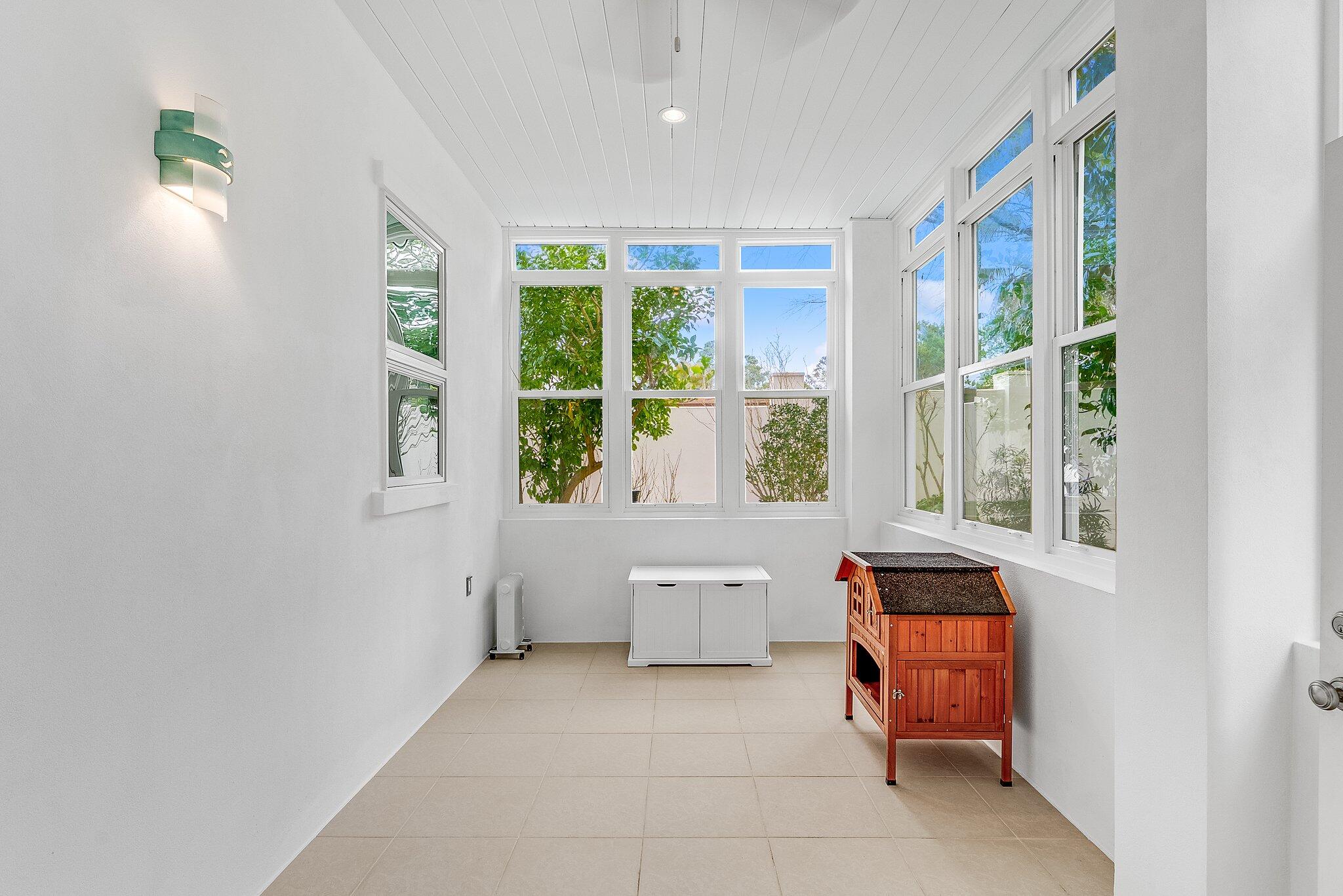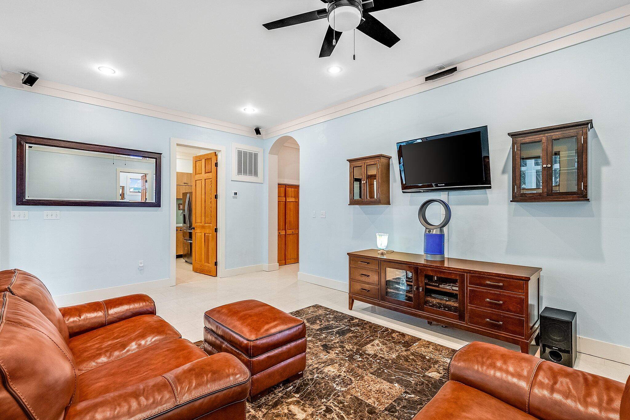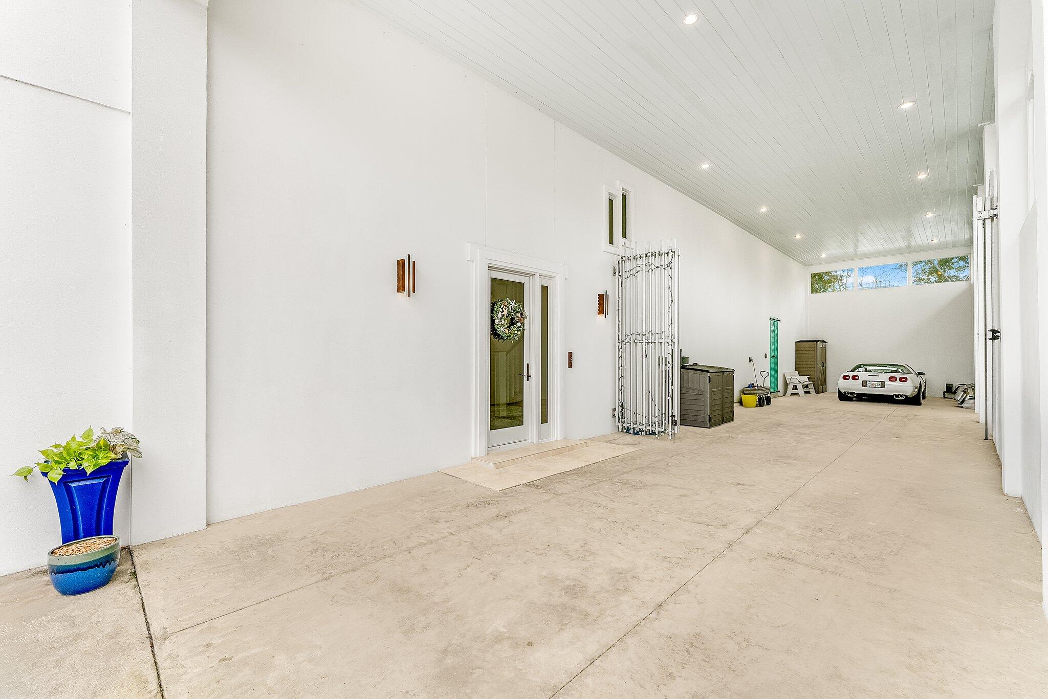 The 9-foot garage doors accommodate large SUVs, while the porte cochère (65' x 15' x 16' high) is equipped with water, sewer, 50 amp, 30 amp, multiple 15/20 amp outlets, recessed lighting, and Miami-Dade rated windows. This space can be converted into a carriage house or host a swim spa and sauna. The south-facing stacked porches, enclosed in 2018, added 960 sq. ft. of heated/cooled space with porcelain floors and wood-planked ceilings. A 60 sq. ft. pet/craft room was also added, featuring an Andersen impact awning window and two French doors, one leading to the garage and the other to an enclosed porch with an outdoor shower. In total, the home offers over 5,000 sq. ft. of heated/cooled living space and 7,037 sq. ft. under roof.
