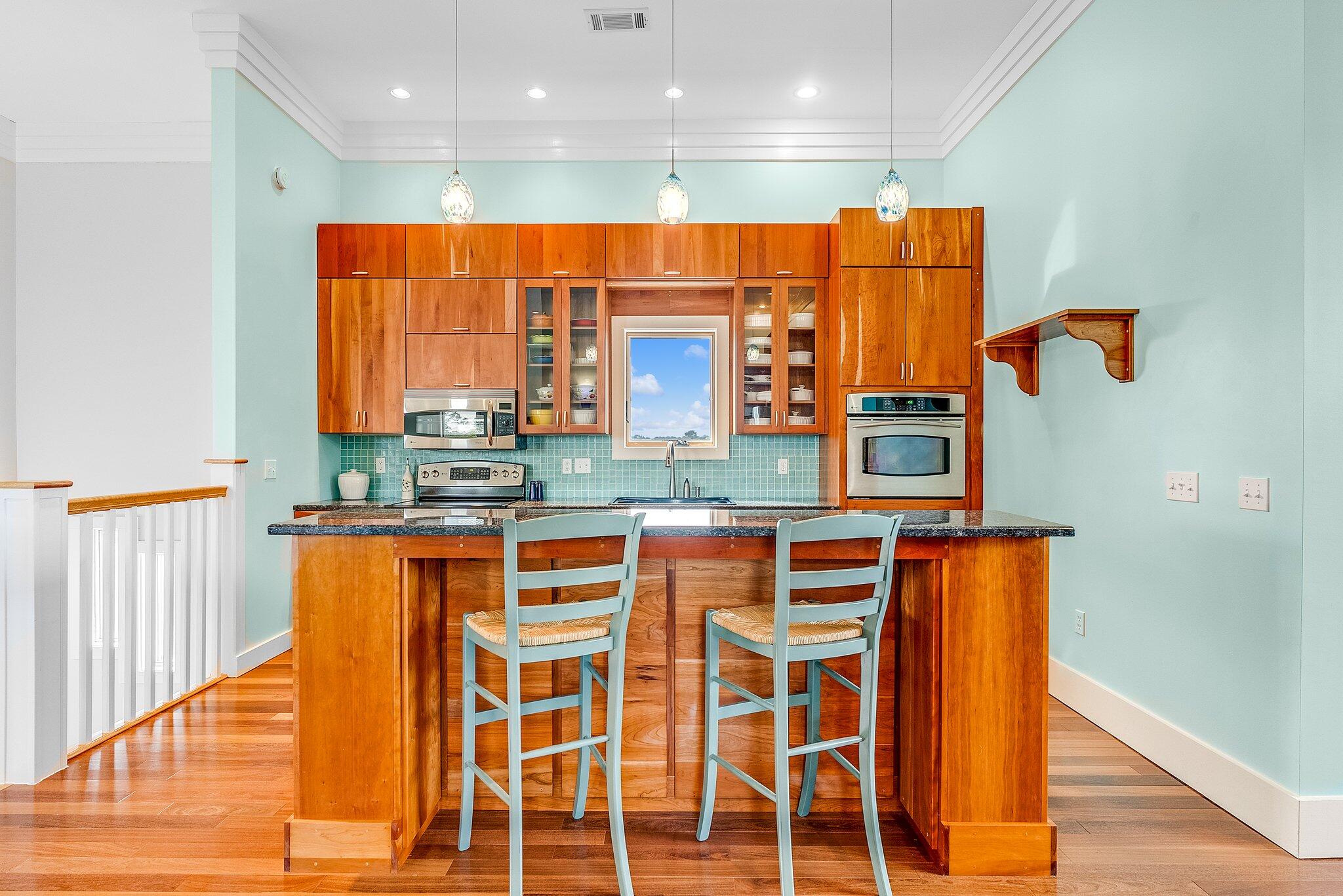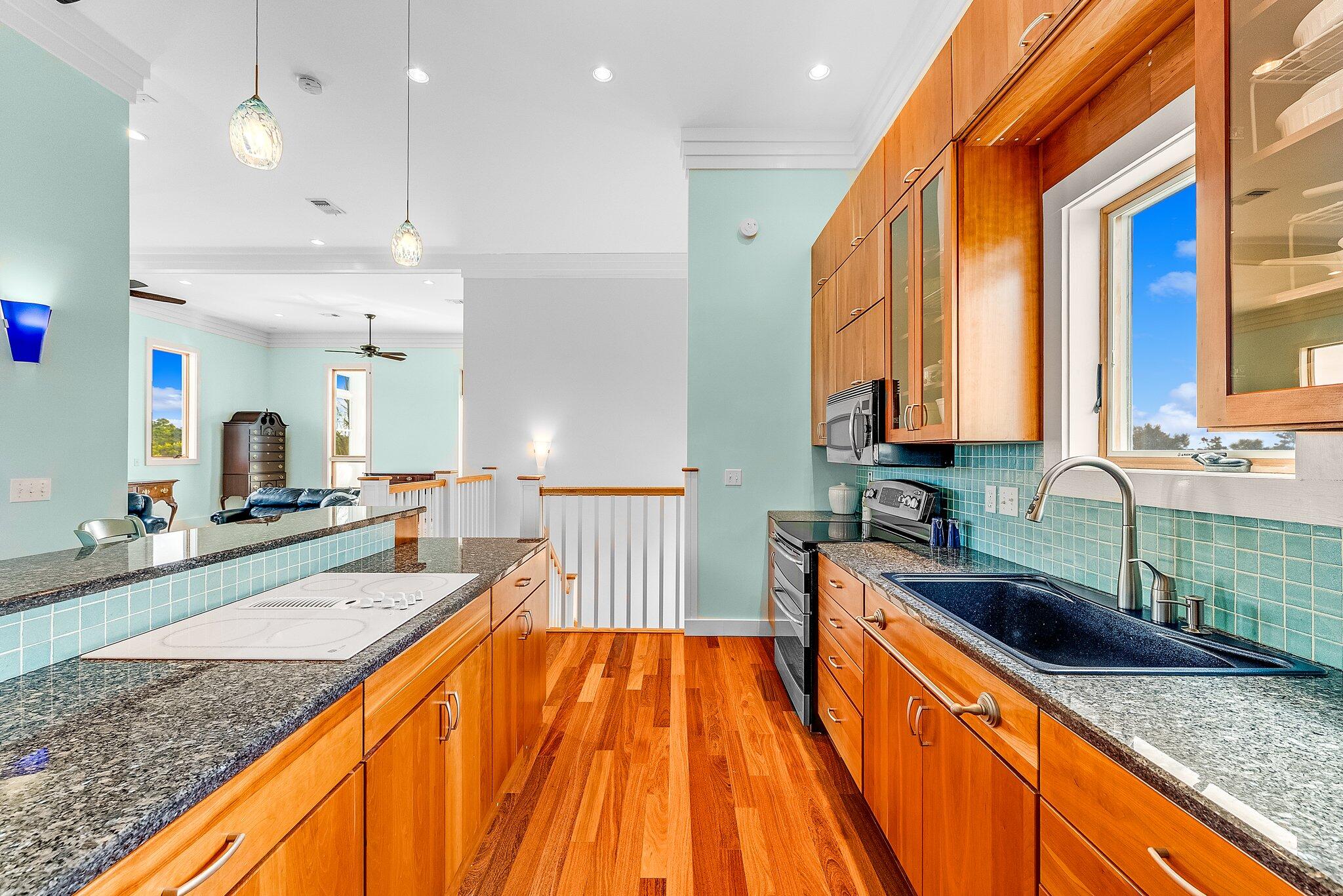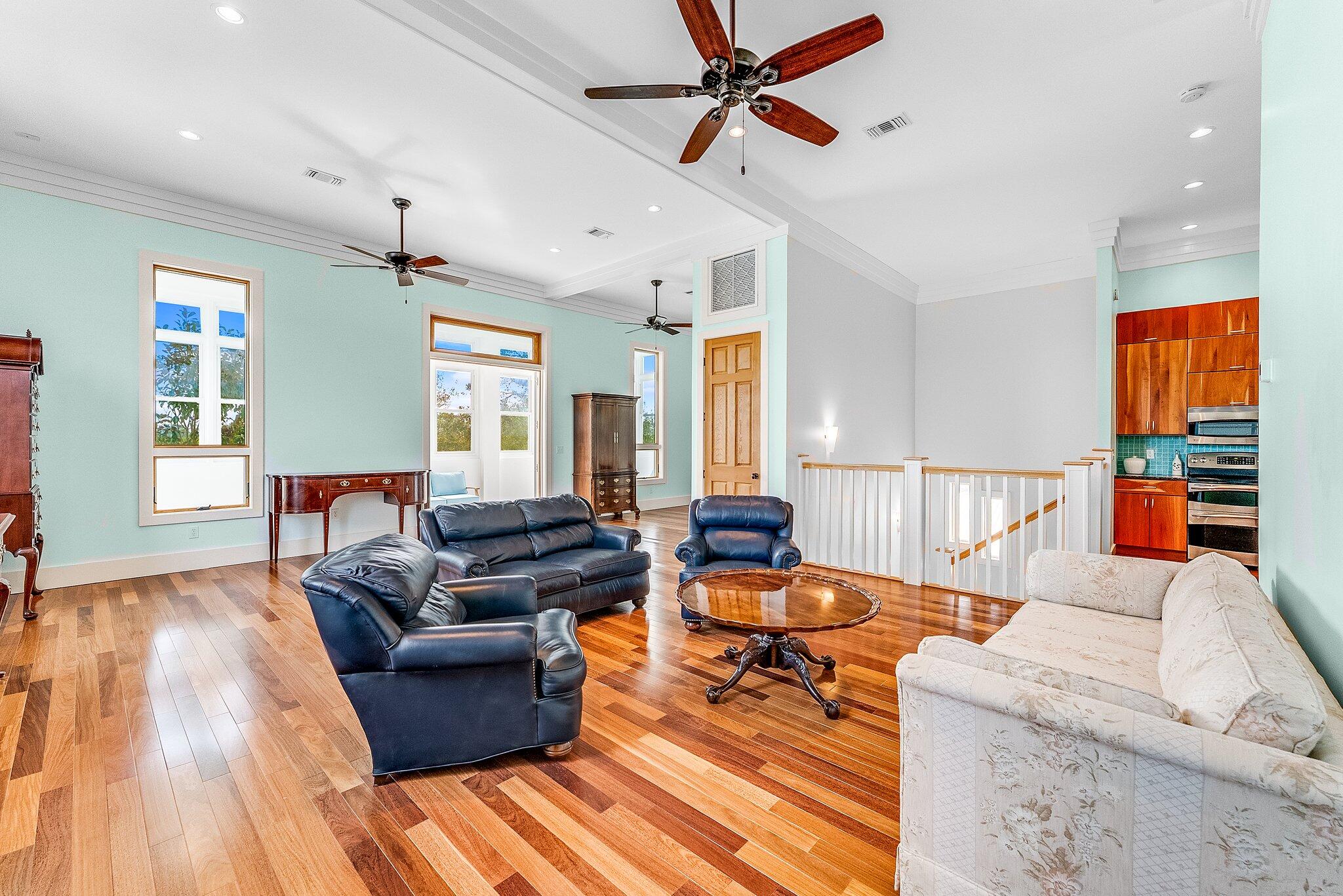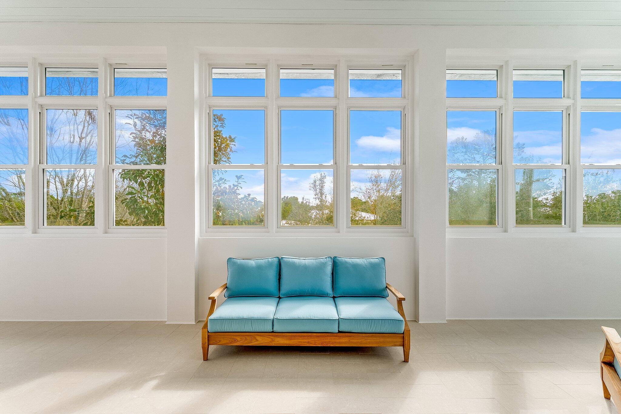 Architecturally unique, the home features a reverse floor plan, perfect for smaller lots in beach communities. The third floor spans 2,100 sq. ft., maximizing space and offering a distinct living experience. With 12-foot ceilings, the living area feels massive, open, and airy while remaining private at the treetop level. The 8- and 10-foot windows and 10-foot double French doors (no window treatments needed), combined with the three-sided glass sun porch, provide abundant natural light and unobstructed views of unparalleled sunrises and sunsets. Luxury finishes include floor-to-ceiling solid cherry cabinetry in the chef's double kitchen and butler's pantry, plus a stylish half bath with a Kohler octagonal sink.