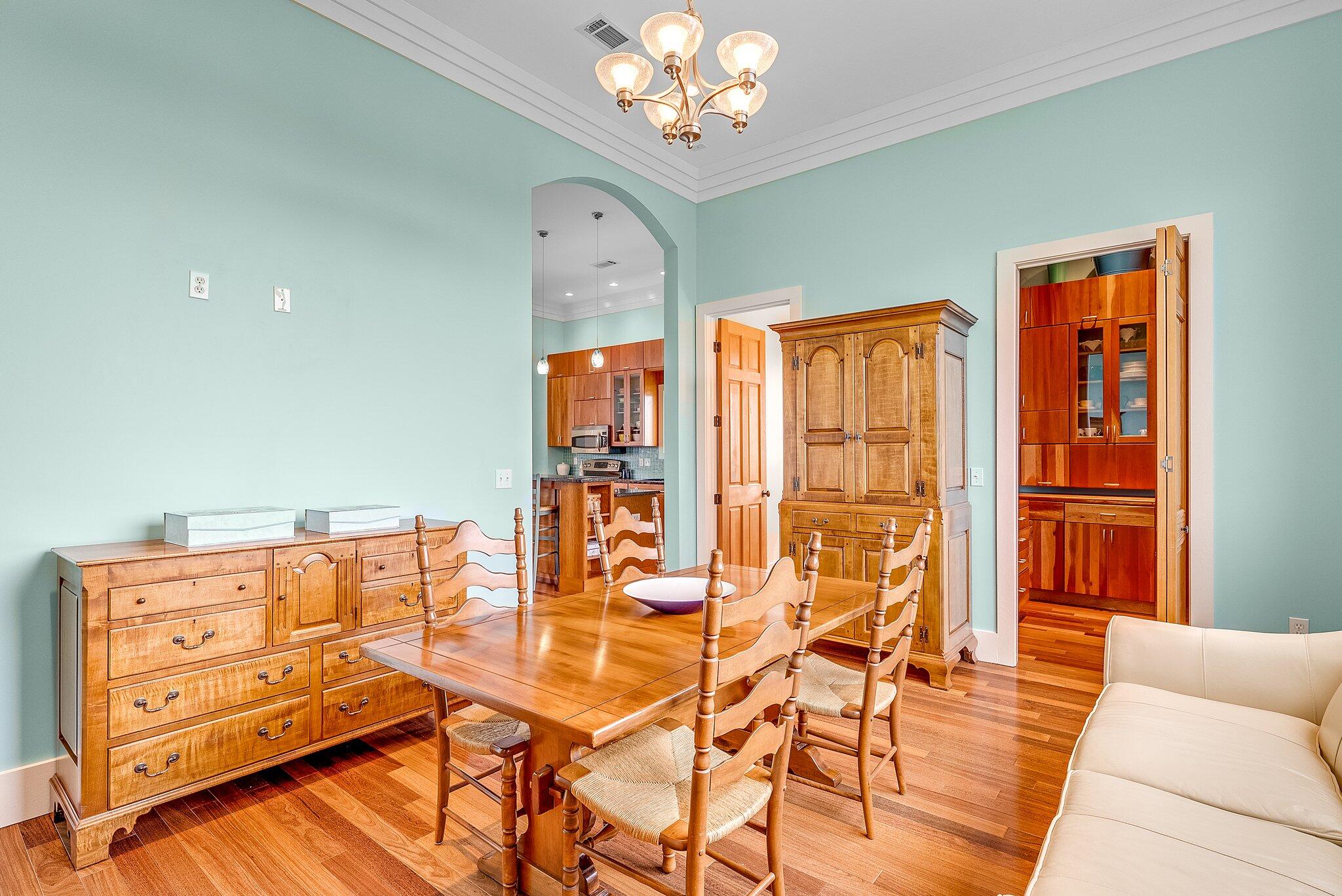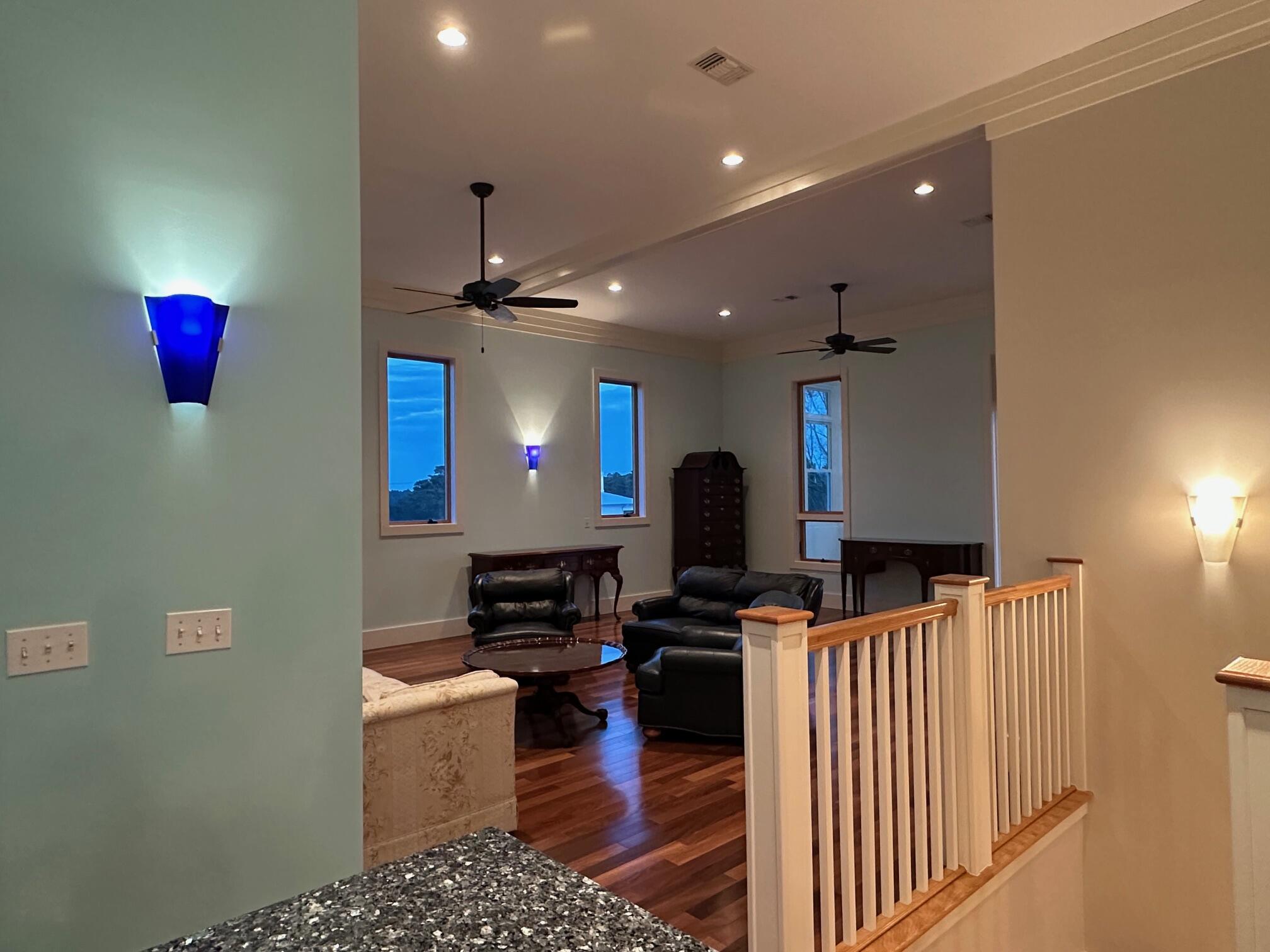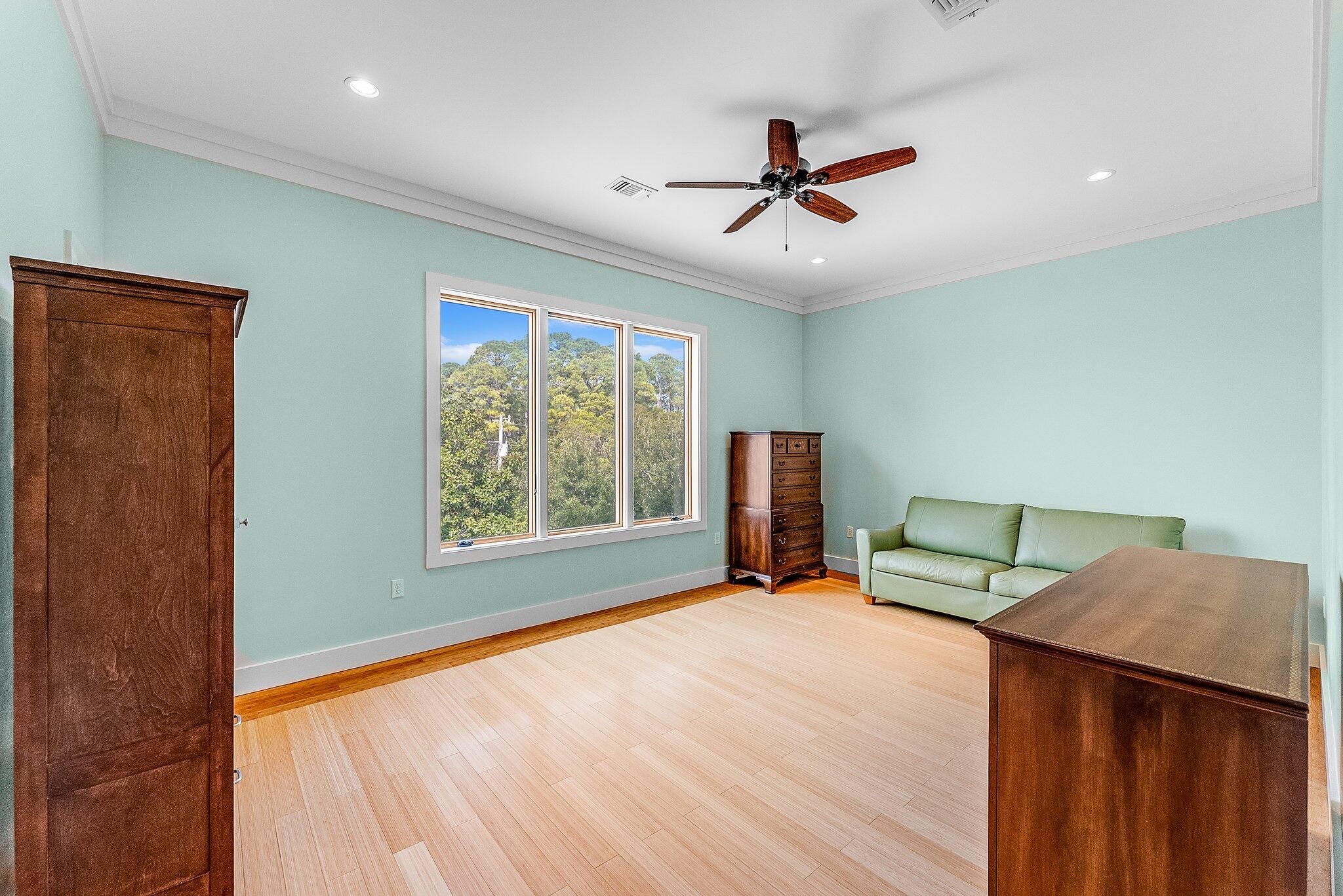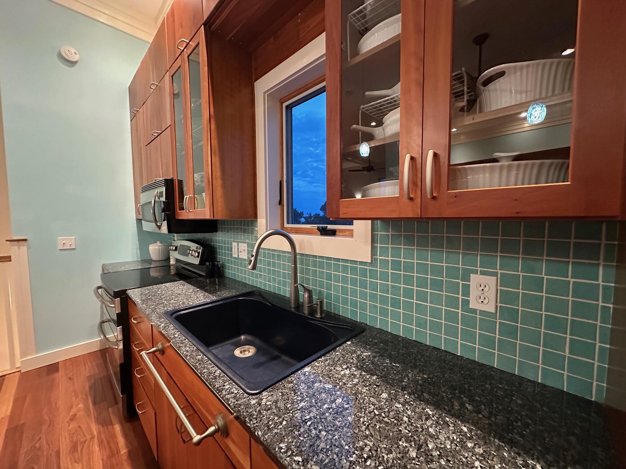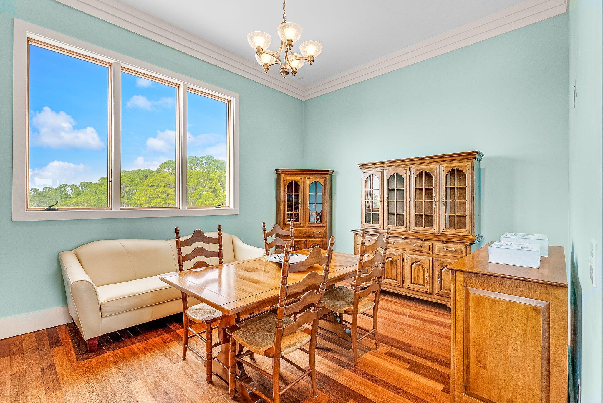 Architecturally unique, the home features a reverse floor plan, perfect for smaller lots in beach communities. The third floor spans 2,100 sq. ft., maximizing space and offering a distinct living experience. With 12-foot ceilings, the living area feels massive, open, and airy while remaining private at the treetop level. The 8- and 10-foot windows and 10-foot double French doors (no window treatments needed), combined with the three-sided glass sun porch, provide abundant natural light and unobstructed views of unparalleled sunrises and sunsets. Luxury finishes include floor-to-ceiling solid cherry cabinetry in the chef's double kitchen and butler's pantry, plus a stylish half bath with a Kohler octagonal sink.