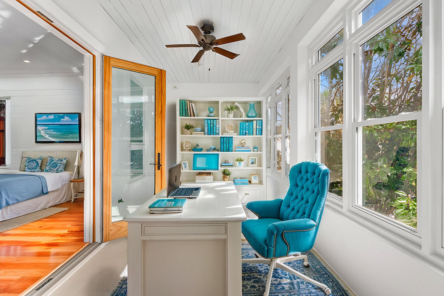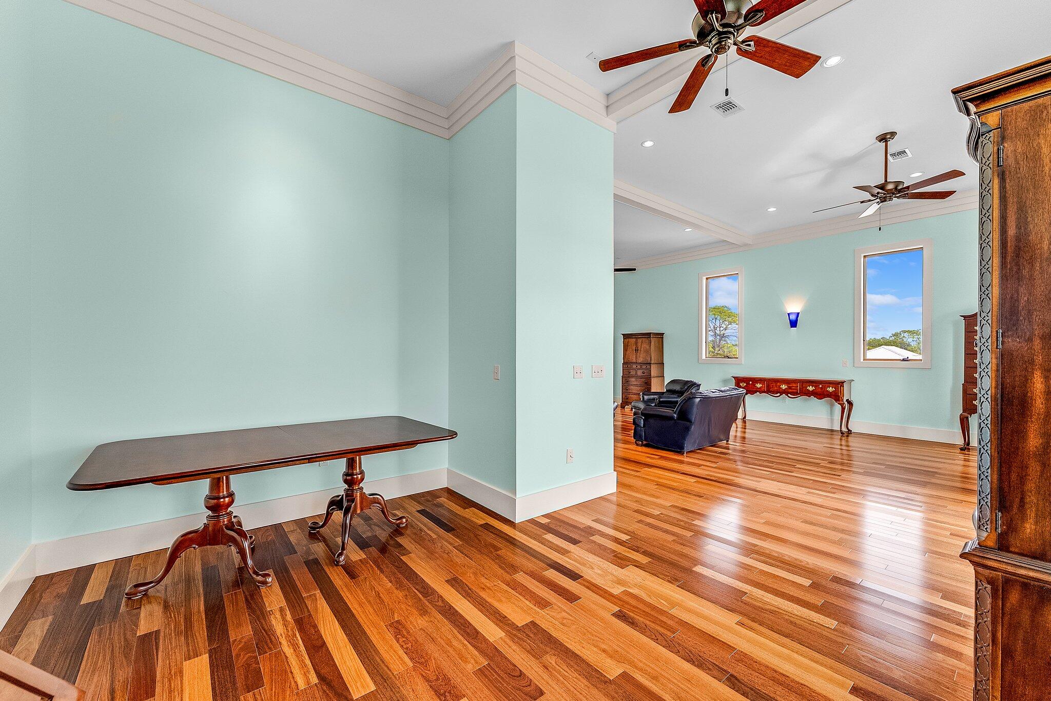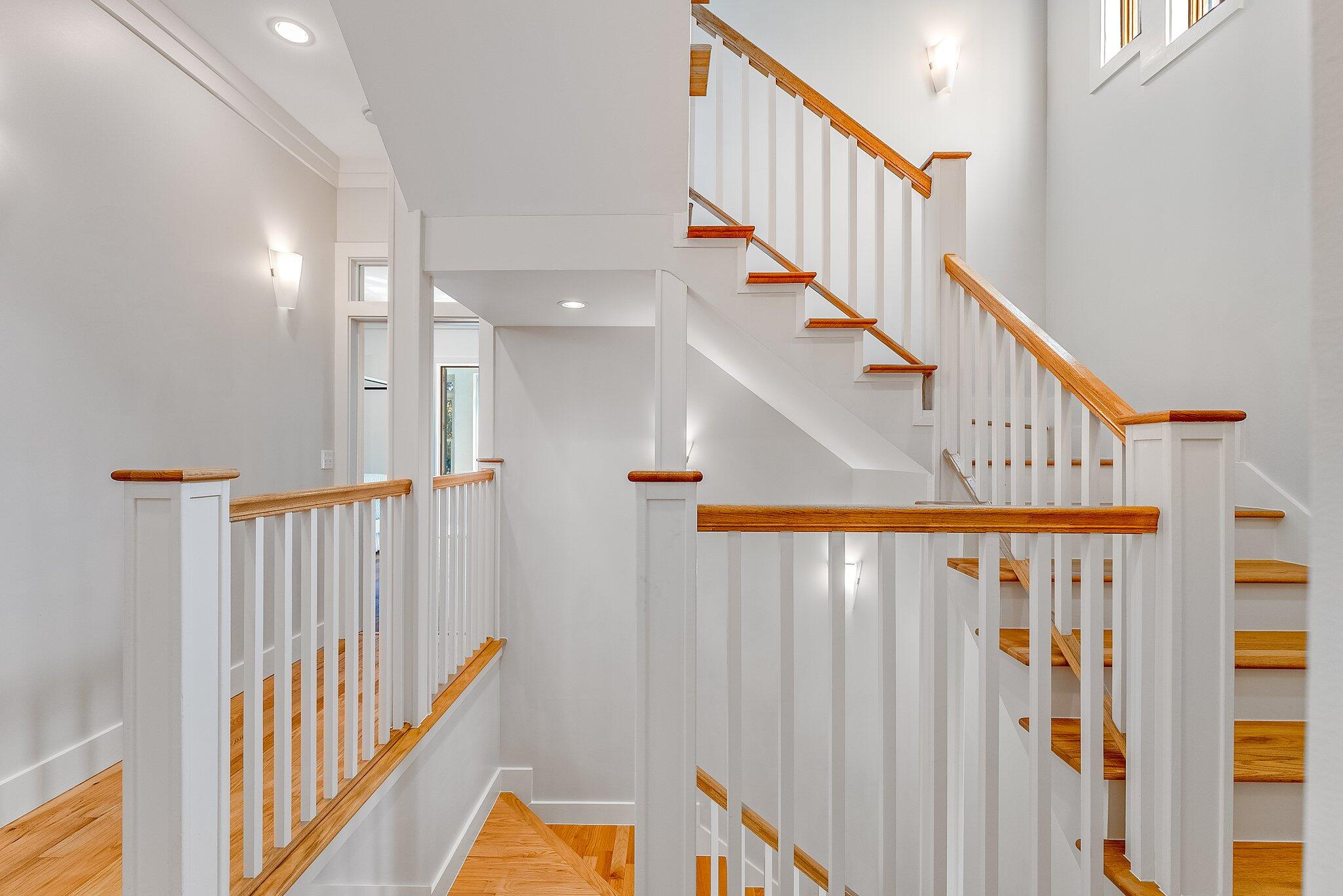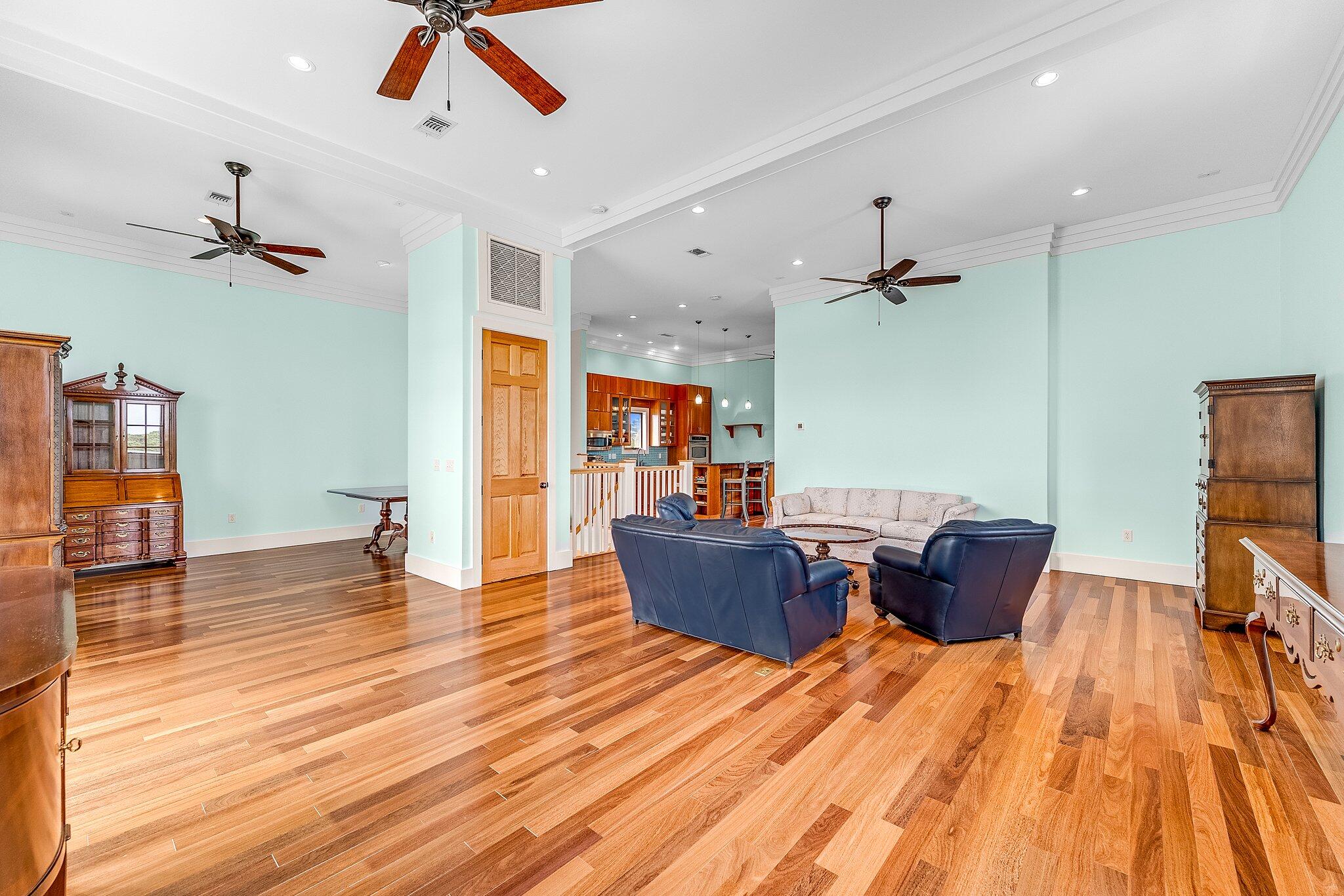 Architecturally unique, the home features a reverse floor plan, perfect for smaller lots in beach communities. The third floor spans 2,100 sq. ft., maximizing space and offering a distinct living experience. With 12-foot ceilings, the living area feels massive, open, and airy while remaining private at the treetop level. The 8- and 10-foot windows and 10-foot double French doors (no window treatments needed), combined with the three-sided glass sun porch, provide abundant natural light and unobstructed views of unparalleled sunrises and sunsets. Luxury finishes include floor-to-ceiling solid cherry cabinetry in the chef's double kitchen and butler's pantry, plus a stylish half bath with a Kohler octagonal sink.