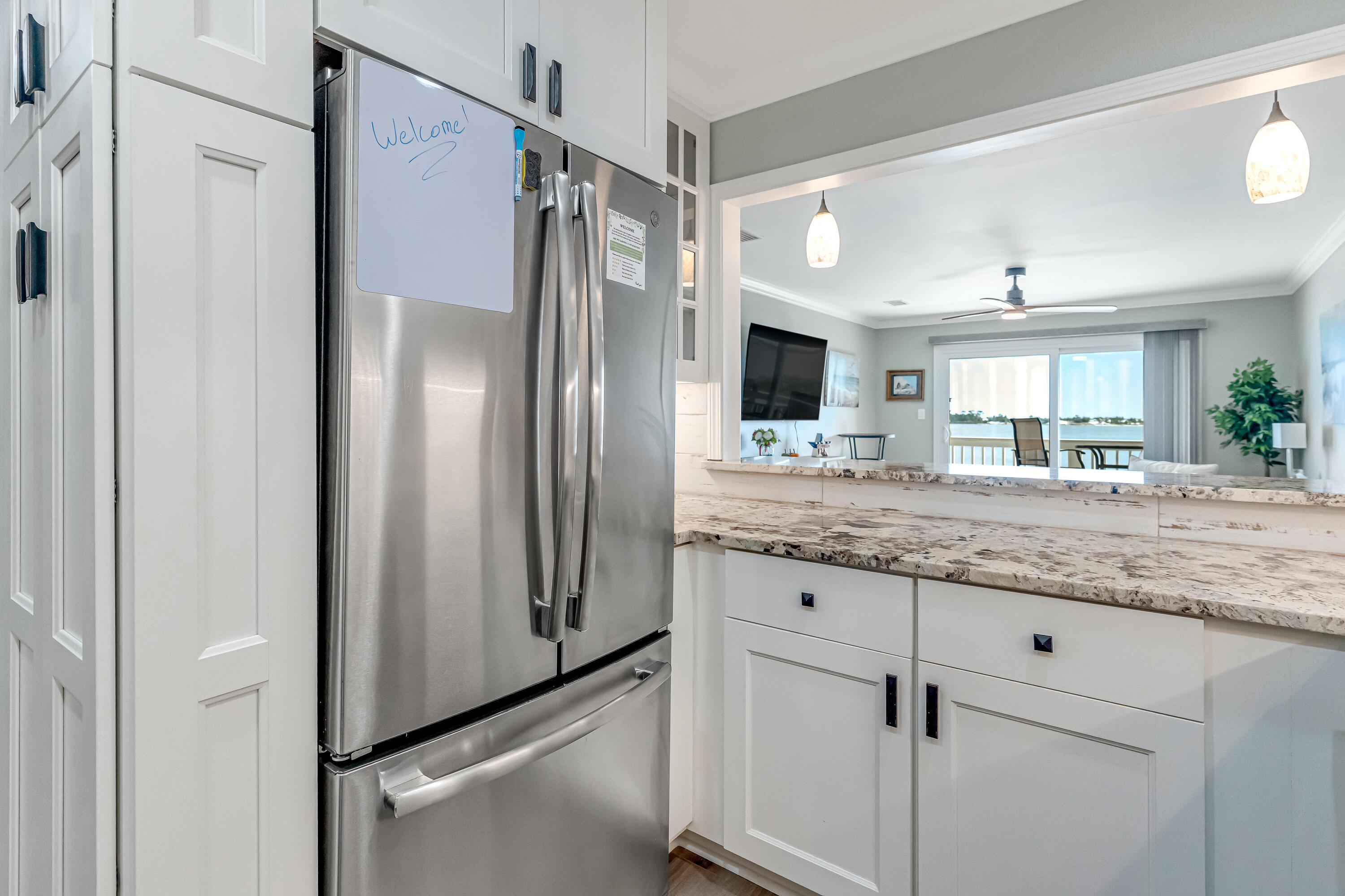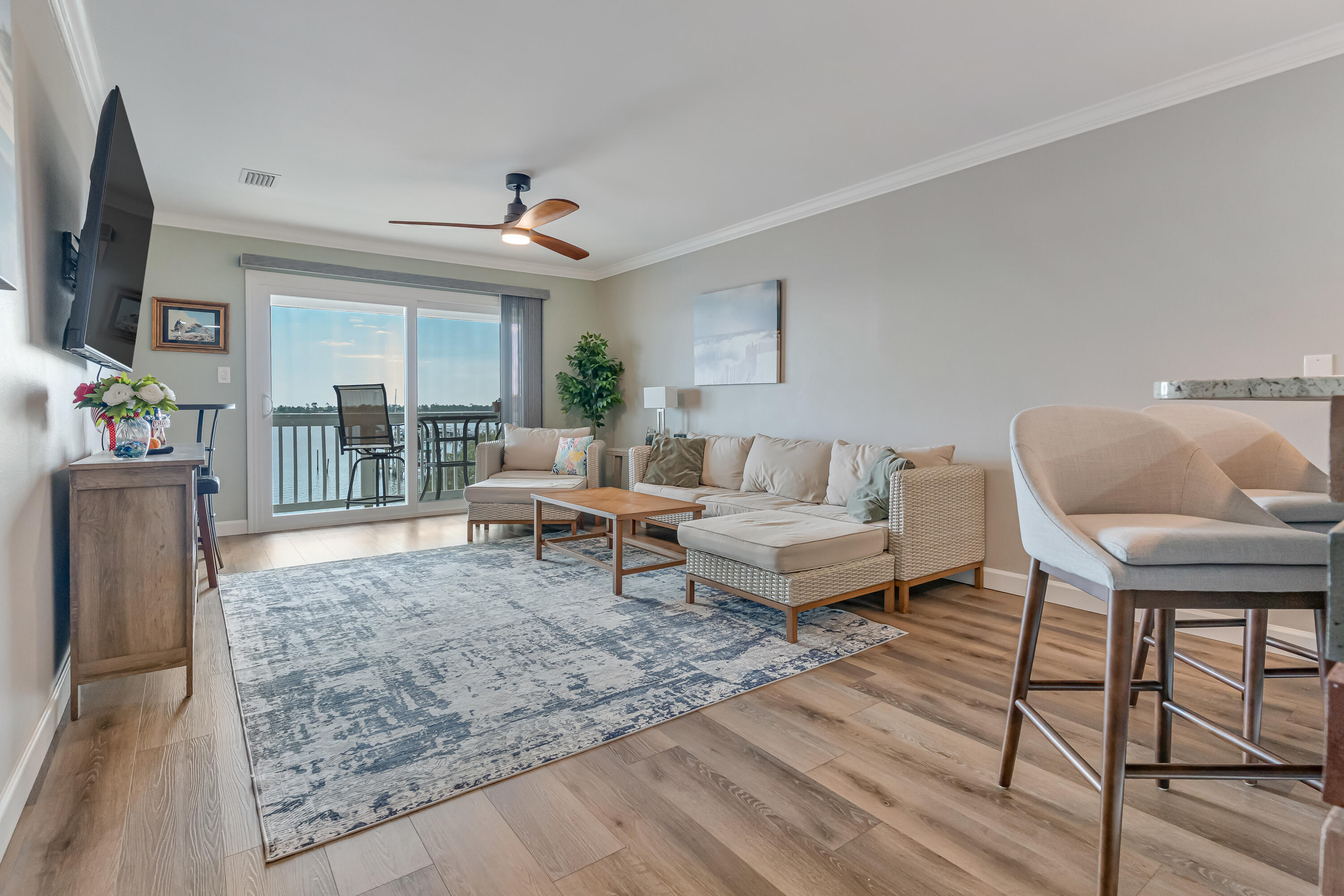 This meticulously remodeled and fully furnished three-bedroom, two-bath condominium on the third floor exemplifies resort-style living. The residence has been designed for contemporary comfort and sophistication, featuring new flooring, fresh paint, and a comprehensive upgrade of the HVAC system, air ducts, insulation, lighting, switches, and outlets to optimise efficiency and ensure peace of mind. The chef's kitchen is fitted with soft-close cabinetry, granite countertops, and a stylish tile backsplash, all positioned to provide impressive views of the Santa Rosa Sound and barrier island. Additional amenities include a high-end reverse osmosis five-filter water filtration system and a fully equipped laundry area with washer and dryer. Residents will appreciate the inclusion of two smart TVs and spacious living and bedroom areas, which offer both comfort and luxury. Further enhancements such as upgraded attic insulation, modern lighting fixtures, and advanced electrical components contribute to safety and energy efficiency. Offering a seamless blend of contemporary updates and breathtaking scenery, this move-in-ready condominium is ideally suited for use as a permanent home, vacation retreat, or investment property. It represents an exceptional opportunity to enjoy comfort, style, and panoramic views. Boat slips available with a $125 yearly fee. Space for boat storage or trailer in grassy area off the parking lot for building, and also outdoor storage #2 for all your water activities ect.