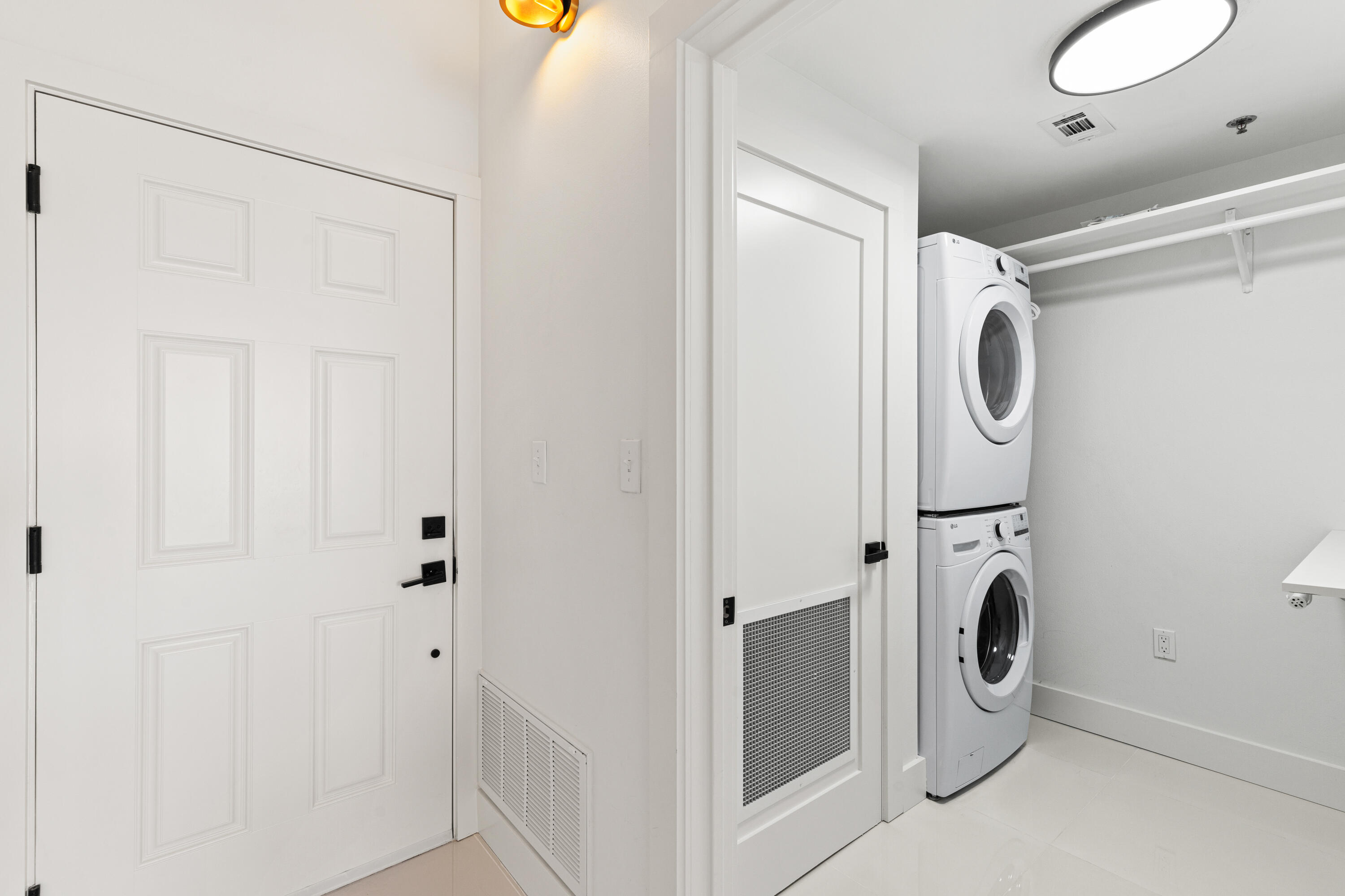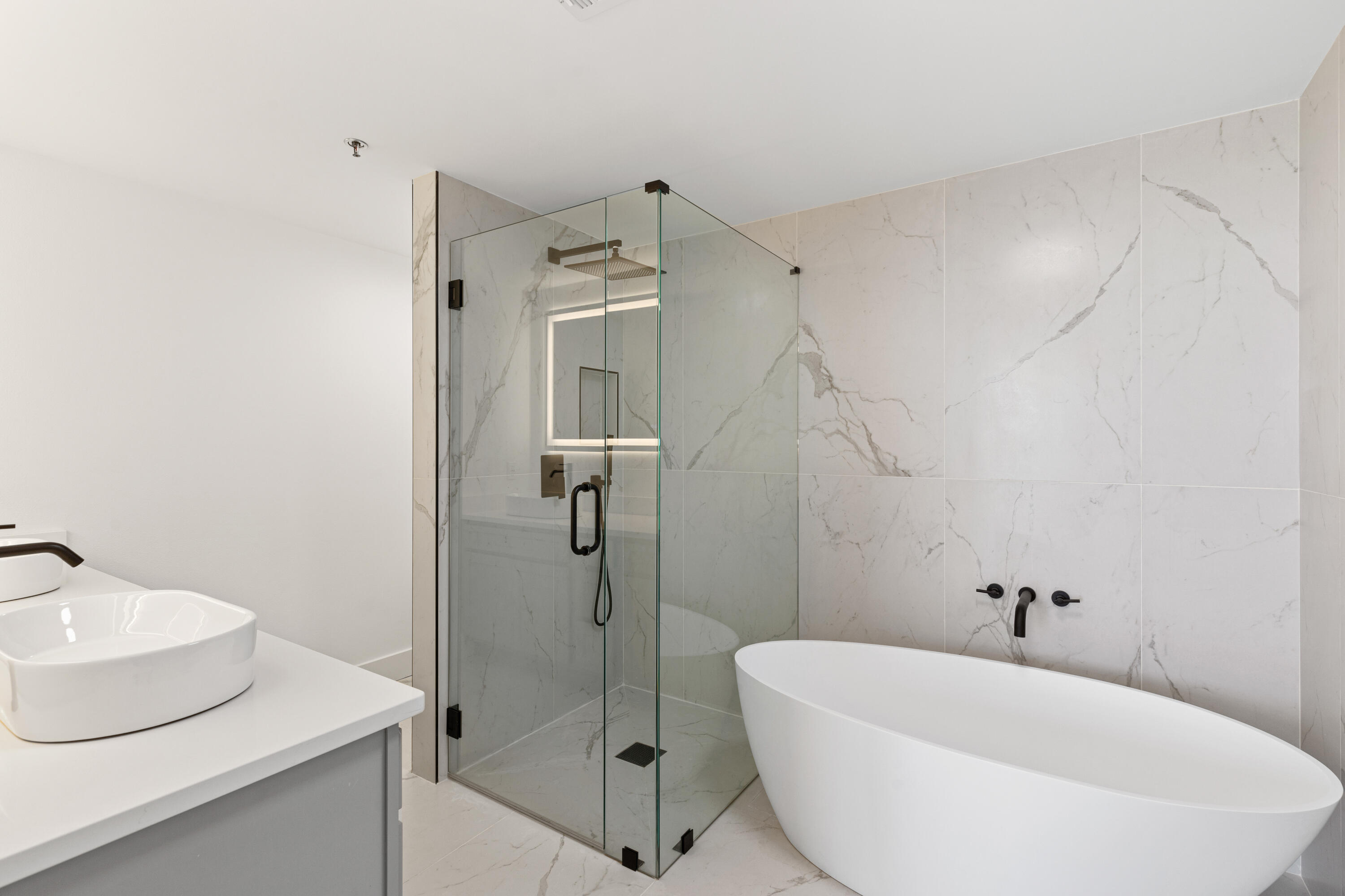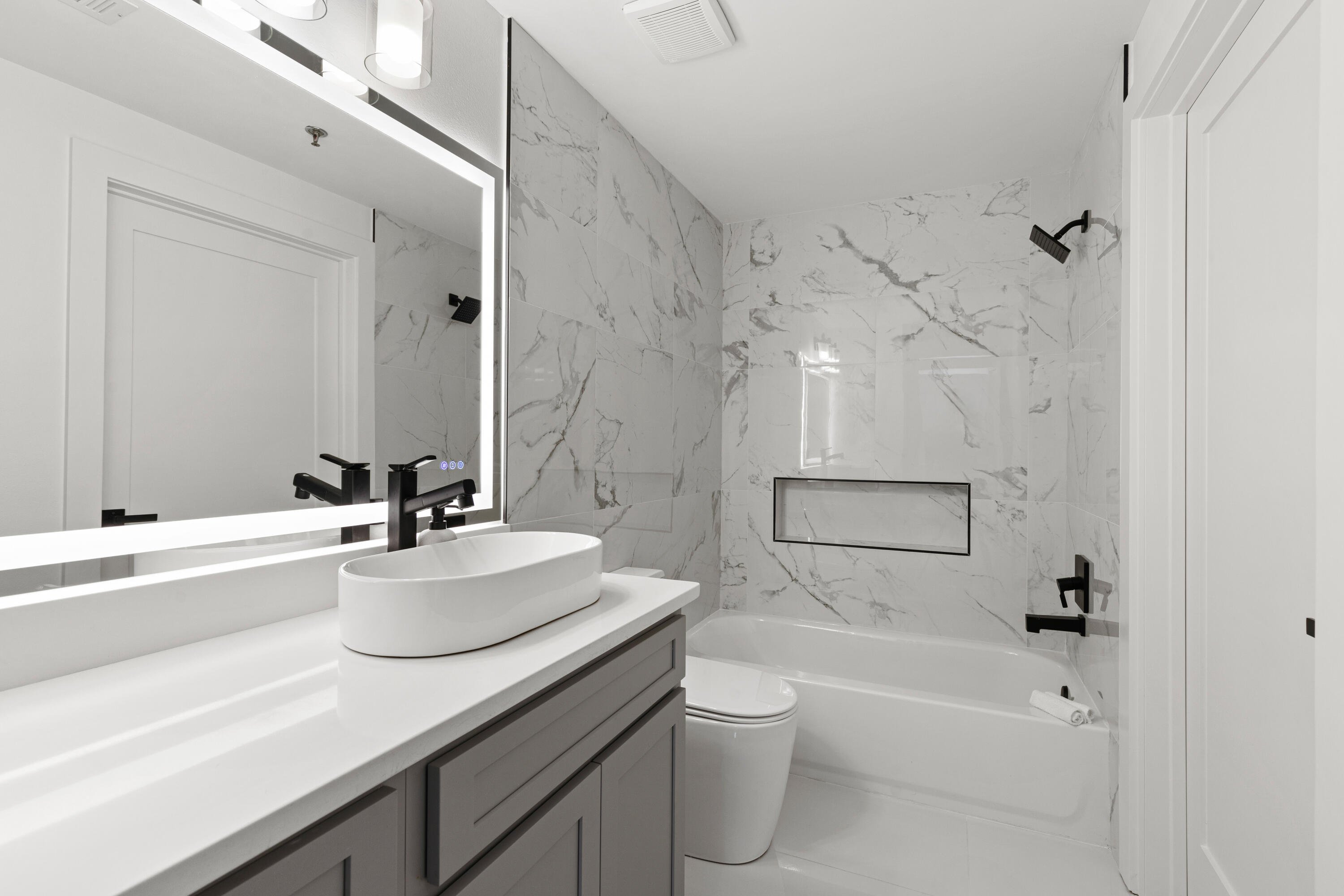 Both bathrooms are beautifully updated with quartz countertops, porcelain sinks, custom mirrors, LED lighting, and designer finishes. The primary bathroom features wall-to-wall tile, a walk-in shower, and a separate soaking tub for ultimate relaxation.