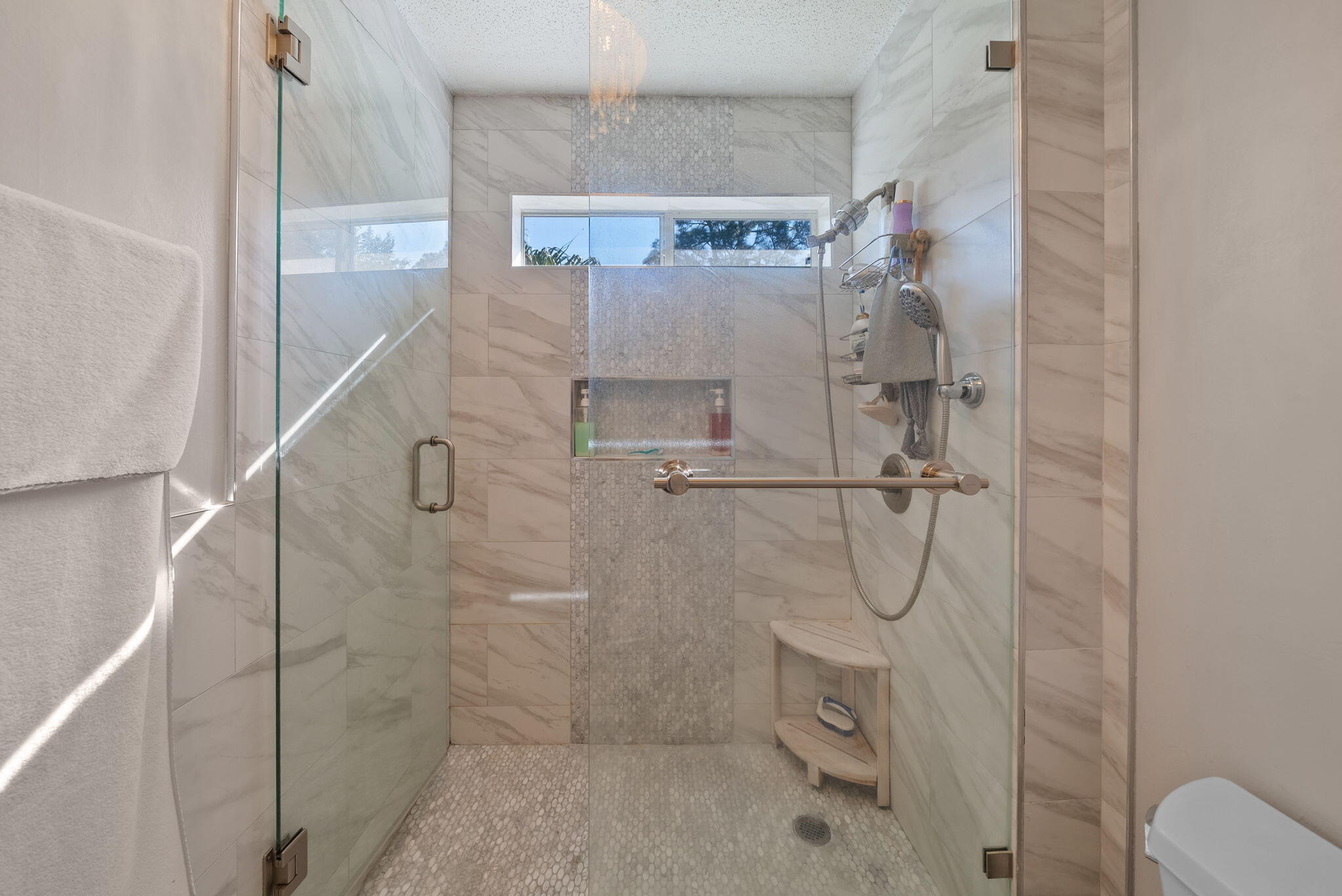 Discover this immaculate 3-bedroom, 2-bath home tucked away in the desirable gated community of Magnolia Creek, perfectly situated on the front corner of a quiet cul-de-sac. From the moment you arrive, the meticulous care and custom upgrades throughout this home will impress. Step inside to find Italian porcelain tile in the kitchen, entry, hallways, and guest bath, complemented by luxury carpeting in the living area and primary suite. The spacious layout offers two guest bedrooms and a full bath on one side of the home, while the private primary suite serves as a peaceful retreat with a fully remodeled ensuite, featuring elevated chandelier lighting, glass-enclosed tiled shower, and dual vanities.The heart of this home is the chef-inspired kitchen, designed to impress and perform. The chef's kitchen includes three ovens (convection microwave, convection oven, and standard oven), a sizable cooktop, granite countertops, GE Profile stainless appliances, a beverage refrigerator, and a Whirlpool refrigerator and dishwasher. A raised bar adds additional counter seatingperfect for entertaining. The open-concept living area features two sets of sliding glass doors flanking the fireplace, allowing natural light to pour in and offering easy flow to the spectacular outdoor living space. The showstopperof this home is the oversized backyard oasis! Enjoy a covered patio, a screened-in deck, and an additional decking platform for a 8x13 swim/spa. One side is a hot tub with seating and jets; the other offers resistance jets for low-impact swimming and aquatic workouts. The fenced yard offers privacy and potential to add a private pool or expand the home's footprint. This home had a new roof and solar panels installed in 2019. New buyers will enjoy the benefits of reduced power bills averaging $12/month due to solar efficiencies.