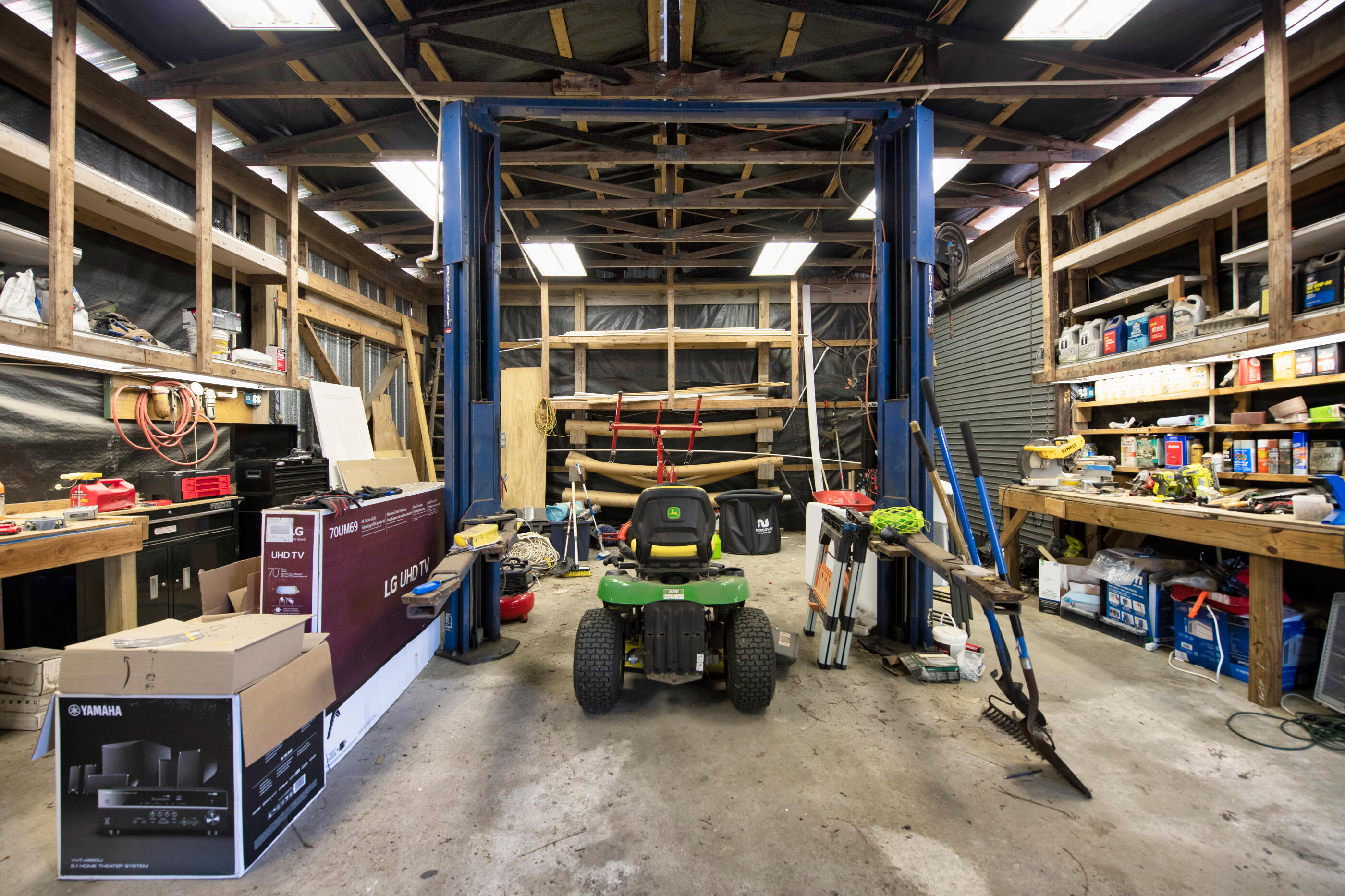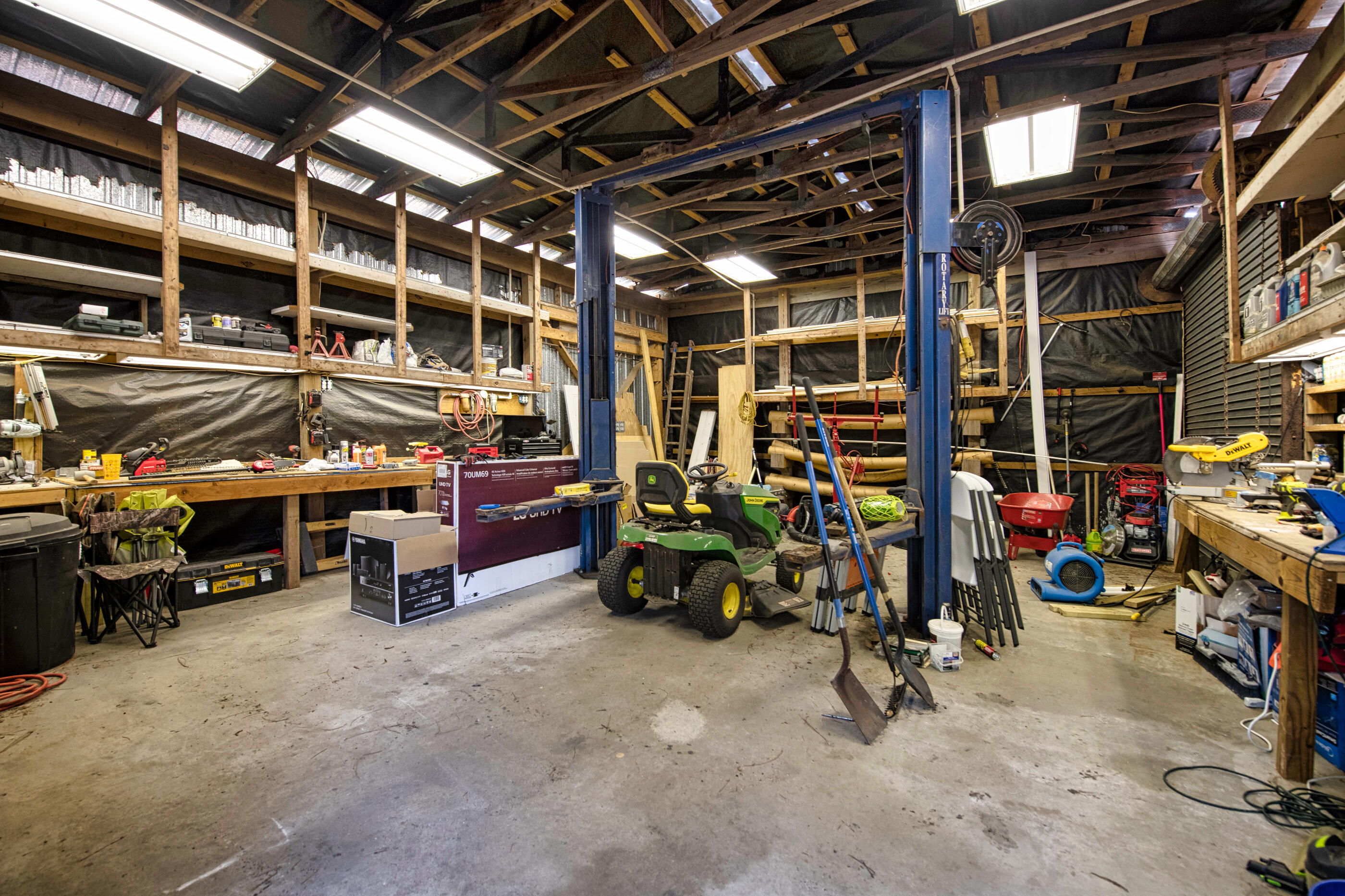 A separate garage + workshop with a two-post automotive lift is ideal for vehicle storage or hobbies. There's also ample space to park an RV, boat, or extra vehicles with no HOA restrictions.