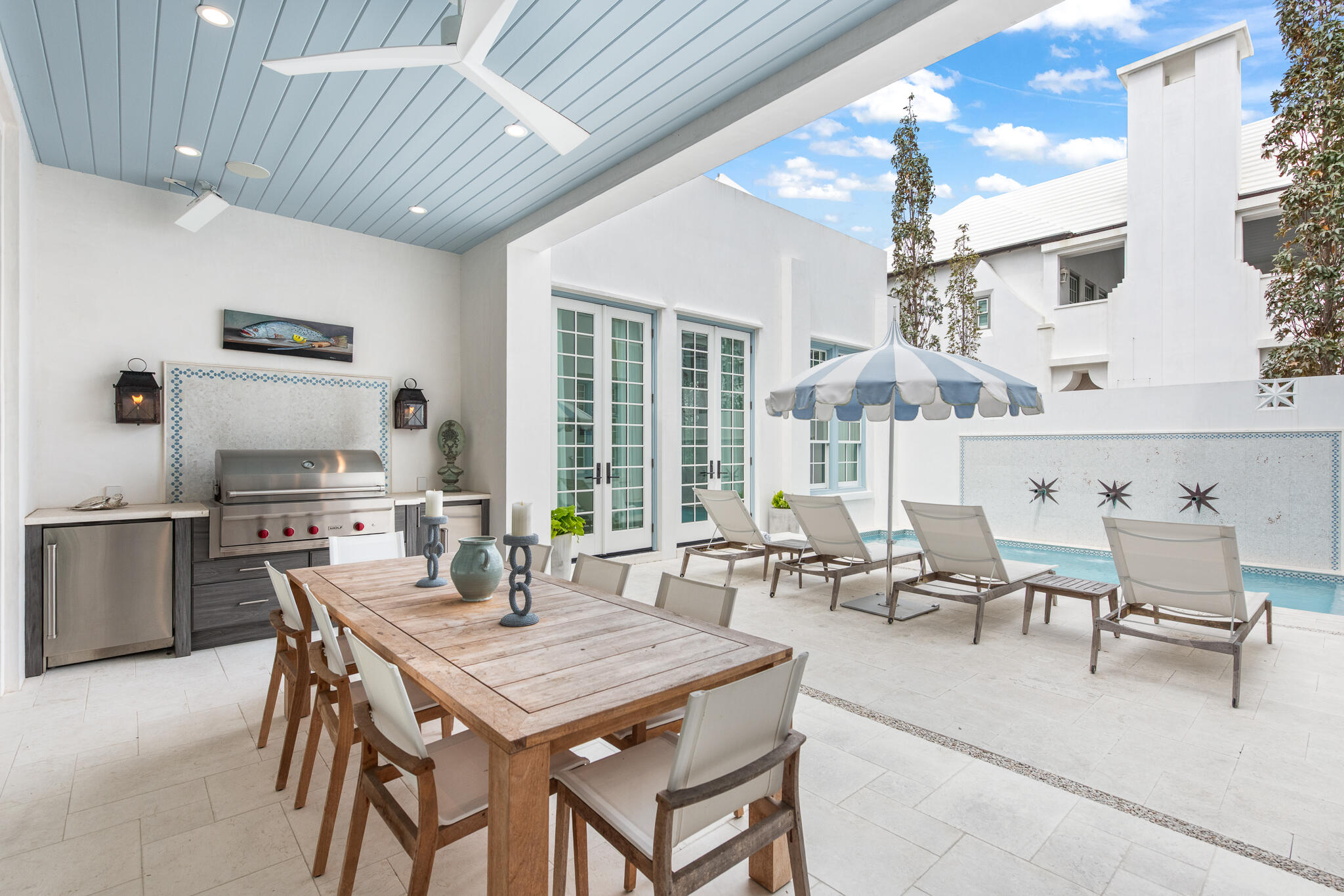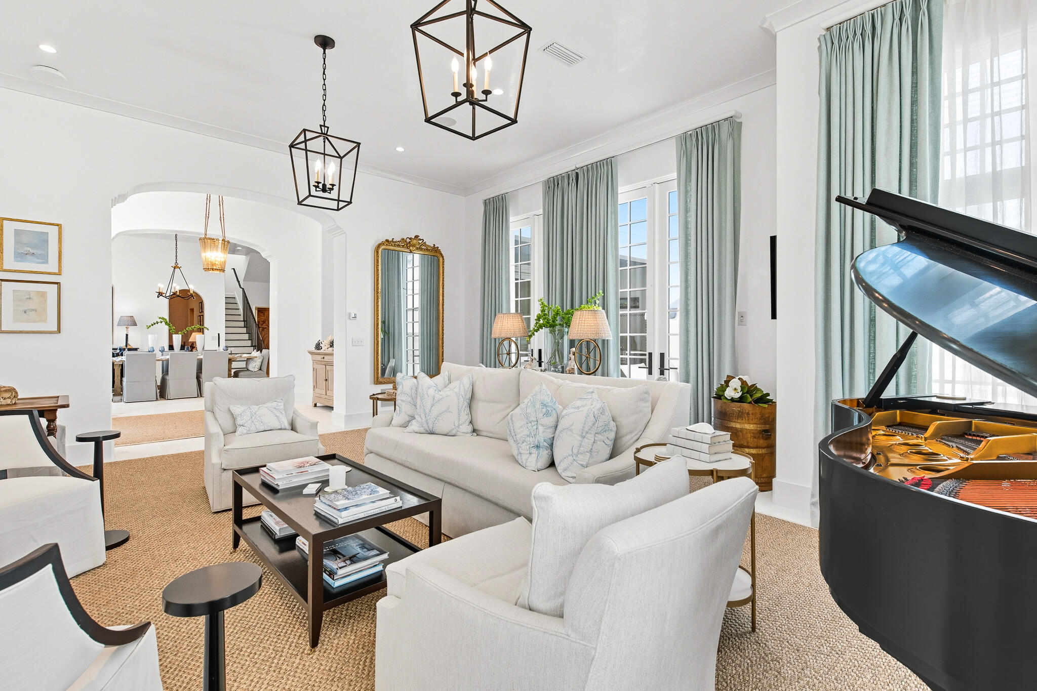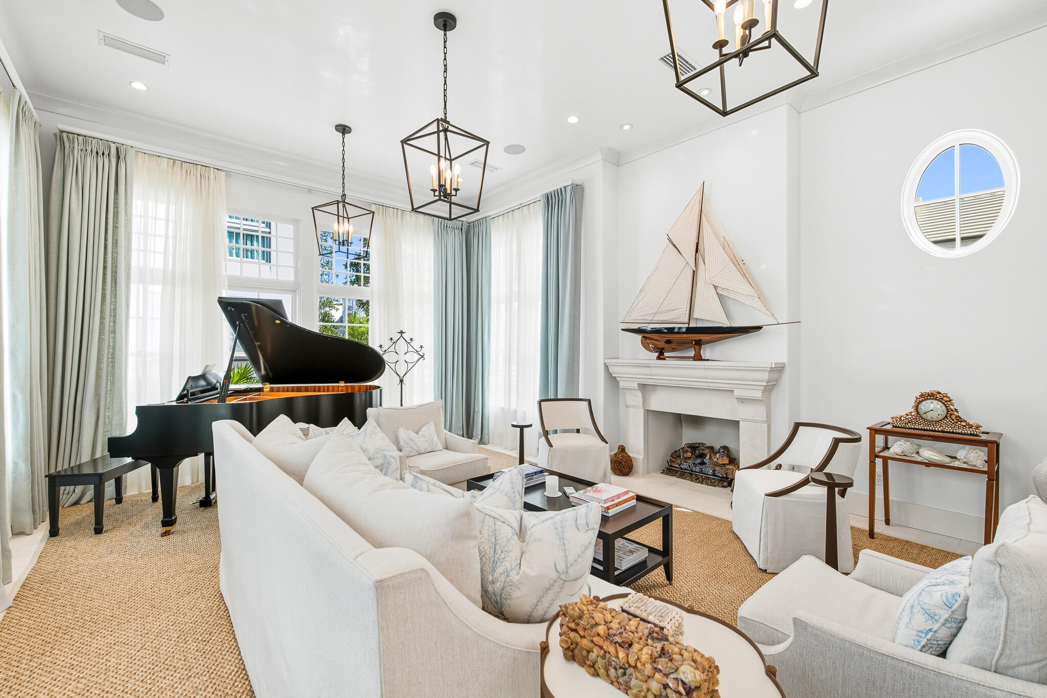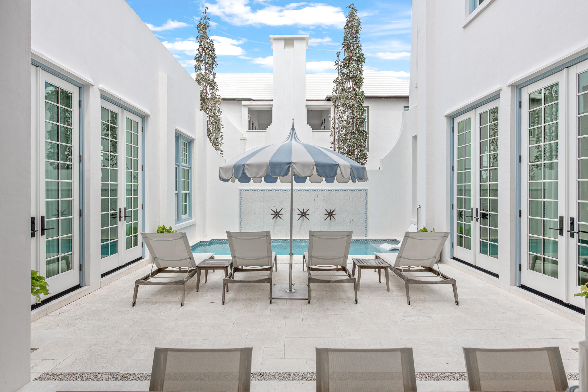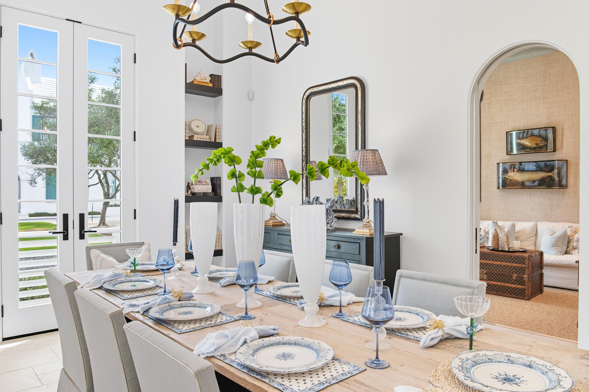 Welcome to 195 N. Charles Street, where elegance meets exquisite design in the heart of Alys Beach. Crafted by the renowned Christ & Associates Architecture, this stunning residence overlooks the picturesque Papilio Park, featuring a mature Olive Grove and a serene sitting fountain to enjoy.Spanning 4,415 sq. ft. of luxurious living space, complemented by an additional 1,133 sq. ft. of terraces and loggias, this home is a true masterpiece. As you approach, you'll be captivated by its beautiful setting, anchored by Papilio Park and a charming northern pedestrian path.Step inside to the grand foyer, adorned with architectural ceilings that set the tone for the rest of the home. To the right, you'll find a spacious living room, and to the left, an elegant dining room, both furnished with professionally designed decor and custom window treatments.