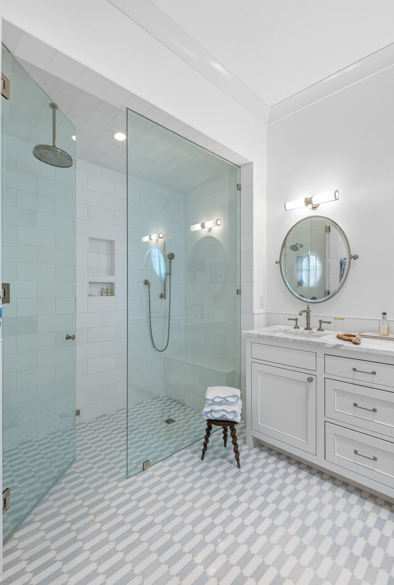 The 1st floor primary suite is designed for ultimate comfort, overlooking the home's tranquil courtyard and swimming pool. This oasis boasts his and her closets, as well as separate water closets. The spa-like bathroom features luxurious marble and exquisite tilework, a bubbling tub, and a spacious steam shower.