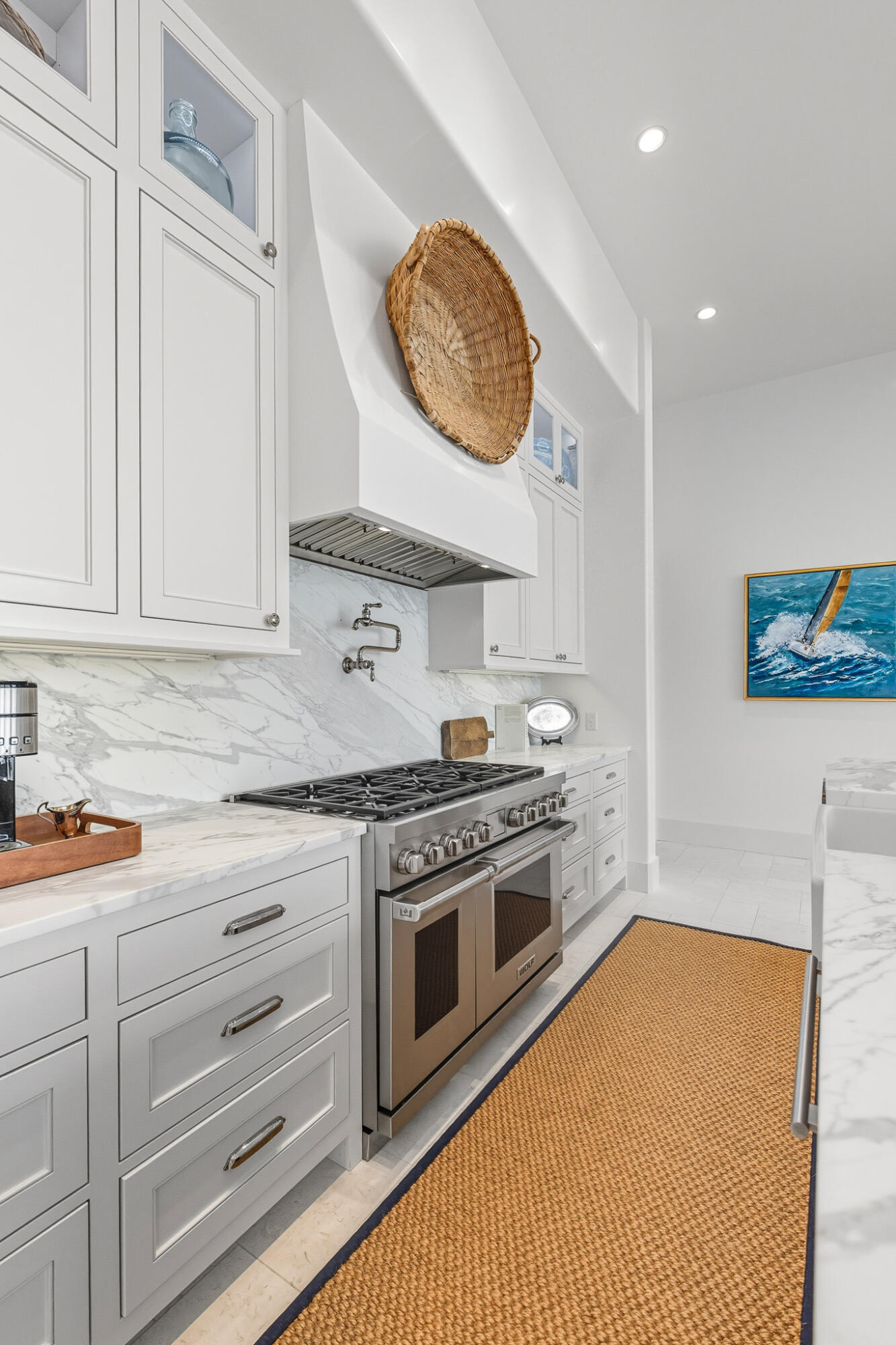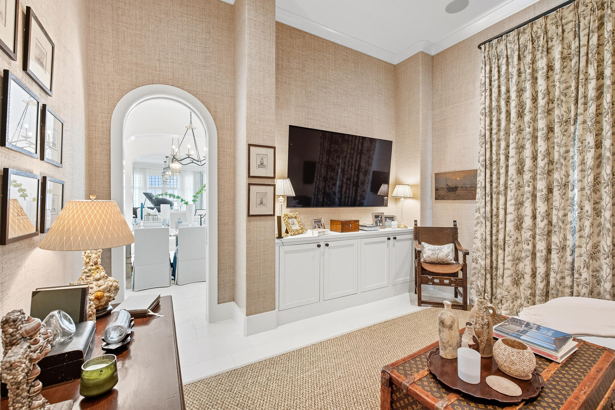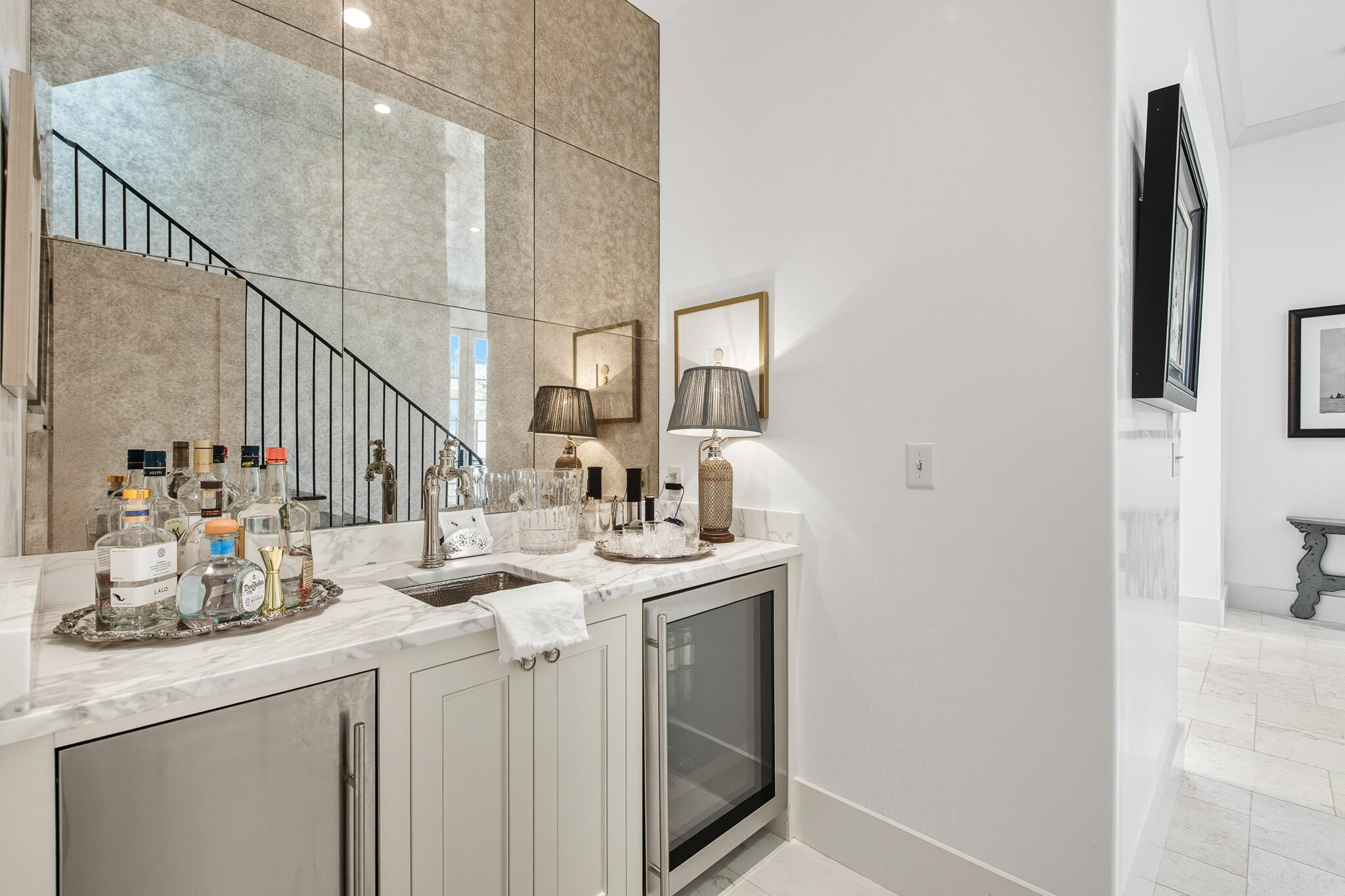 The gourmet kitchen is a chef's dream, featuring a 48-inch Wolf range beneath a Venetian plaster hood, accented by a solid slab marble backsplash and countertops. Adjacent to the kitchen, a cozy media room and bar area, complete with antique glass, icemaker, and beverage refrigerator, provide the perfect space for relaxation and entertainment.