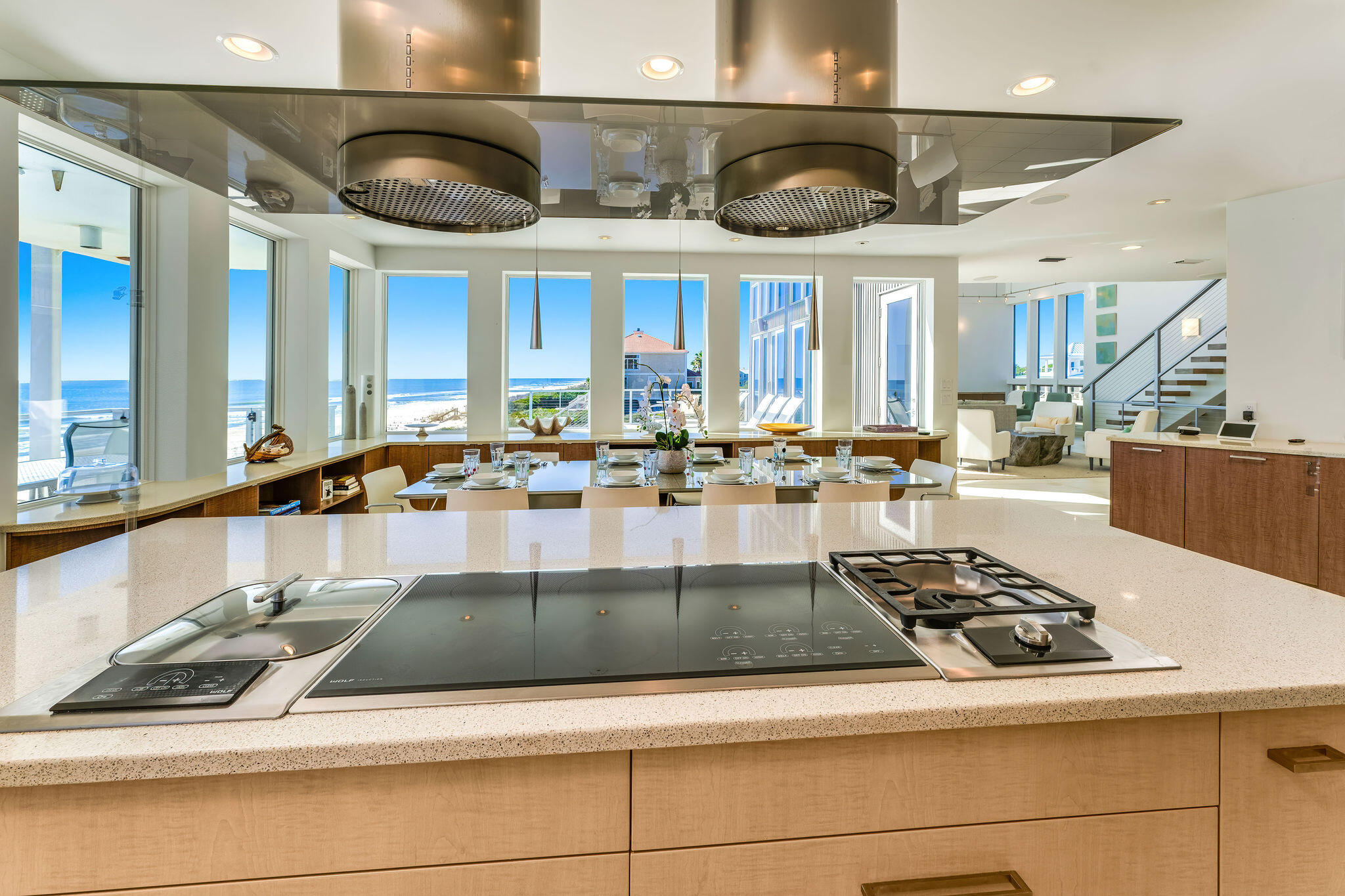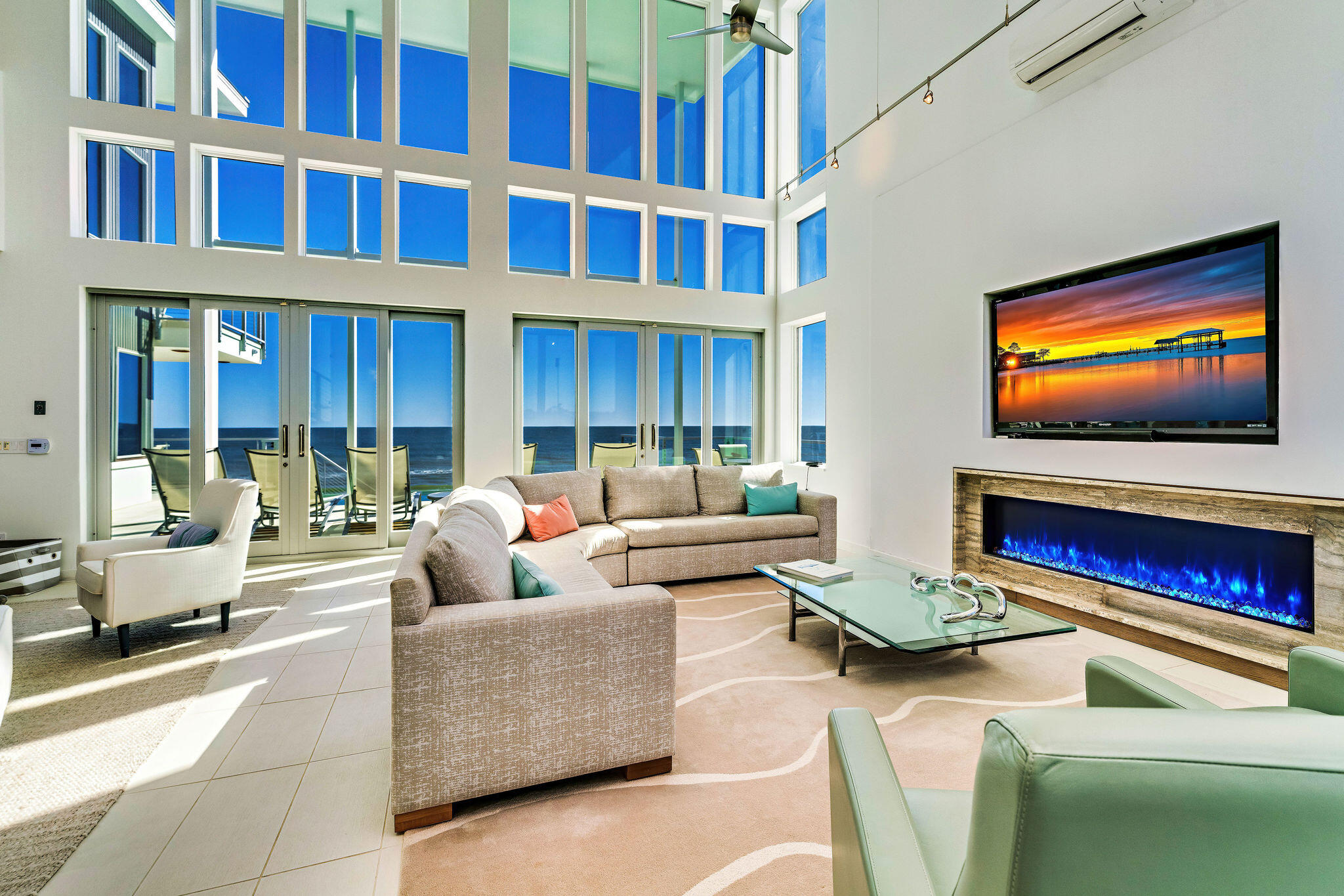 Welcome to Sugar Sands Sanctuary, an exquisite Gulf front legacy home nestled in the gated community of The Plantation on St. George Island. Designed by renowned architect Carey McWhorter, this contemporary masterpiece spans over 5,000 square feet and boasts 100 feet of stunning beachfront on the Gulf of Mexico.From the moment you arrive, you are greeted by covered concrete parking and a spacious, enclosed foyer with an elevator for convenience. The first floor features an open living/dining/kitchen area with soaring two-story ceilings and walls of glass that provide breathtaking Gulf views. The elegant and serene decor, combined with comfortable seating, a flat-screen TV with a home theater system, and direct deck access, creates the perfect atmosphere for