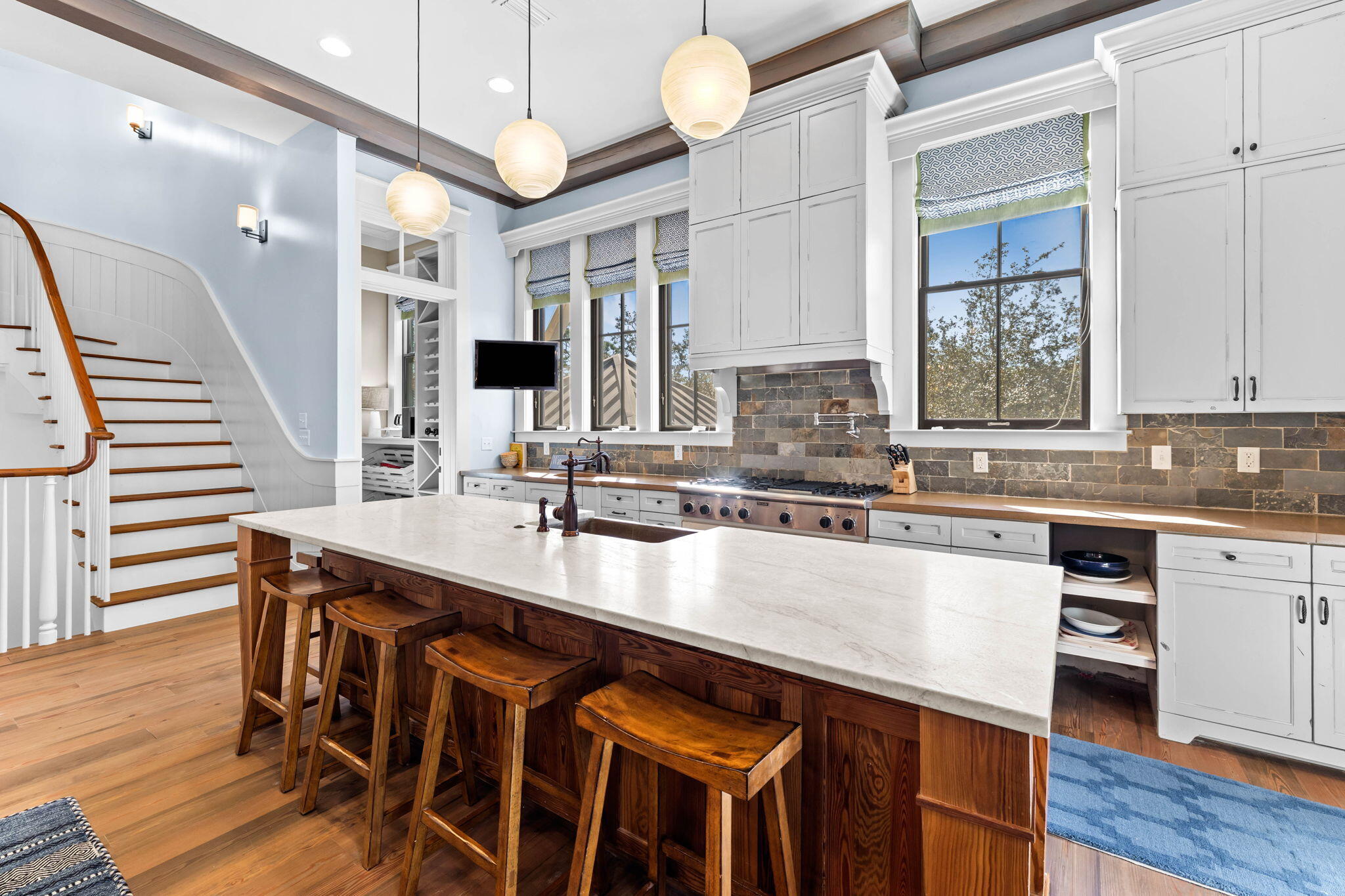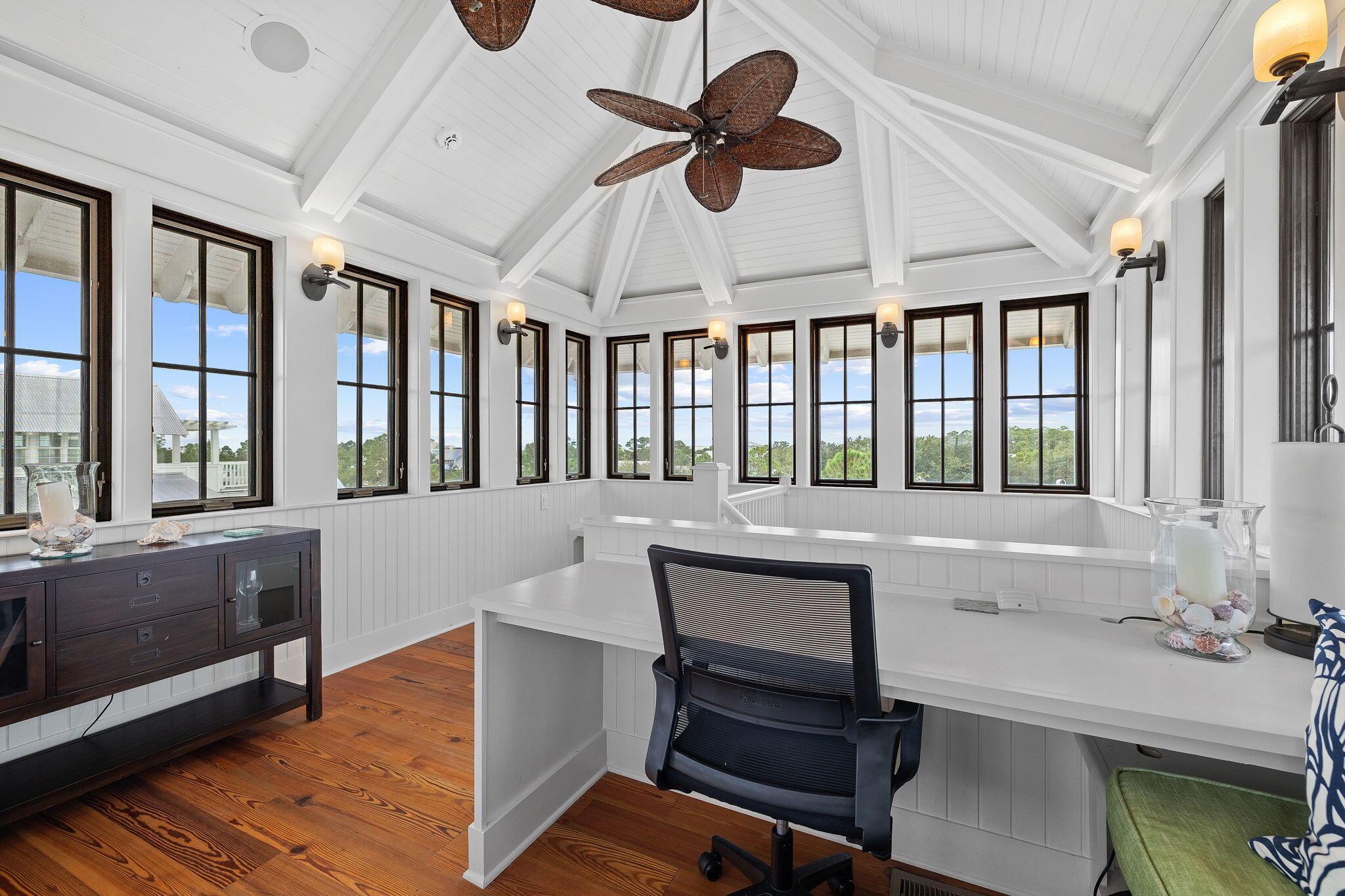 An exceptional WaterColor property, with all the trappings of a custom built home, welcome you to 459 Western Lake Drive. This large and tranquil home, conveniently located close to town center, was meticulously constructed replete with amenities. Spanning 3 stories served by an elevator, and a lookout tower, the home has no shortage of space. The main house features a master suite on the first level, as well as two additional guest rooms, and a bunk-style bedroom room for 3 or more. On arrival to the second level is a large kitchen and breakfast area. A small balcony off of the kitchen is outfitted with a gas grill. Continuing through the second level, there are two formal dining areas and a large open living space. The screened porch features one of two fireplaces for the home, and extends the house's entertaining area -especially for those classic beach evenings. Off of the main living space is an office retreat, with its own balcony and private views of nature. A half bath and a wet bar give versatility to the already generous entertaining space.