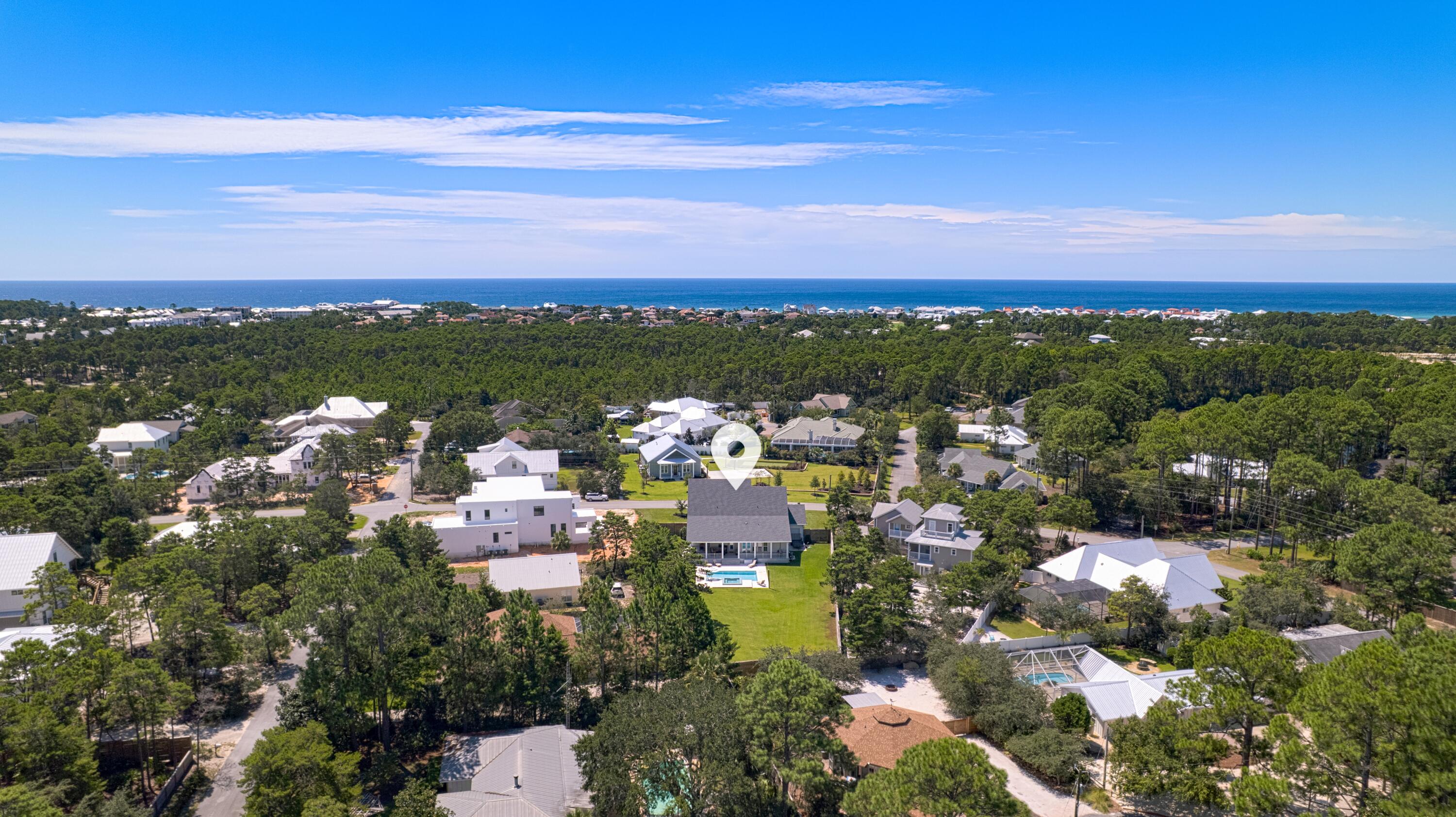 Rare 0.57-acre 30A retreat in Santa Rosa Ridge. Custom-built by Randy Wise Builders. Just a half mile from the Gulf and 40+ feet above sea level. Enjoy 10-ft ceilings, open floor design, luxury kitchen, 10-ft island, walk-in pantry, and ceiling-height custom cabinetry. The dining area opens to a spacious lanai, with room for lounging and outdoor dining overlooking the pool. The Primary Suite offers dual vanities, dual custom walk-in closets, and a 50-sq-ft heated shower. Main floor includes a guest suite and flex room. Upstairs: a wet bar including bev. cooler and ice maker, two bedrooms, and a 350-sq-ft entertainment room. Heated/cooled 3-car garage, year-round heated pool and spa. Plenty of space for boat/rv storage. Enough space to build a future Carriage House, Pool house etc. NO HOA