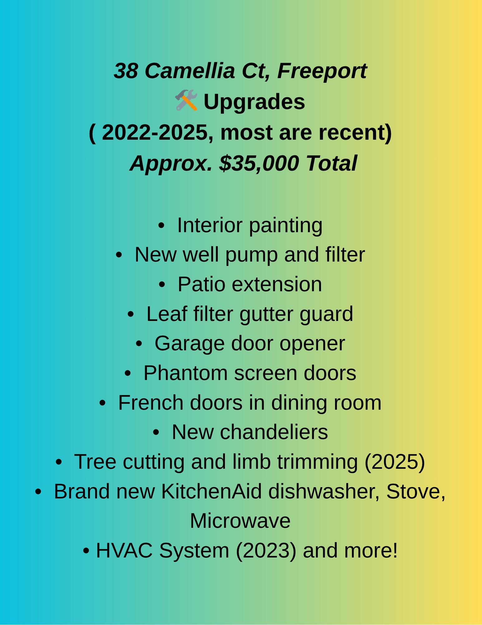 Additional upgrades include phantom screen doors, leaf filter gutter guards, tree trimming, a new well pump and filter, and a new HVAC system (2023)-totalling approximately $35,000 in improvements.