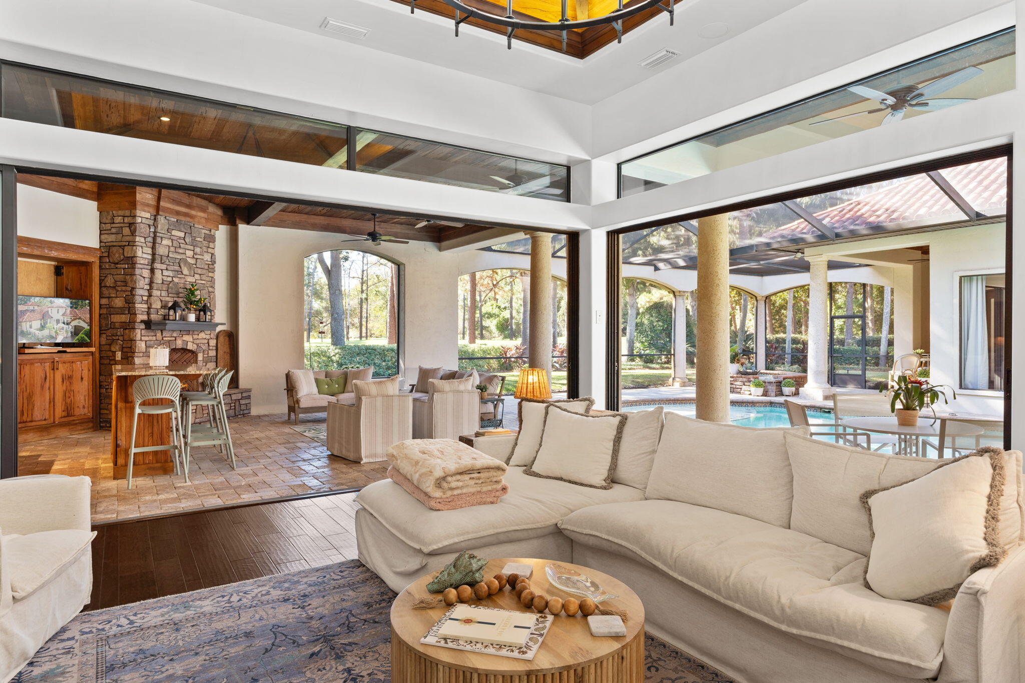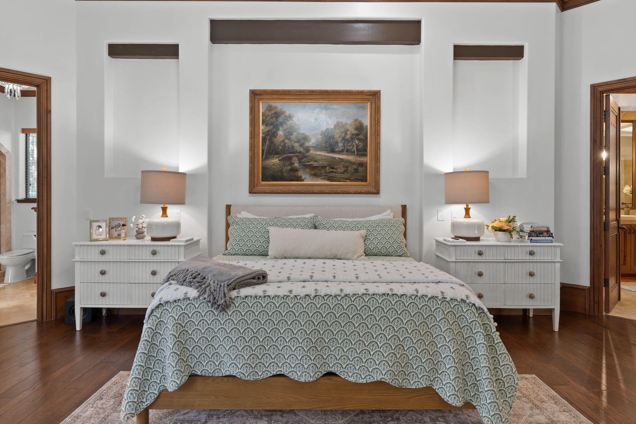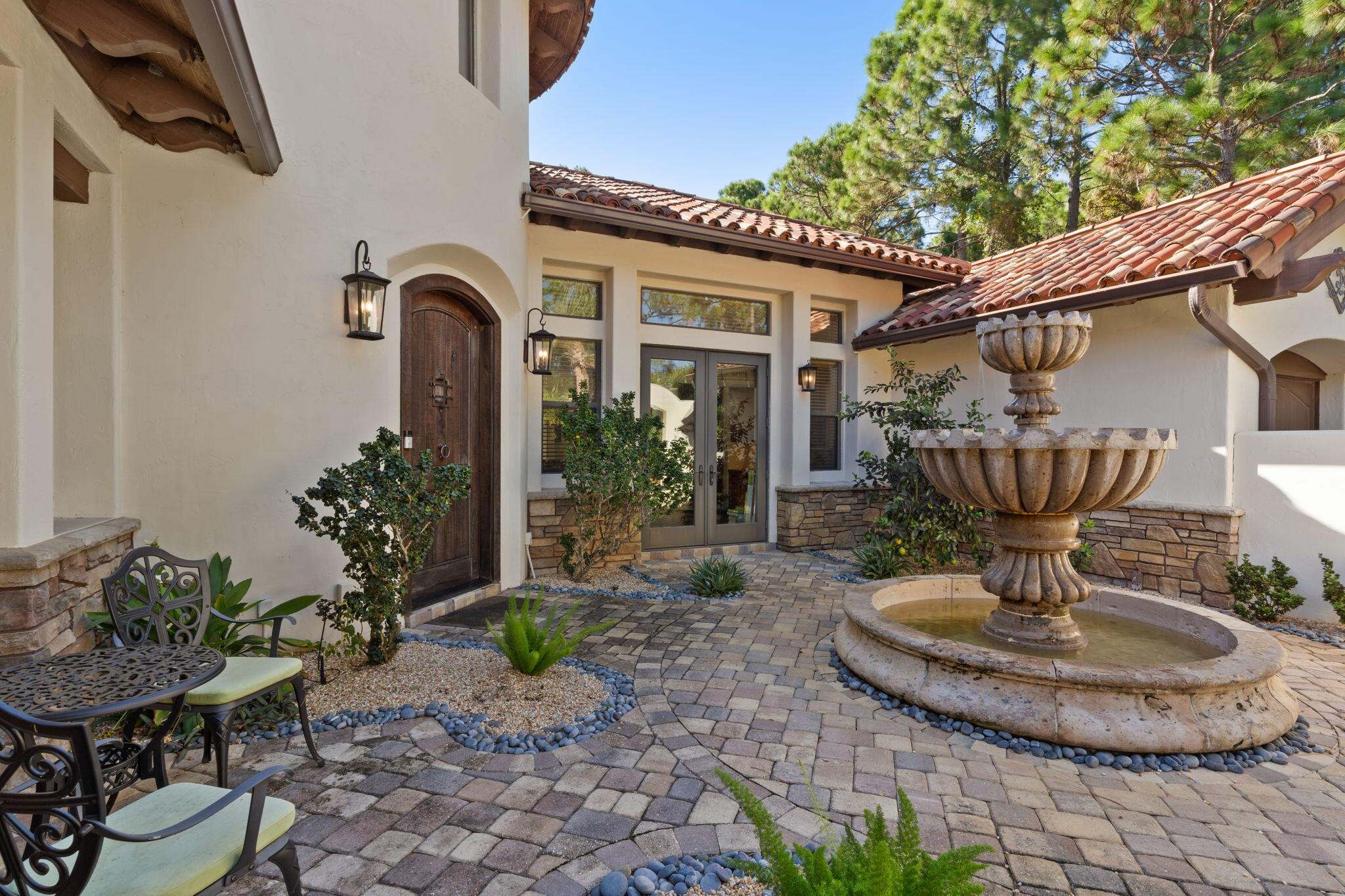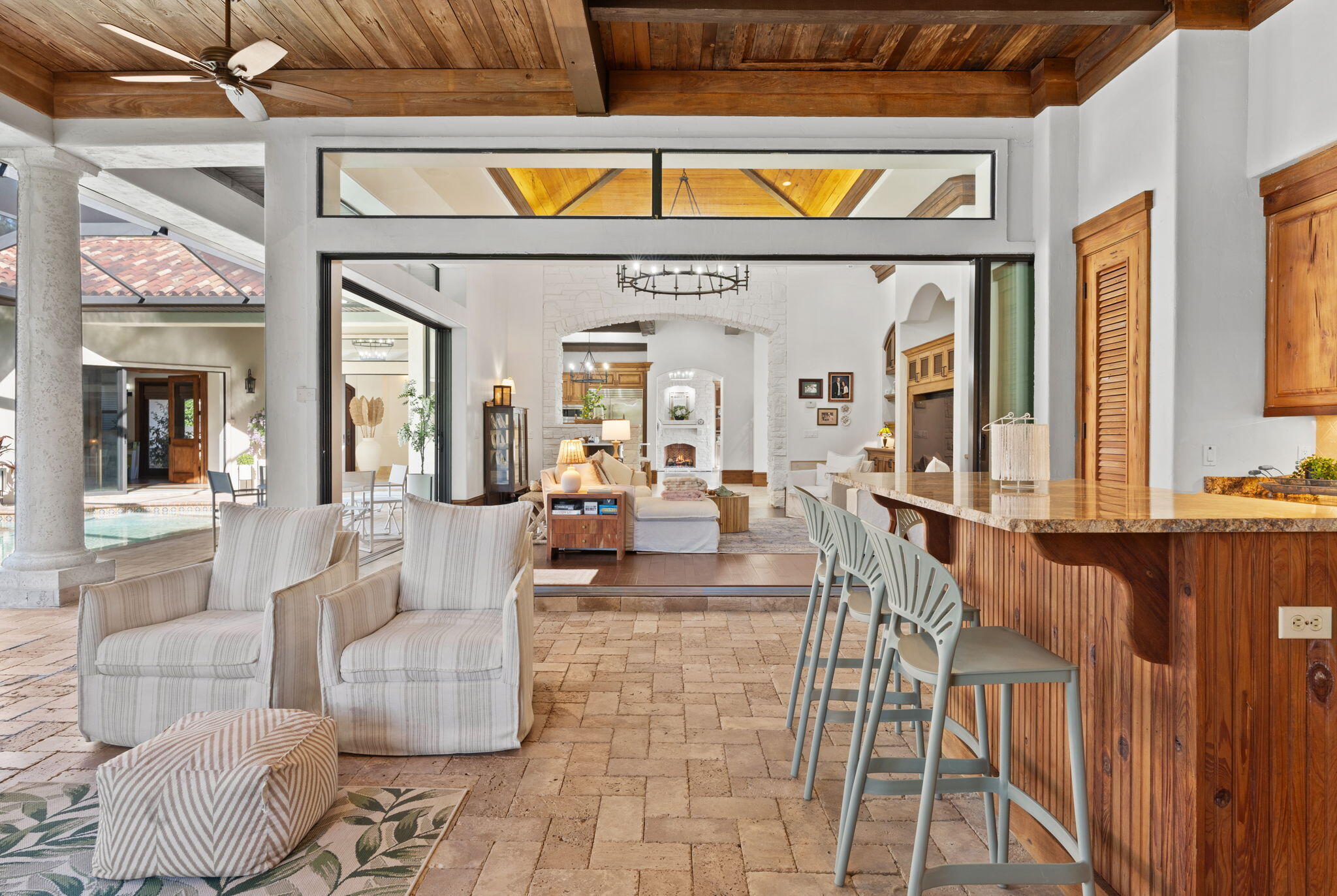 This exquisite custom-built, sprawling, single story home is truly one of a kind. Tucked away on a prime, estate sized lot and cul-de-sac, located in the gated neighborhood of Burnt Pine and on the 2nd tee box of the Burnt Pine Golf Course, is a Tuscan inspired treasure. At 3,949 sq. ft., 3 beds, 5 baths, plus office, built by Sweet Homes as the builder's residence, the finishes are beautifully extraordinary. The many authentic wooden beams and wood planked ceilings are a timeless feature and from the illuminated brick covered barrel hallway ceiling to the stone accent walls, it is a showplace of craftsmanship and architectural design. Enter by an arched courtyard gate that leads to a tranquil, cascading fountain. The grand foyer, with its impressive twenty foot turret wooden ceiling is simply stunning. With a popular open floor plan, the kitchen flows out to many rooms including the spacious dining room, suitable for an elegant dinner party with its a stone gas fireplace, beautiful hardwood flooring, attractive custom built-ins, vaulted wood ceiling and with views and access to a side courtyard. The wine room, with its pretty iron gate, breakfast nook, double door pantry, oversized granite island, perfect for serving and entertaining, are all part of the kitchen. The unique three-sided, stone, gas fireplace that graces the kitchen, breakfast nook, and living room adds lots of charm and seasonal warmth during the cooler evenings. A stone arched way and brick accented walls are also found in the kitchen, along with wooden beamed ceilings and many bronze iron lighting fixtures. Custom, pecan-stained wood cabinetry and millwork are all high-end features found throughout the entire estate the along with 12 foot and taller ceilings. This gourmet kitchen is not only functional, but lovely. It overlooks the large, heated, salt water pool, spa, and wall of fountains. It is the heart of the home with its stainless appliances, including a Bosch dishwasher, a built-in, oversized GE Monogram refrigerator freezer, five burner gas stove with hood vent, warming drawer, double wall ovens and microwave. The home has a built-in sound system in most rooms. Enter the the grand living room and find hardwood flooring and the same pecan-stained wood entertainment center. The ceiling in the living room is showy with more of those eye-catching beams and shiplap styled woodwork and another fabulous, iron lighting fixture. Like the dining room, the living room can easily accommodate the entire family during special occasions, but cozy enough for just two. The walls of sliding glass doors found in the living room stack open presenting a seamless appearance between the indoors and outdoors. They allow access onto the spacious, and recently re-screened outdoor living, dining, lounging, heated pool, spa and wall of fountains. The home wraps around the pool and fountains as it is the focal point. Also found there is the outdoor kitchen which includes a serving island, new Thor double stainless refrigerated beverage drawers, and a new Thor ice maker, a built-in Viking gas grill with a vent hood, more custom cabinetry for added storage, another stone, gas fireplace with wood mantle, TV cabinet, a shiplap ceiling with many beams and six ceiling fans. It's a fabulous place to gather and dine while enjoying our wonderful weather. Or just relax, read a good book and let stress melt away. It accesses a full bath and includes a storage closet. Moving back inside, you will find the master en-suite which overlooks and accesses this great outdoor living area. It really is a special retreat with two full baths, his and hers, a large walk-in/through closet, with many built-in cabinetry, and has a coffee/wet bar with a mini fridge. In keeping with custom features, a trey ceiling, those beautiful hardwood floors and the custom pecan-stained wood cabinets are present. One master bath has a double vanity, a large shower, a free standing spa bathtub, water closet, and a linen closet. The other bath has a shower, single vanity, toilet, and with access to the pool and spa. Designed with a split floor plan, the two guest suites are on the opposite side of the home offering privacy for all. These spacious en-suite guest bedrooms not only have their attached private full baths, they include the hardwood flooring and both have walk-in closets. One guest suite accesses the fountain courtyard for private entry and exit, and the other guest bedroom suite views the side courtyard. The executive office continues with a wall of custom cabinetry for electronics and books, wood flooring, and even has a hidden safe room. The office looks onto and accesses both the front courtyard, for a private entry and exit, and the screened outdoor living area, pool, and the fountains with its trickling water falls that can be heard if the glass doors there are open making it a peaceful working place. The laundry room includes a stainless sink for washing out those sandy bathing suits, and the full sized washer and dryer. There is a security system, central vacuum cleaning system and the home can be entered through the attached two car garage. There is also a separate golf cart garage. No detail has been overlooked here. There is also beautiful landscape lighting on a timer. The exterior has recently been painted with an attractive, off-white shade of Rhino-shield paint, good for many years, two of the three HVAC systems where replaced in 2020 and 2022 with American Standard units, and the two new Navien, tankless, gas hot water heaters were replaced in 2022 along with the GE Monogram microwave oven.