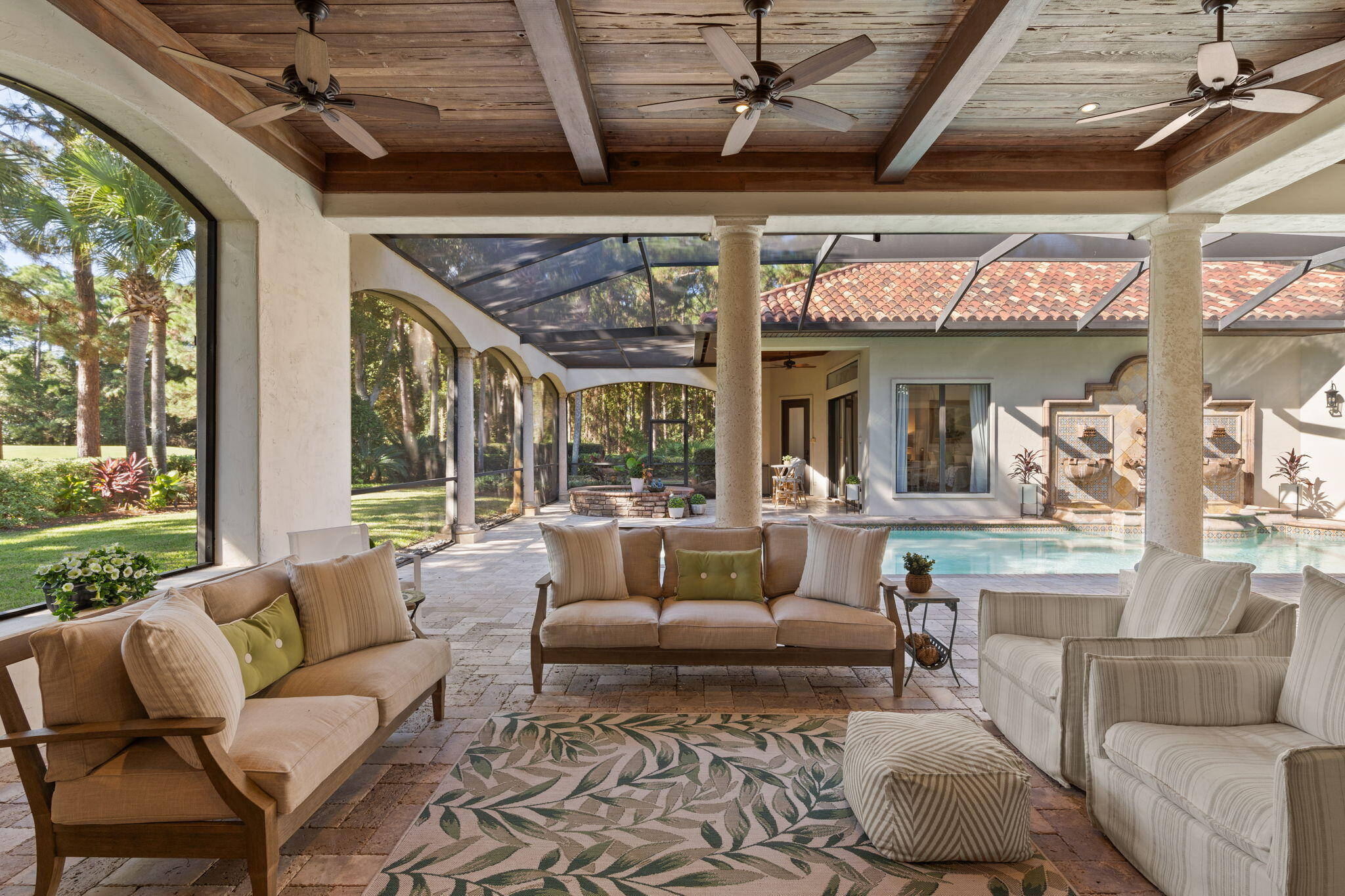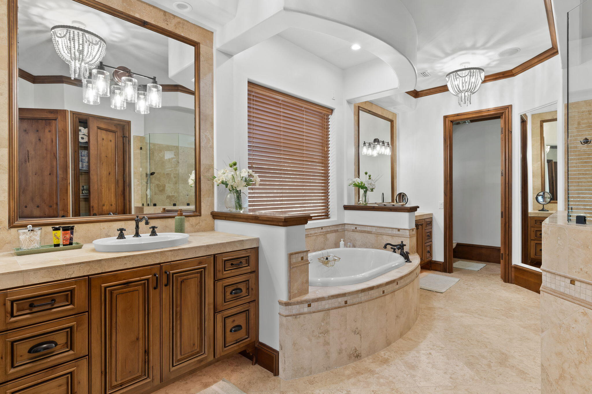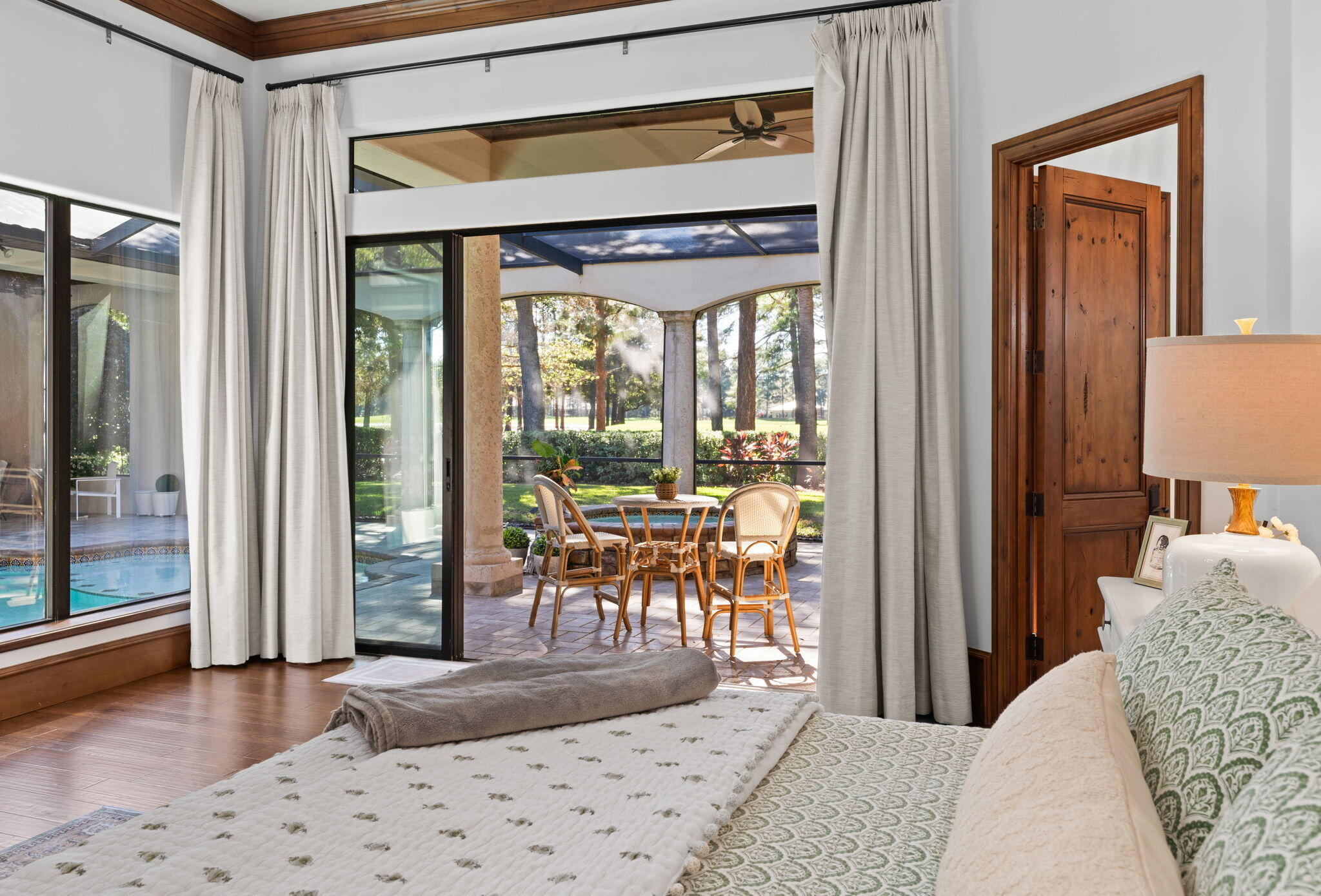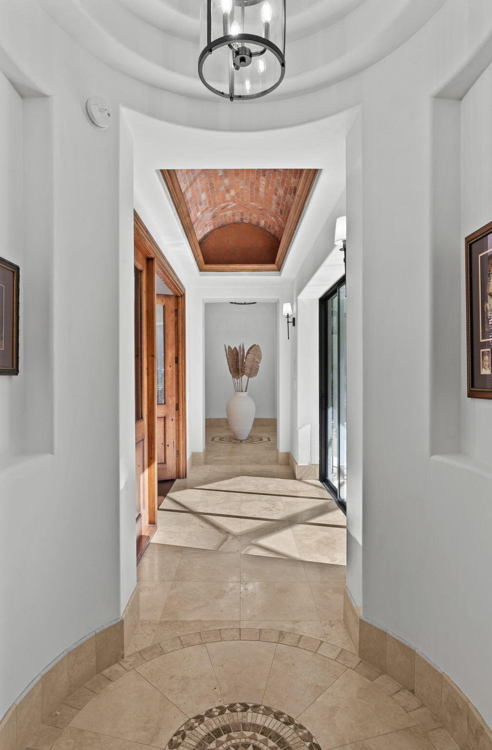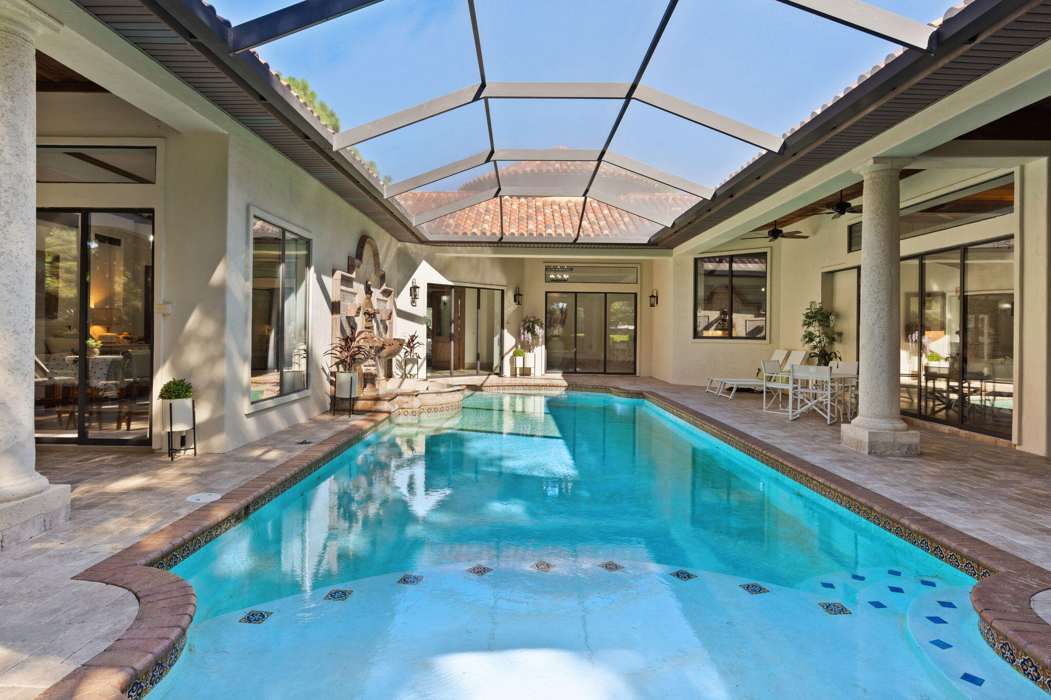 This exquisite custom-built, sprawling, single story home is truly one of a kind. Tucked away on a prime, estate sized lot and cul-de-sac, located in the gated neighborhood of Burnt Pine and on the 2nd tee box of the Burnt Pine Golf Course, is a Tuscan inspired treasure. At 3,949 sq. ft., 3 beds, 5 baths, plus office, built by Sweet Homes as the builder's residence, the finishes are beautifully extraordinary. The many authentic wooden beams and wood planked ceilings are a timeless feature and from the illuminated brick covered barrel hallway ceiling to the stone accent walls, it is a showplace of craftsmanship and architectural design. Enter by an arched courtyard gate that leads to a tranquil, cascading fountain. The grand foyer, with its impressive twenty foot turret wooden ceiling is simply stunning. With a popular open floor plan, the kitchen flows out to many rooms including the spacious dining room, suitable for an elegant dinner party with its a stone gas fireplace, beautiful hardwood flooring, attractive custom built-ins, vaulted wood ceiling and with views and access to a side courtyard. The wine room, with its pretty iron gate, breakfast nook, double door pantry, oversized granite island, perfect for serving and entertaining, are all part of the kitchen. The unique three-sided, stone, gas fireplace that graces the kitchen, breakfast nook, and living room adds lots of charm and seasonal warmth during the cooler evenings. A stone arched way and brick accented walls are also found in the kitchen, along with wooden beamed ceilings and many bronze iron lighting fixtures. Custom, pecan-stained wood cabinetry and millwork are all high-end features found throughout the entire estate the along with 12 foot and taller ceilings. This gourmet kitchen is not only functional, but lovely. It overlooks the large, heated, salt water pool, spa, and wall of fountains. It is the heart of the home with its stainless appliances, including a Bosch dishwasher, a built-in, oversized GE Monogram refrigerator freezer, five burner gas stove with hood vent, warming drawer, double wall ovens and microwave. The home has a built-in sound system in most rooms. Enter the the grand living room and find hardwood flooring and the same pecan-stained wood entertainment center. The ceiling in the living room is showy with more of those eye-catching beams and shiplap styled woodwork and another fabulous, iron lighting fixture. Like the dining room, the living room can easily accommodate the entire family during special occasions, but cozy enough for just two. The walls of sliding glass doors found in the living room stack open presenting a seamless appearance between the indoors and outdoors. They allow access onto the spacious, and recently re-screened outdoor living, dining, lounging, heated pool, spa and wall of fountains. The home wraps around the pool and fountains as it is the focal point. Also found there is the outdoor kitchen which includes a serving island, new Thor double stainless refrigerated beverage drawers, and a new Thor ice maker, a built-in Viking gas grill with a vent hood, more custom cabinetry for added storage, another stone, gas fireplace with wood mantle, TV cabinet, a shiplap ceiling with many beams and six ceiling fans. It's a fabulous place to gather and dine while enjoying our wonderful weather. Or just relax, read a good book and let stress melt away. It accesses a full bath and includes a storage closet. Moving back inside, you will find the master en-suite which overlooks and accesses this great outdoor living area. It really is a special retreat with two full baths, his and hers, a large walk-in/through closet, with many built-in cabinetry, and has a coffee/wet bar with a mini fridge. In keeping with custom features, a trey ceiling, those beautiful hardwood floors and the custom pecan-stained wood cabinets are present. One master bath has a double vanity, a large shower, a free standing spa bathtub, water closet, and a linen closet. The other bath has a shower, single vanity, toilet, and with access to the pool and spa. Designed with a split floor plan, the two guest suites are on the opposite side of the home offering privacy for all. These spacious en-suite guest bedrooms not only have their attached private full baths, they include the hardwood flooring and both have walk-in closets. One guest suite accesses the fountain courtyard for private entry and exit, and the other guest bedroom suite views the side courtyard. The executive office continues with a wall of custom cabinetry for electronics and books, wood flooring, and even has a hidden safe room. The office looks onto and accesses both the front courtyard, for a private entry and exit, and the screened outdoor living area, pool, and the fountains with its trickling water falls that can be heard if the glass doors there are open making it a peaceful working place. The laundry room includes a stainless sink for washing out those sandy bathing suits, and the full sized washer and dryer. There is a security system, central vacuum cleaning system and the home can be entered through the attached two car garage. There is also a separate golf cart garage. No detail has been overlooked here. There is also beautiful landscape lighting on a timer. The exterior has recently been painted with an attractive, off-white shade of Rhino-shield paint, good for many years, two of the three HVAC systems where replaced in 2020 and 2022 with American Standard units, and the two new Navien, tankless, gas hot water heaters were replaced in 2022 along with the GE Monogram microwave oven.