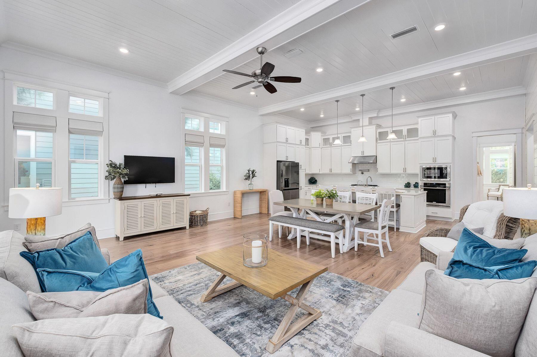 Overlooking a serene green conservation area, this luxurious coastal home offers the ideal blend of golf, beach, and leisure living. Whether you're seeking a refined second home or a vacation rental, this fully furnished and freshly painted residence delivers exceptional comfort, privacy, and style.Designed for seamless indoor-outdoor living, multiple porches and a spacious brick-paver patio invite you to unwind after a day on the golf course or at the nearby WaterSound Beach Club. Inside, soaring 12-foot beamed ceilings, shiplap detailing, and gorgeous hardwood floors reflect the home's coastal charm, while abundant natural light enhances every space.The open-concept layout is perfect for entertaining - from the chef's kitchen with professional-grade stainless appliances and quartz countertops to the expansive dining area and covered back porch for alfresco meals under the stars.