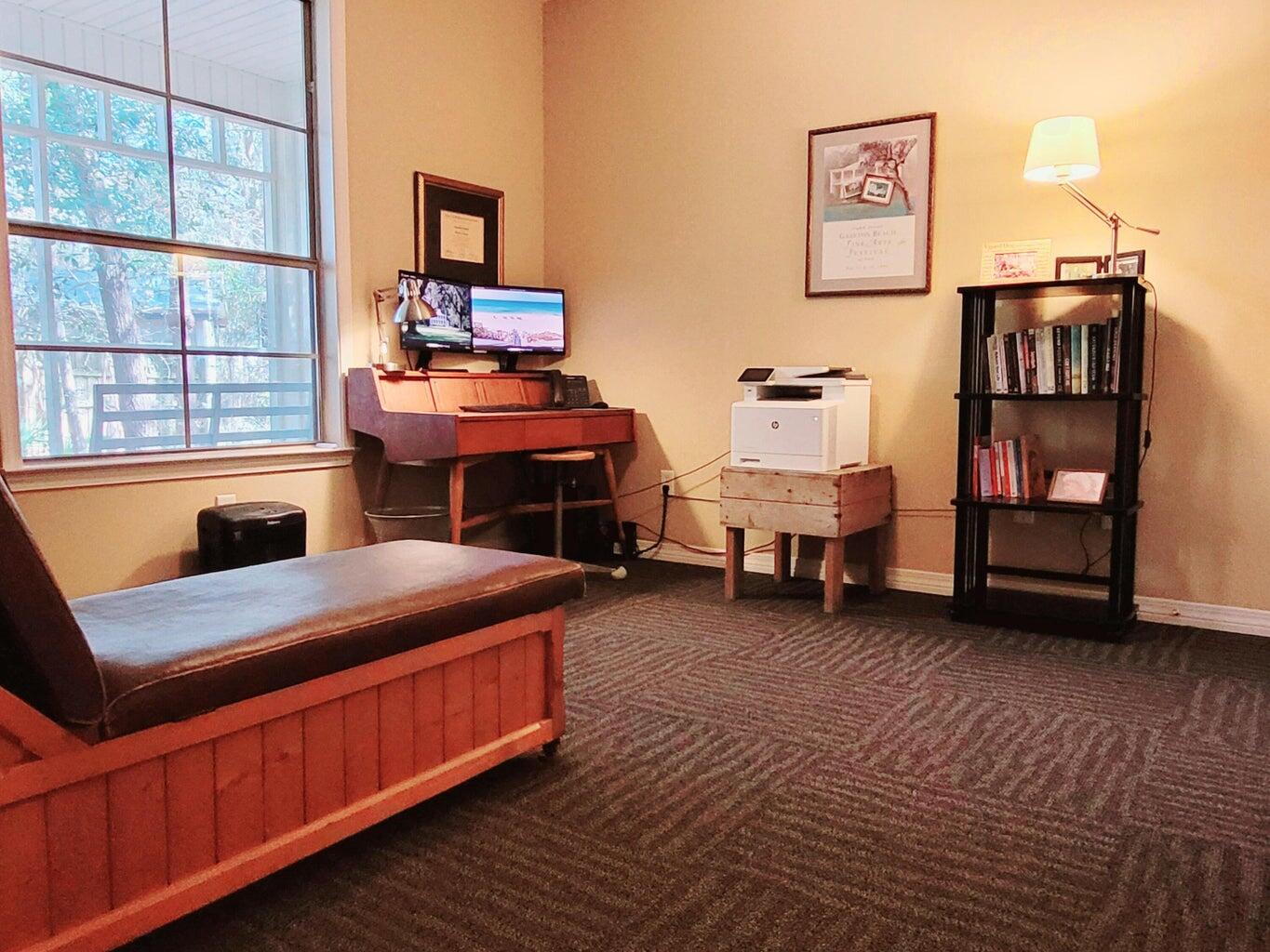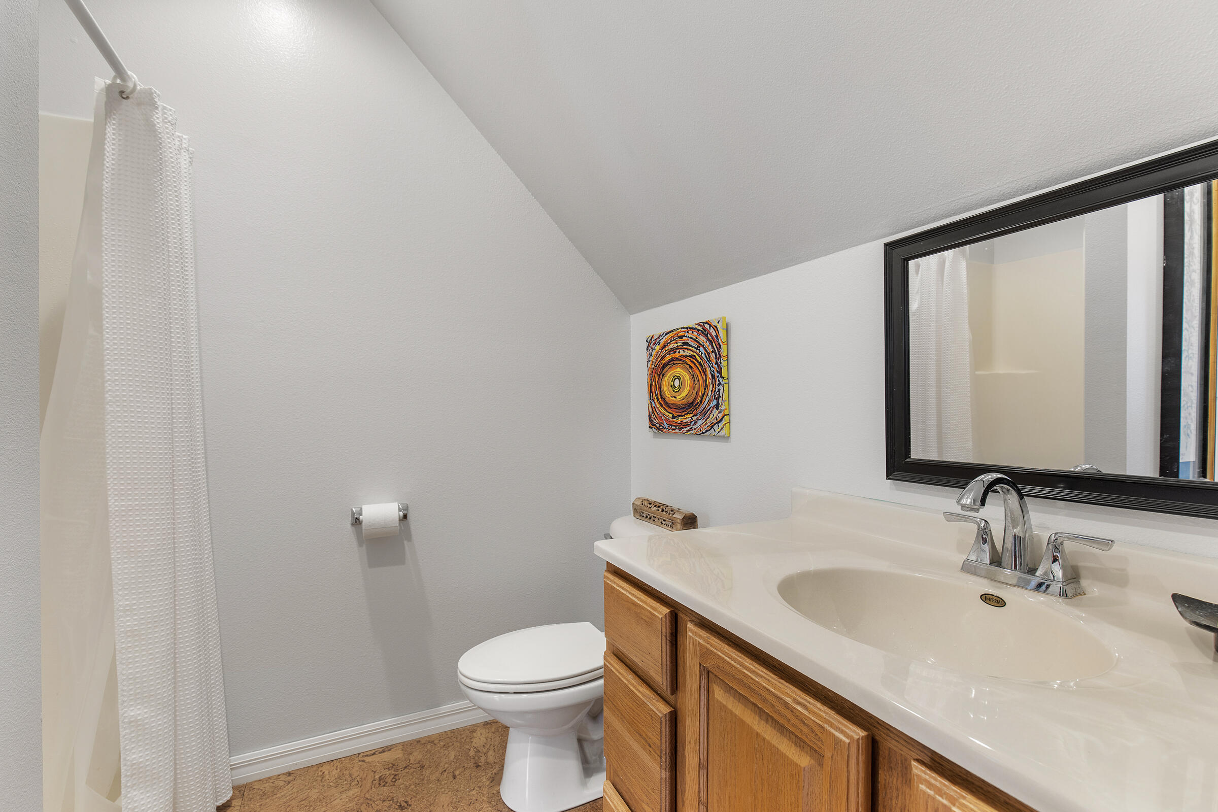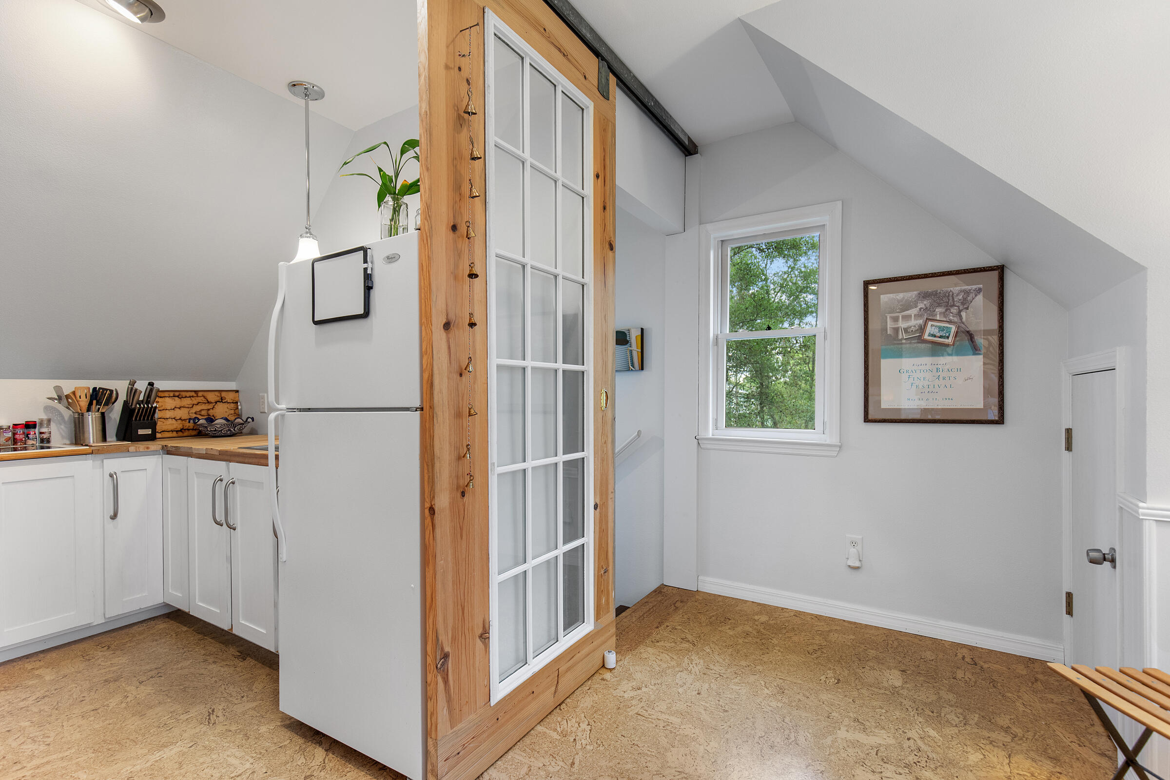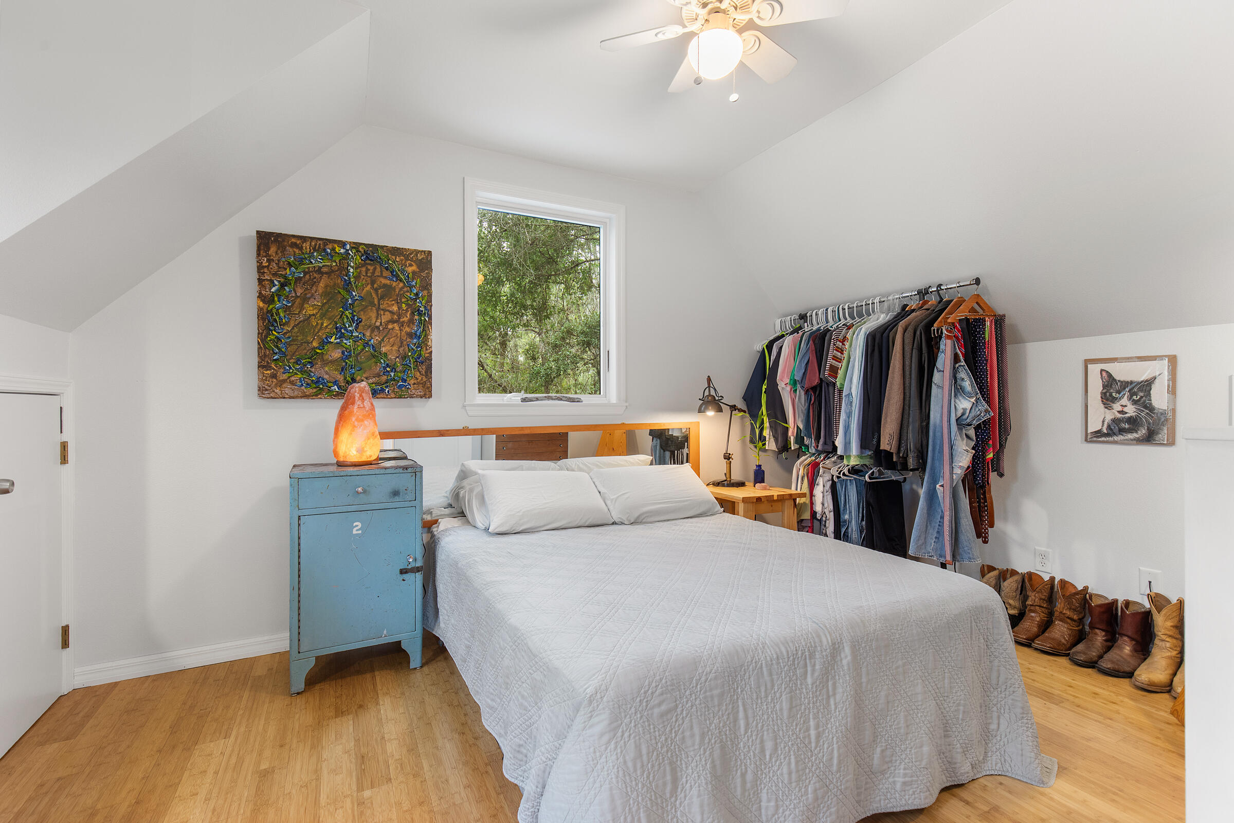 Privately situated above the garage is a full one bedroom apartment, with a private entrance from the exterior, as well as garage access, you'll find a welcoming foyer that leads to the stairs of this lovely home in the trees. Windows line the main living space, flooding everything in natural light. Guests and owners can enjoy a comfortable stay with a full kitchen and large bathroom with space for a stacked washer/dryer hook up in place.