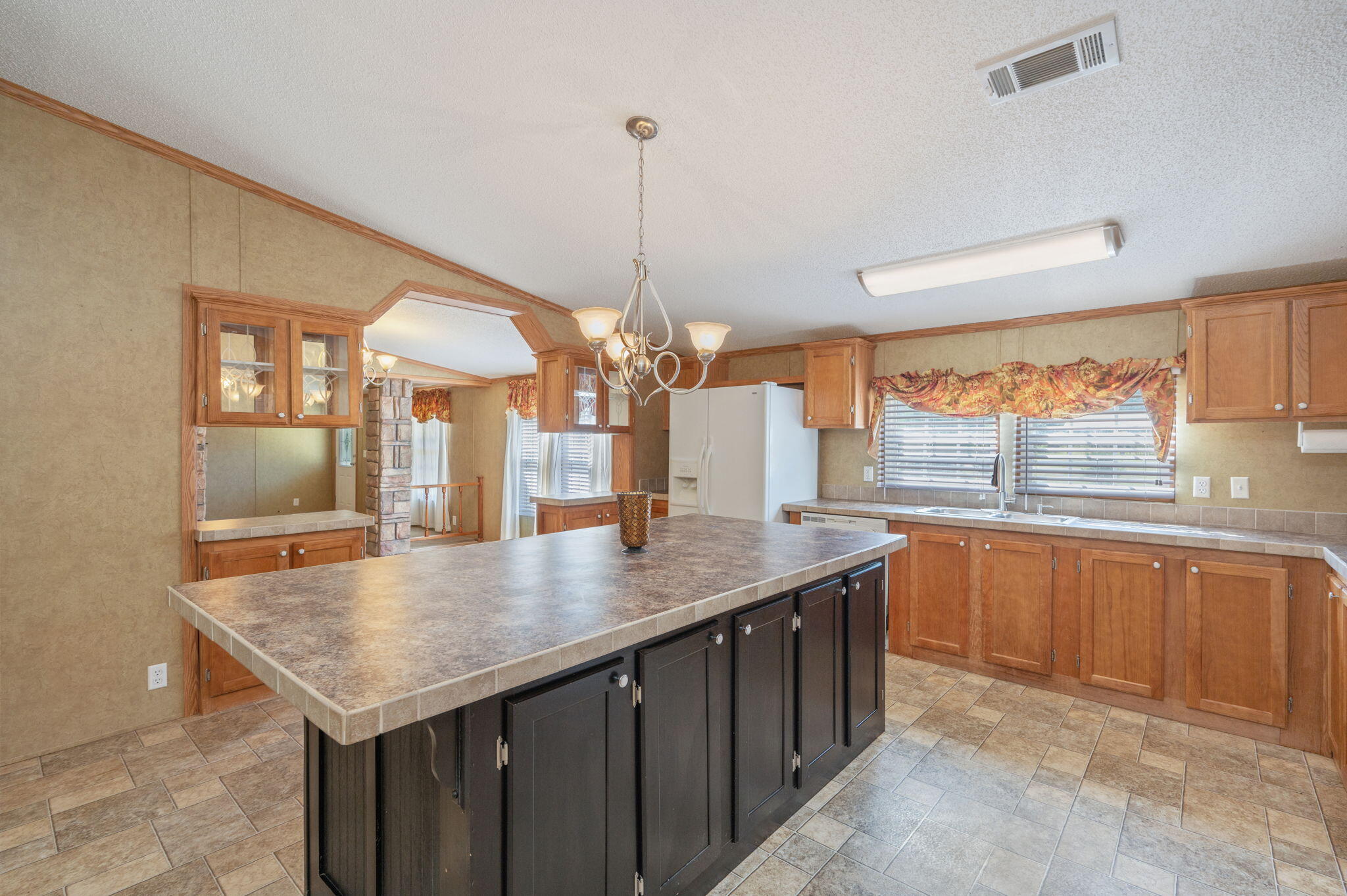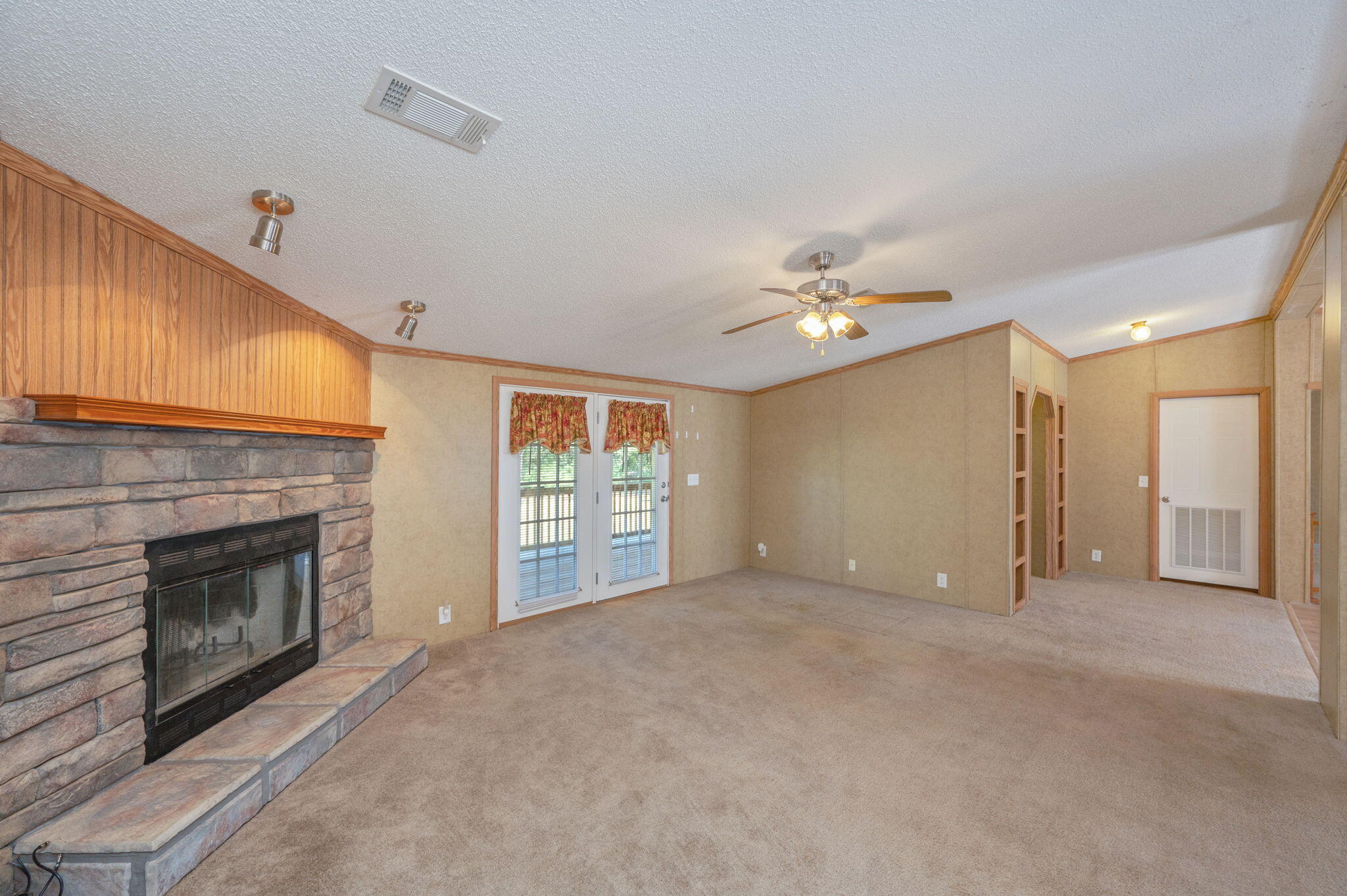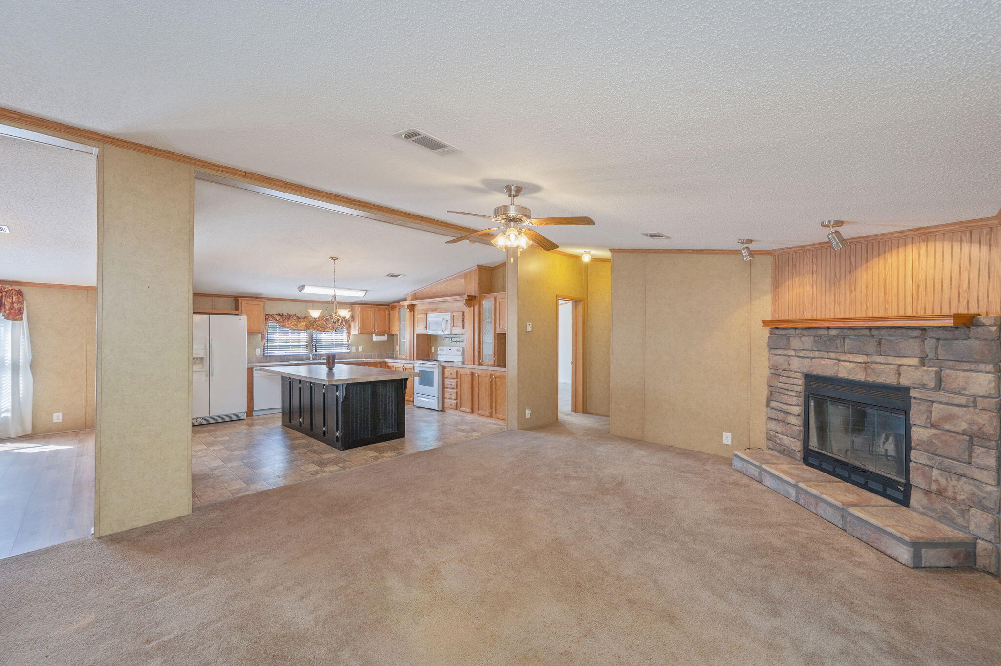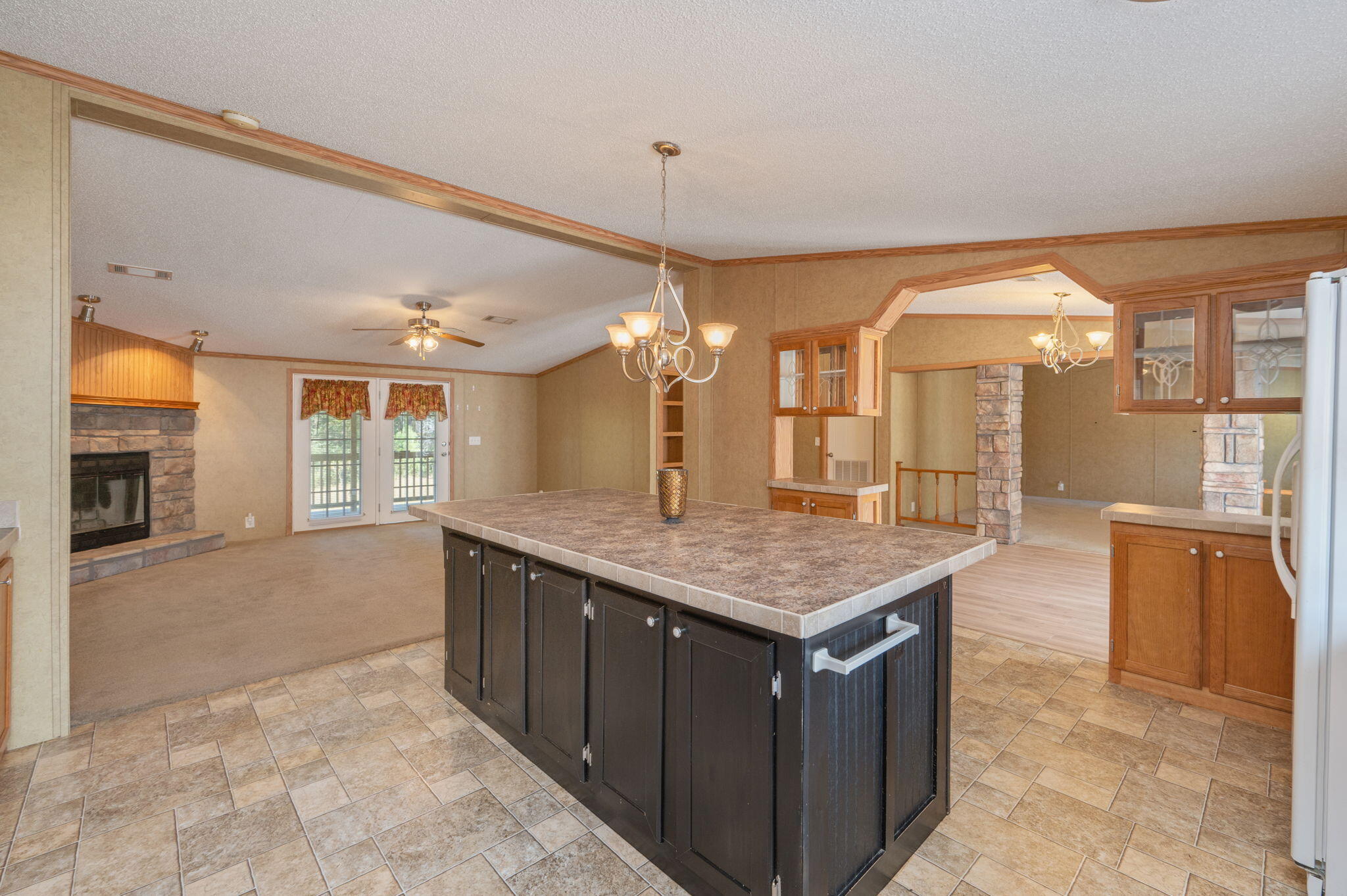 Looking for room to roam and relax? This beauty sits proudly on 2 acres and welcomes you in with a large covered front porch perfect for morning coffee or evening unwinds. Step inside to over 2,300 sq ft of living space with an open concept layout featuring a cozy wood burning fireplace, dining area, bonus room, and a kitchen that'll make any home chef swoon. Complete with a massive island and all appliances included! Faux stone accents add rustic charm throughout. With 4 bedrooms and 2 full bathrooms, there's space for everyone. The ensuite is your personal retreat with a double vanity, separate shower, large soaking tub, and a roomy walk-in closet. Vinyl flooring and soft carpet flow throughout the home. Out back, a spacious covered deck with ceiling fans sets the stage for grillin' and chillin'. Just steps away, you'll find a detached 2-car garage with workshop and an extra yard building for storage. With a durable metal roof and easy care vinyl siding, this one's got the looks and the longevity. Your country comfort dream home is calling so you better answer!