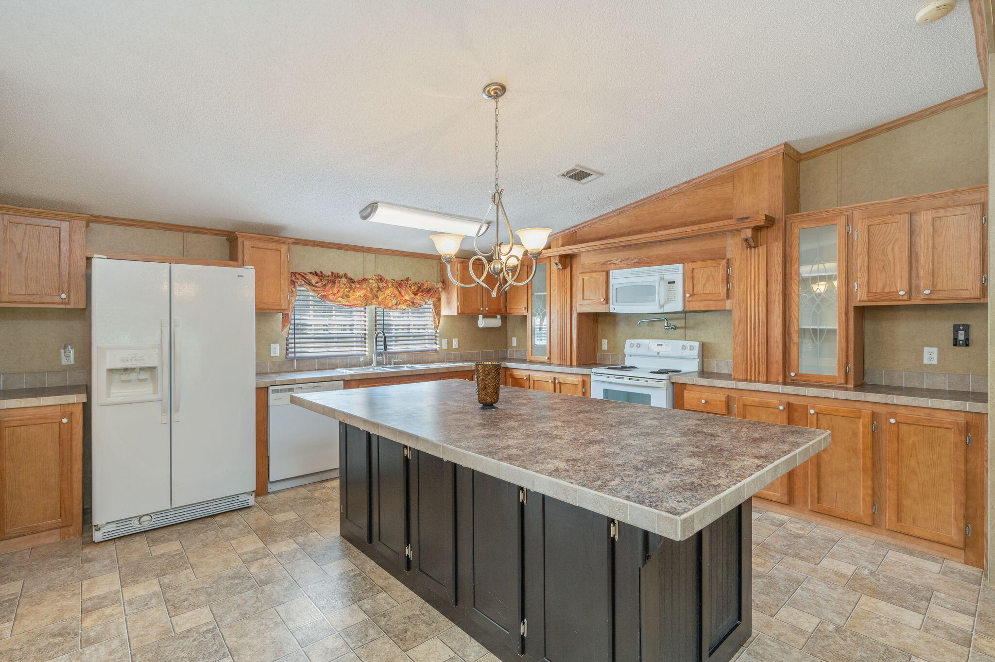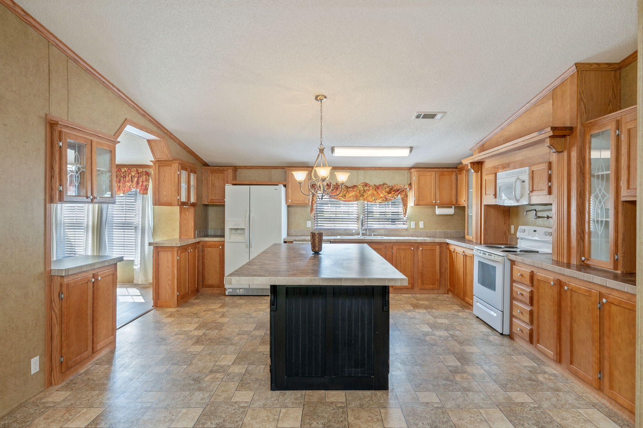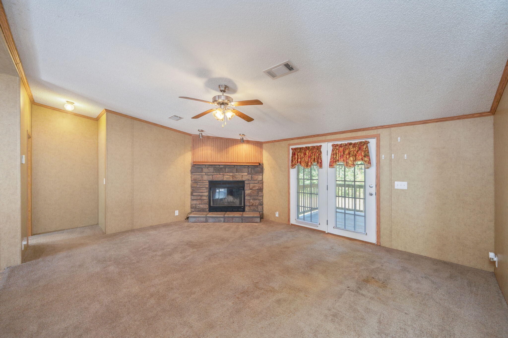 Looking for room to roam and relax? This beauty sits proudly on 2 acres and welcomes you in with a large covered front porch perfect for morning coffee or evening unwinds. Step inside to over 2,300 sq ft of living space with an open concept layout featuring a cozy wood burning fireplace, dining area, bonus room, and a kitchen that'll make any home chef swoon. Complete with a massive island and all appliances included! Faux stone accents add rustic charm throughout. With 4 bedrooms and 2 full bathrooms, there's space for everyone. The ensuite is your personal retreat with a double vanity, separate shower, large soaking tub, and a roomy walk-in closet. Vinyl flooring and soft carpet flow throughout the home. Out back, a spacious covered deck with ceiling fans sets the stage for grillin' and chillin'. Just steps away, you'll find a detached 2-car garage with workshop and an extra yard building for storage. With a durable metal roof and easy care vinyl siding, this one's got the looks and the longevity. Your country comfort dream home is calling so you better answer!