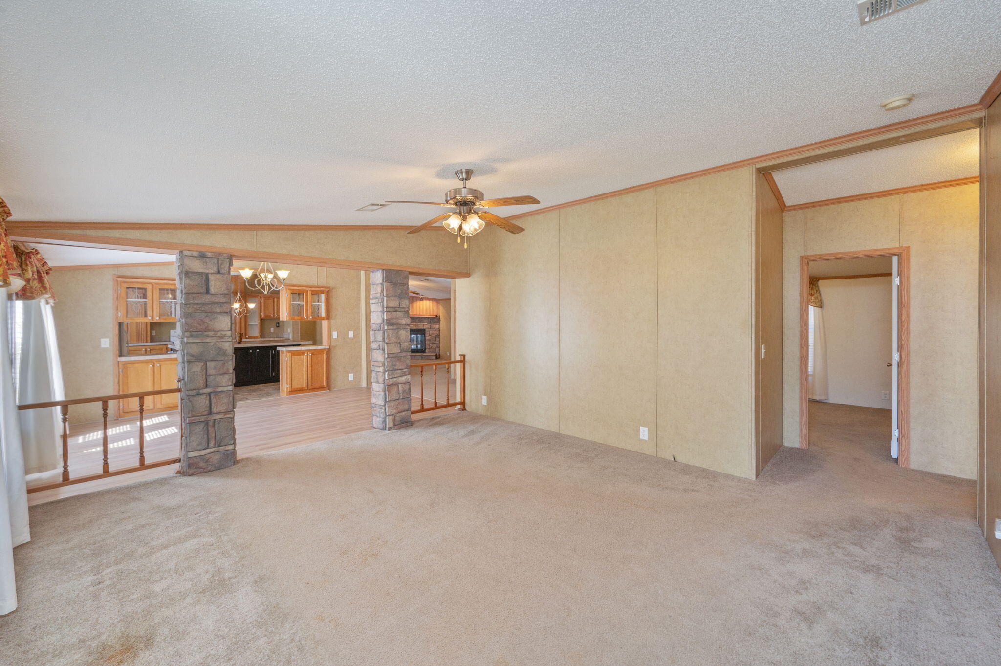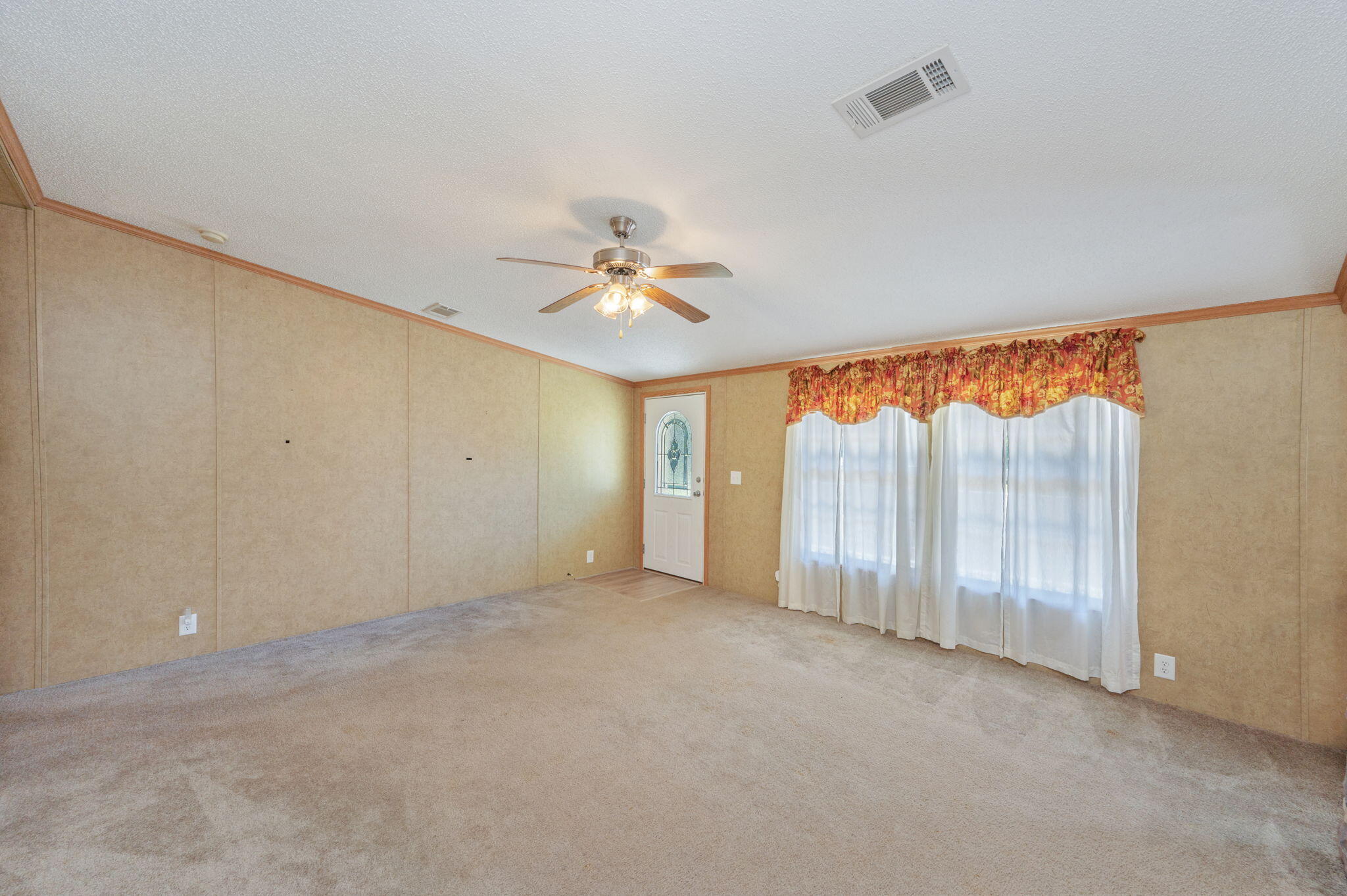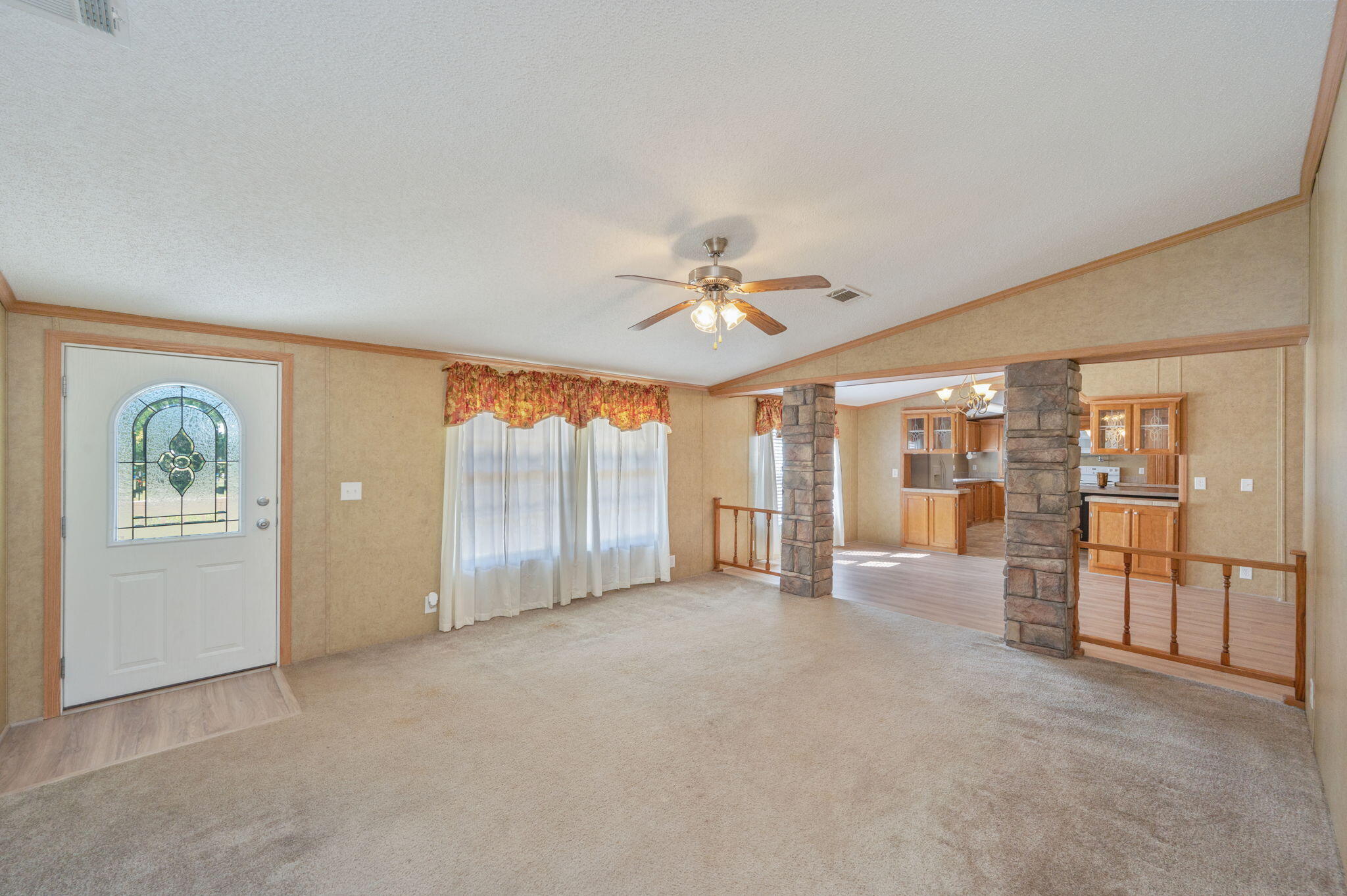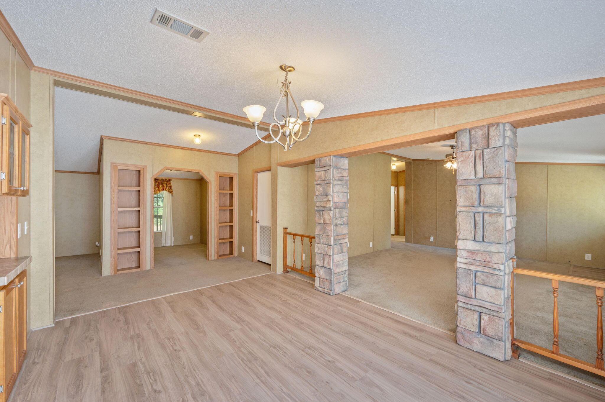 Looking for room to roam and relax? This beauty sits proudly on 2 acres and welcomes you in with a large covered front porch perfect for morning coffee or evening unwinds. Step inside to over 2,300 sq ft of living space with an open concept layout featuring a cozy wood burning fireplace, dining area, bonus room, and a kitchen that'll make any home chef swoon. Complete with a massive island and all appliances included! Faux stone accents add rustic charm throughout. With 4 bedrooms and 2 full bathrooms, there's space for everyone. The ensuite is your personal retreat with a double vanity, separate shower, large soaking tub, and a roomy walk-in closet. Vinyl flooring and soft carpet flow throughout the home. Out back, a spacious covered deck with ceiling fans sets the stage for grillin' and chillin'. Just steps away, you'll find a detached 2-car garage with workshop and an extra yard building for storage. With a durable metal roof and easy care vinyl siding, this one's got the looks and the longevity. Your country comfort dream home is calling so you better answer!