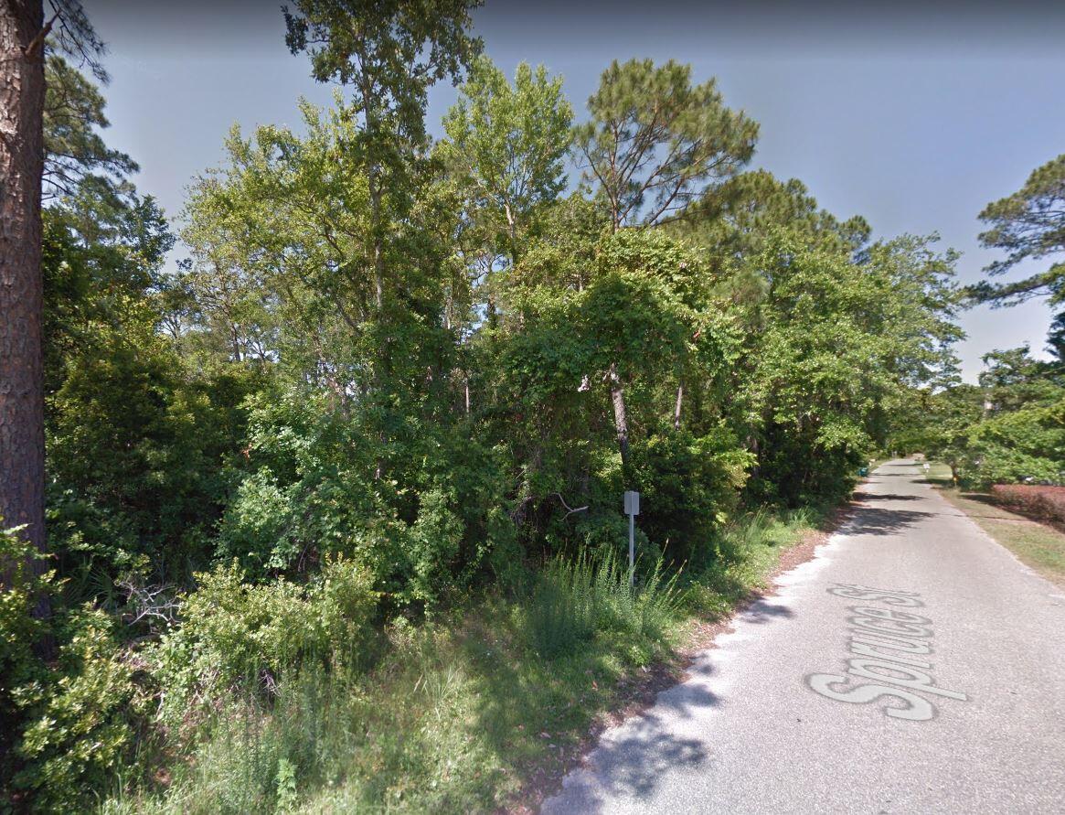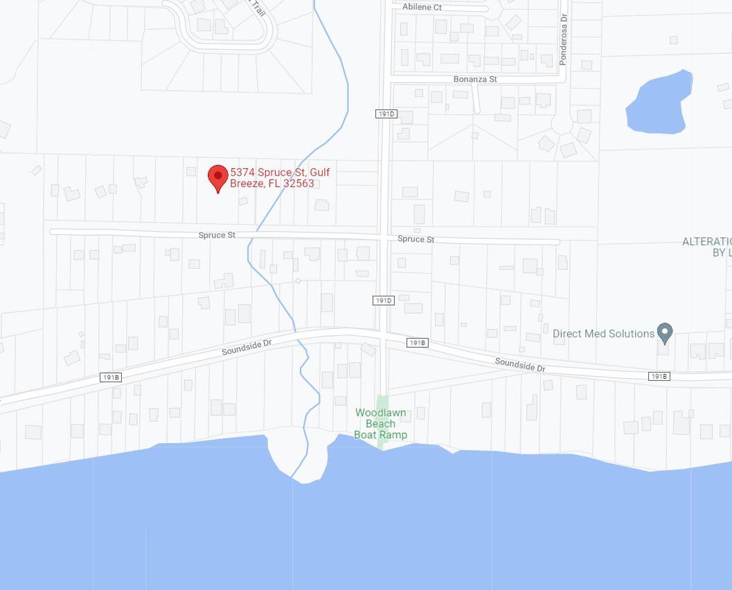 In Gulf Breeze Midway area, from major road Gulf Breeze Parkway/ Hwy 98, turn South into Woodlawn Beach Road. Follow straight South for approx 0.5 mile. Then turn right, West, into Spruce Street. The Lot is in 500 feet on the right side of Spruce Street.