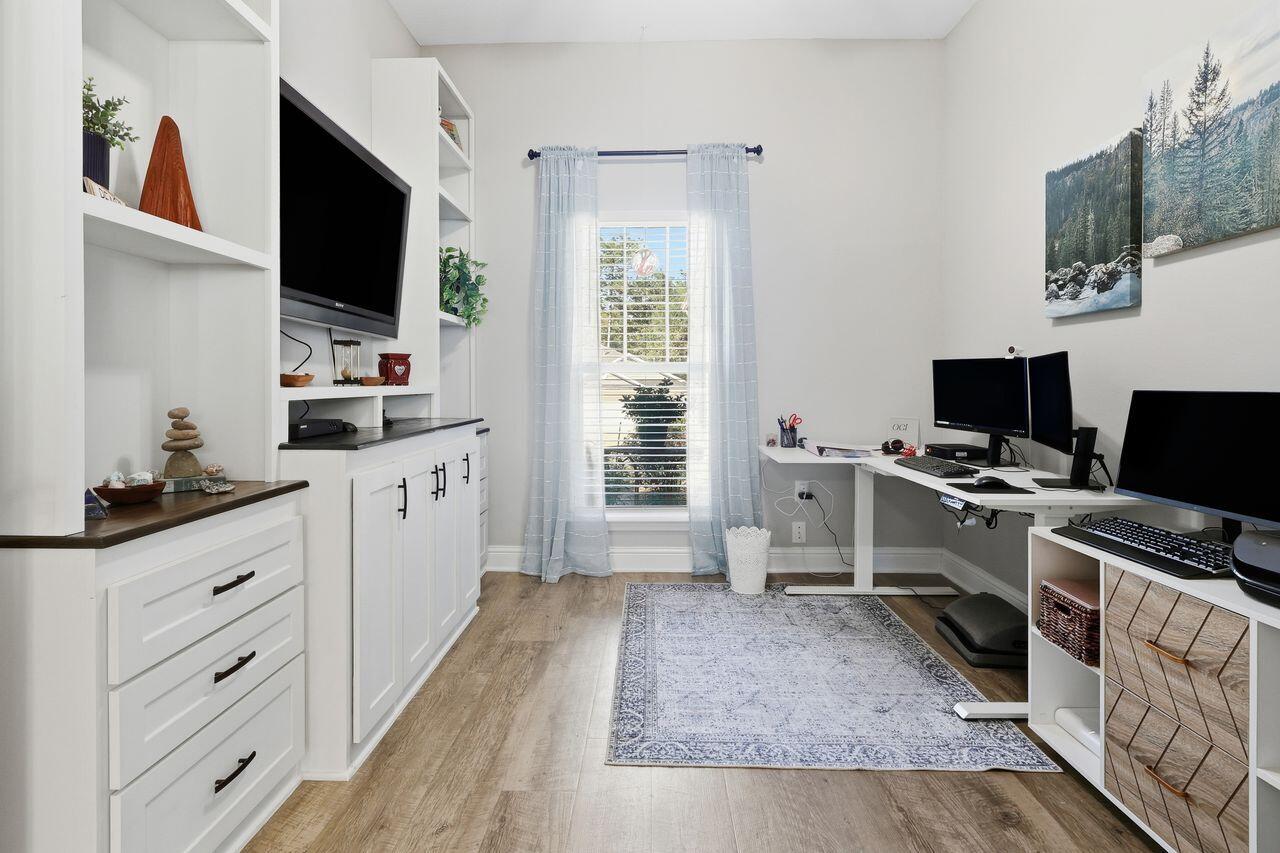 Welcome to 3025 Crown Creek Circle -- a beautiful, like-new 4-bedroom, 2.5-bath home with an office/flex room in the sought-after Brooke Estates community! This spacious Craftsman-style home features an open split-bedroom layout with 2,423 sq ft of living space and a 3-car garage with additional driveway parking for four vehicles.Inside, you'll love the open concept living area with luxury vinyl plank flooring and plenty of natural light. The kitchen boasts granite countertops, stainless steel appliances, a pantry, and a large island perfect for entertaining. A custom mud bench adds convenience in the foyer.The private primary suite includes two large walk-in closets, double vanities, a soaking tub, and a walk-in tile shower. The versatile office/flex room features French doors and custom built-in bookshelves, offering an ideal workspace or hobby area.