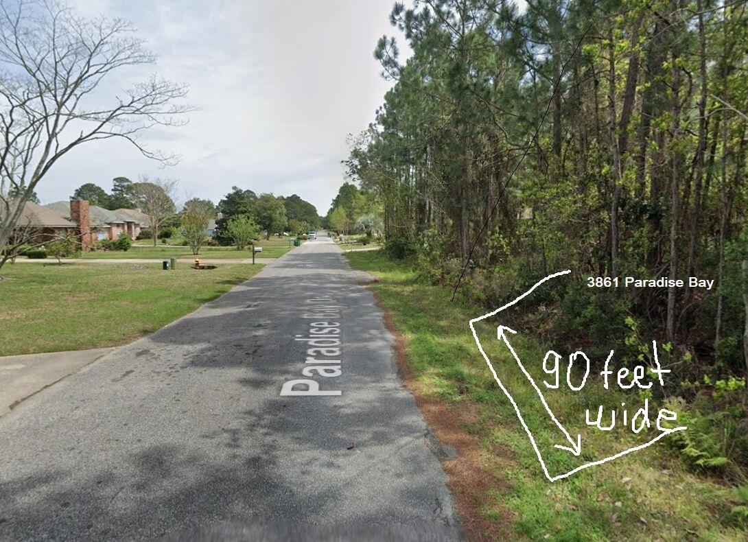 In Gulf Breeze Midway, across from the Tiger Point Publix/ Walmart shopping plaza, from major road Gulf Breeze Parkway/ Hwy 98, turn North into Paradise Bay Drive. Follow Paradise Bay Drive passing Stop signsand the road curve. The Lot 67 is near the end of Paradise Bay Drive, on South side and overlooking the Bay waters.