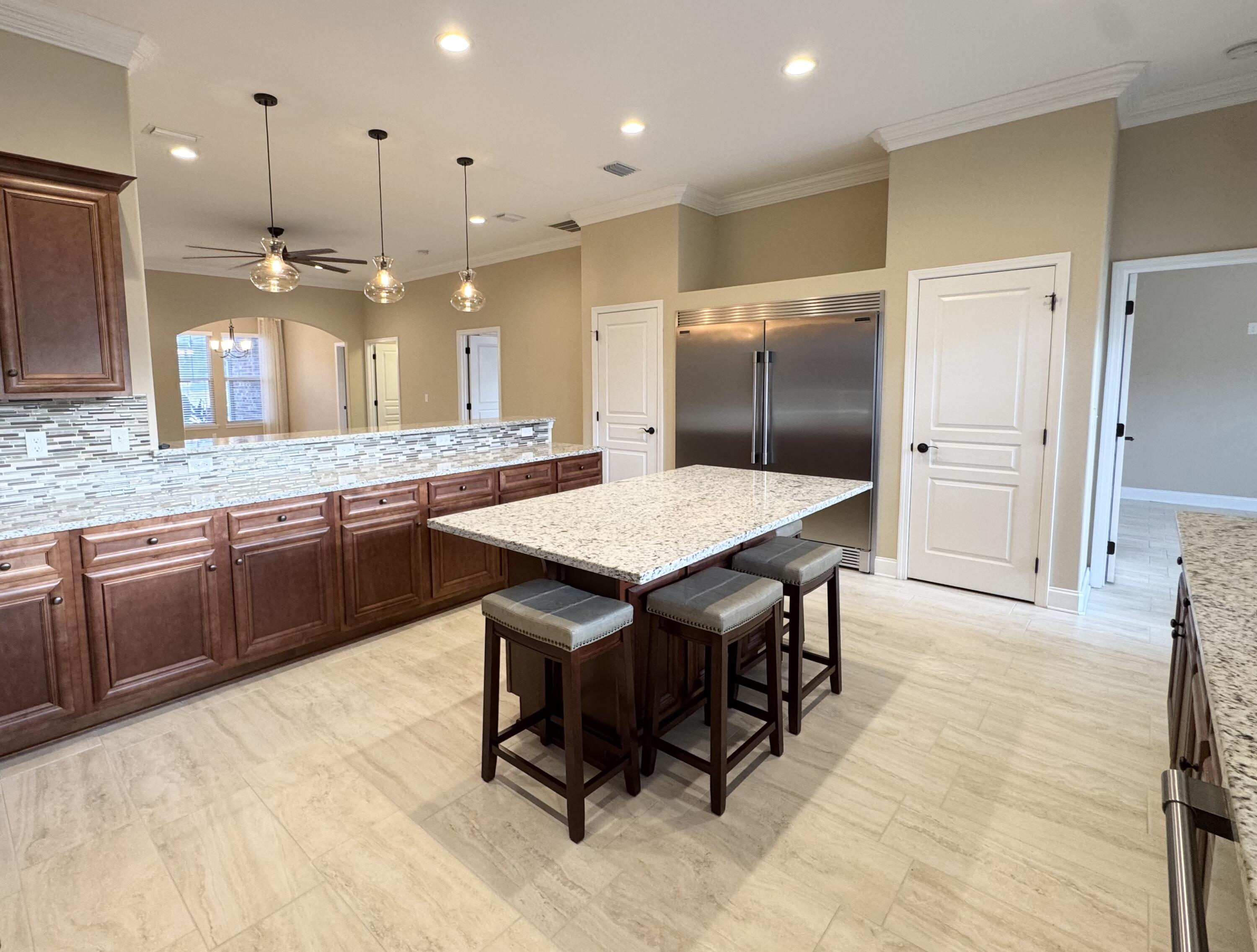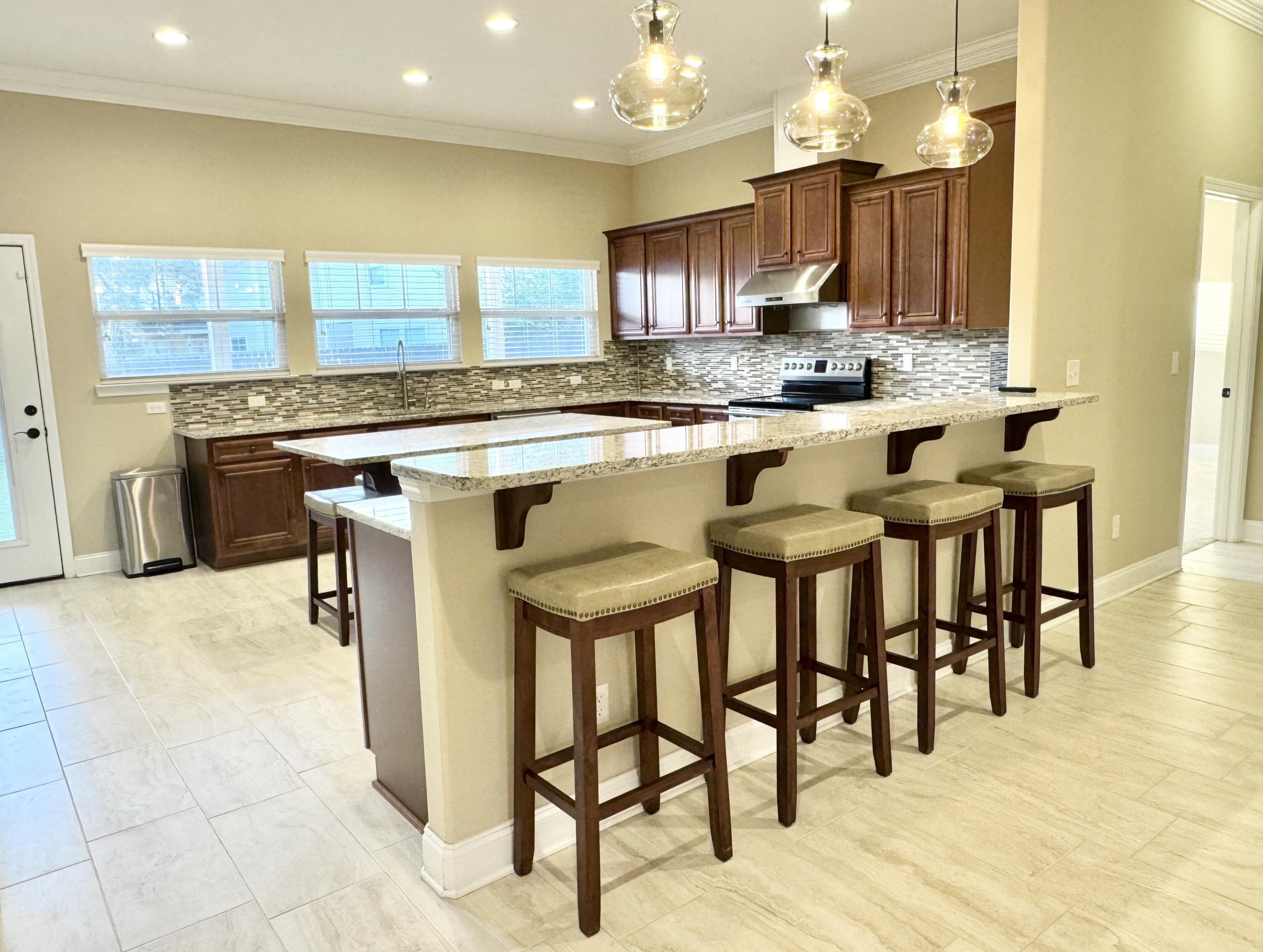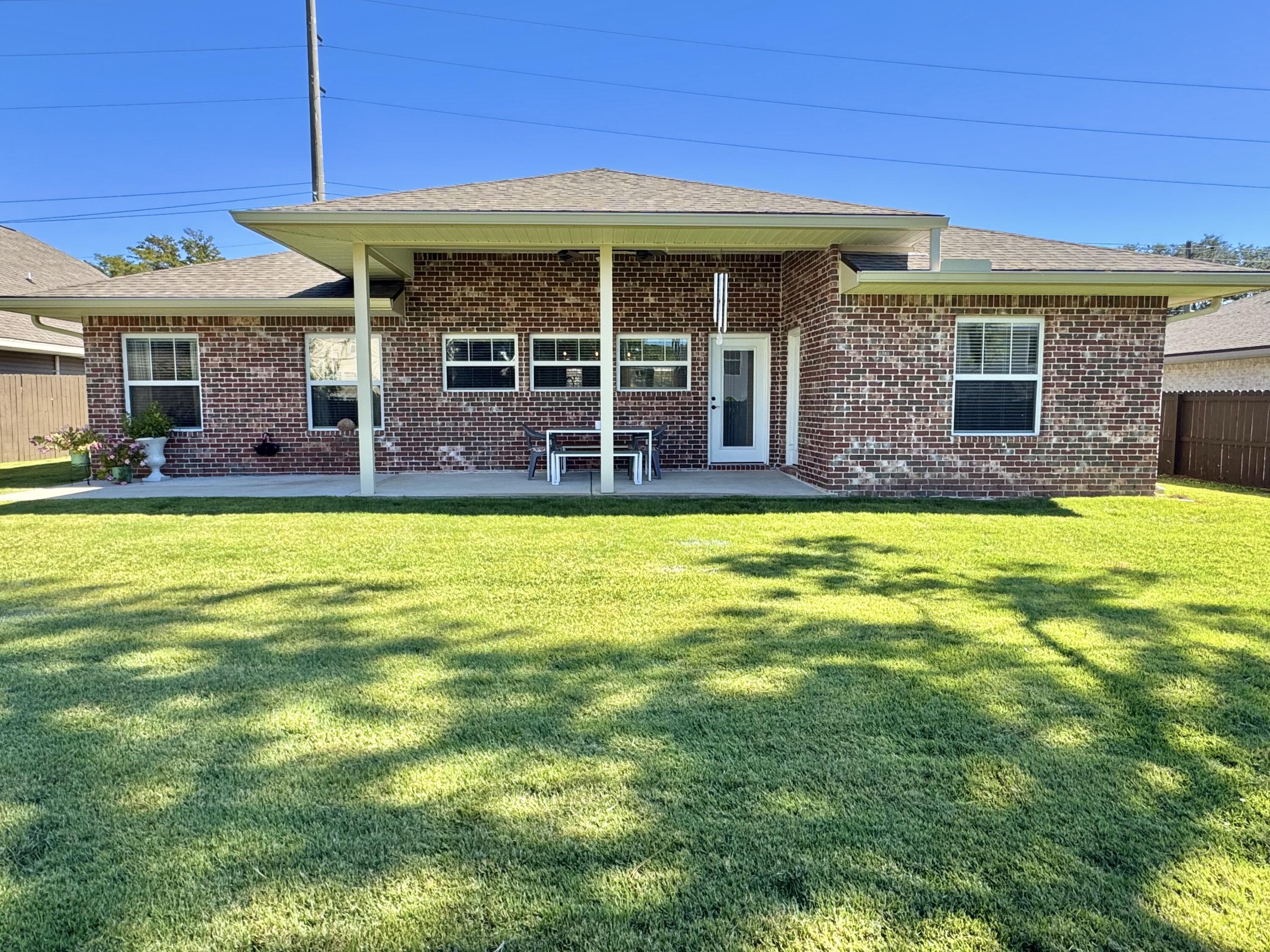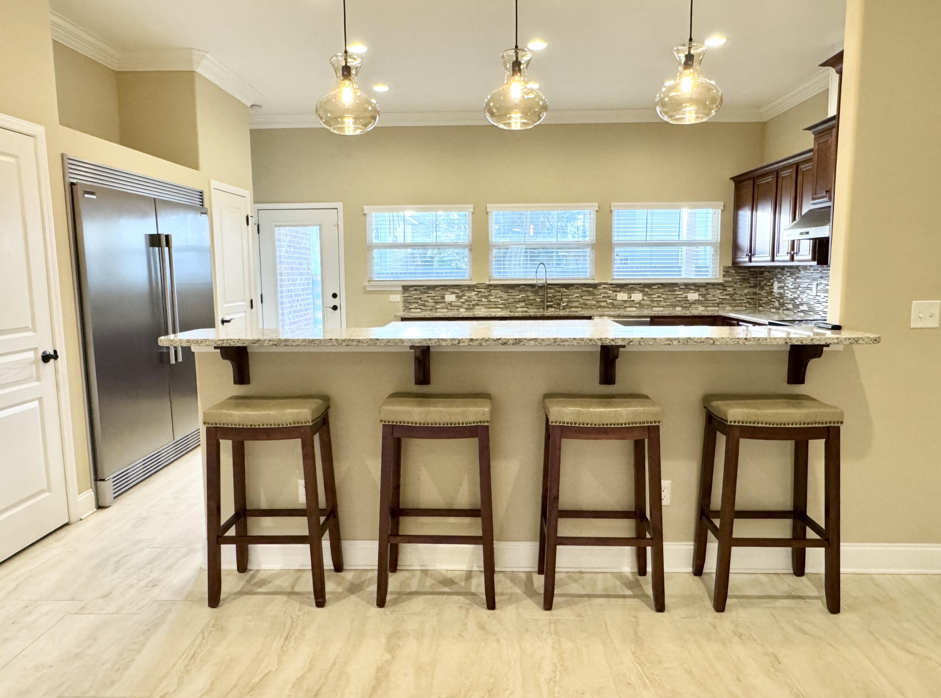 Seller is offering a $10k concession with acceptable offer. This beautifully crafted all brick exterior 4 bed/3 bath home is close to schools, military bases, shopping, restaurants, and the beach. It has wonderful architectural details such as high ceilings, crown molding, arched walls, and rounded corners. Its open concept living areas includes a large kitchen which is the crown jewel of the home with ample cabinets, excessive granite counter space, seating at both the island and the bar, a high-powered vent hood, convection oven, an oversized built-in professional refrigerator and freezer paired with matching stainless steel appliances, and 2 pantries. The split plan offers a private primary suite with double vanity, a roomy walk-in shower, separate toilet room, and 2 closets with one being a spacious walk-in. Two additional bedrooms share a Jack-and-Jill ensuite, and another guest bedroom with walk-in closet has its own access to the guest bathroom. The laundry room comes equipped with a utility sink and a set of large Samsung front-loader washer and dryer with pedestal drawers for storage. Outside, there's a Rainbird sprinkler system for the newly sodded yard placed last spring, a fully fenced backyard with a covered extended patio which is perfect for outdoor living. The 2 car garage has shelving systems in place and the additional u-shaped driveway allows for extra parking, easy exit/entry. Other unique features of this home: Culligan filtered water system in kitchen, integrated surge protector, a Manabloc modular manifold plumbing system, 2 persimmons trees, and a pear tree. Also included are the island and bar stools, the back patio table/benches, the front porch bench, and 2 tv wall mounts. Come check out this competitively priced stunning home ASAP before it's too late!