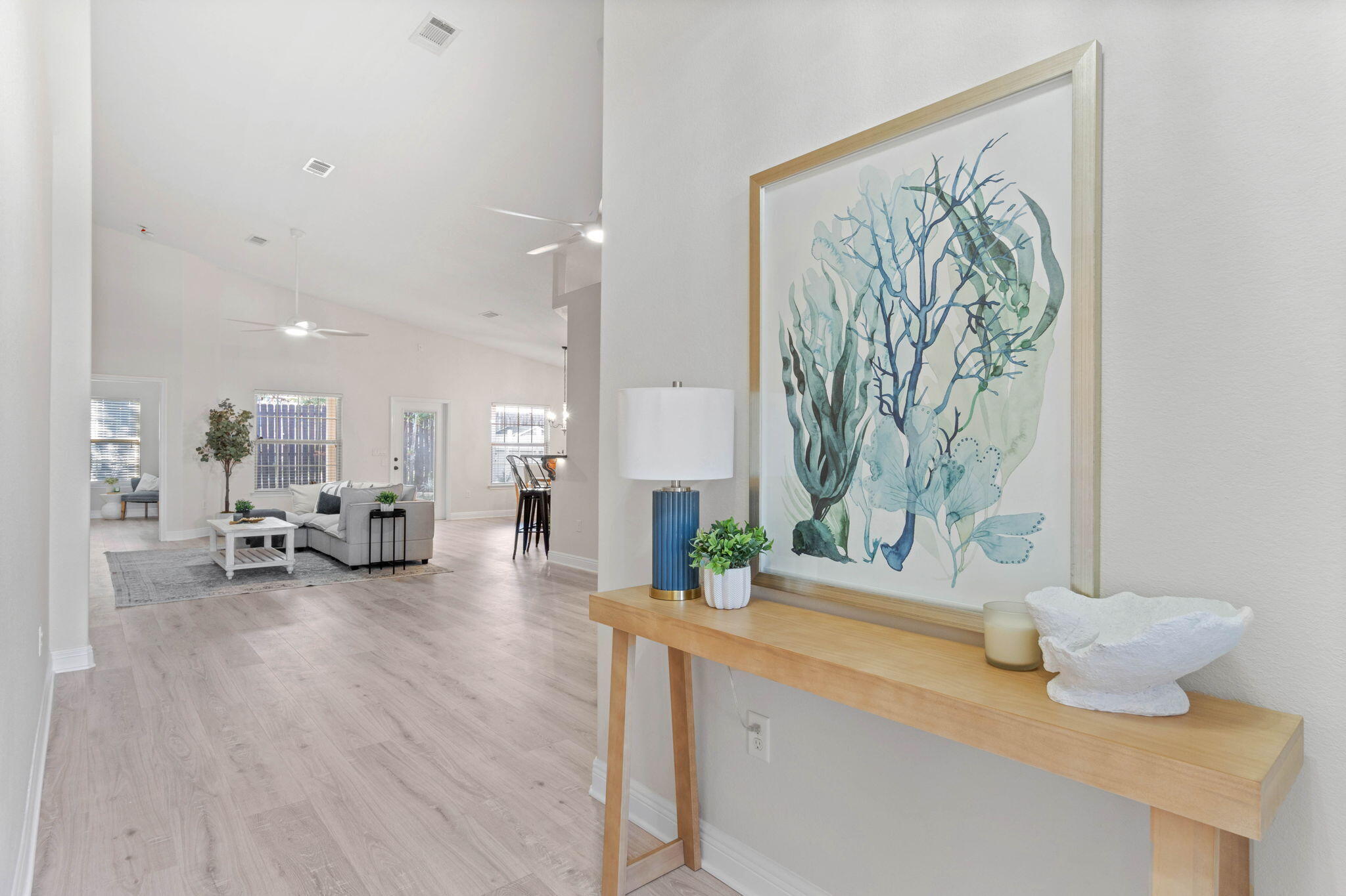 Stunning Renovated Home in Desirable Community!If you're seeking a low-maintenance lifestyle, look no further! This beautifully renovated 3-bedroom, 2-bath home spans 1,870 square feet and boasts an architectural interior design with a bright, open floor plan and soaring vaulted ceilings.Step inside to discover gorgeous vinyl flooring that flows throughout the home, complemented by a trendy, freshly painted interior and an inviting exterior facade. Replaced all the fixtures, ensuring a modern touch in every corner and a new water heater.The kitchen is a chef's dream, featuring sleek new appliances, a stylish backsplash, and a hood vent that enhances its aesthetic appeal. Enjoy ample storage space with a walk-in pantry and two spacious master walk-in closets. The home also includes a convenient two-car garage for your vehicles and toys.
