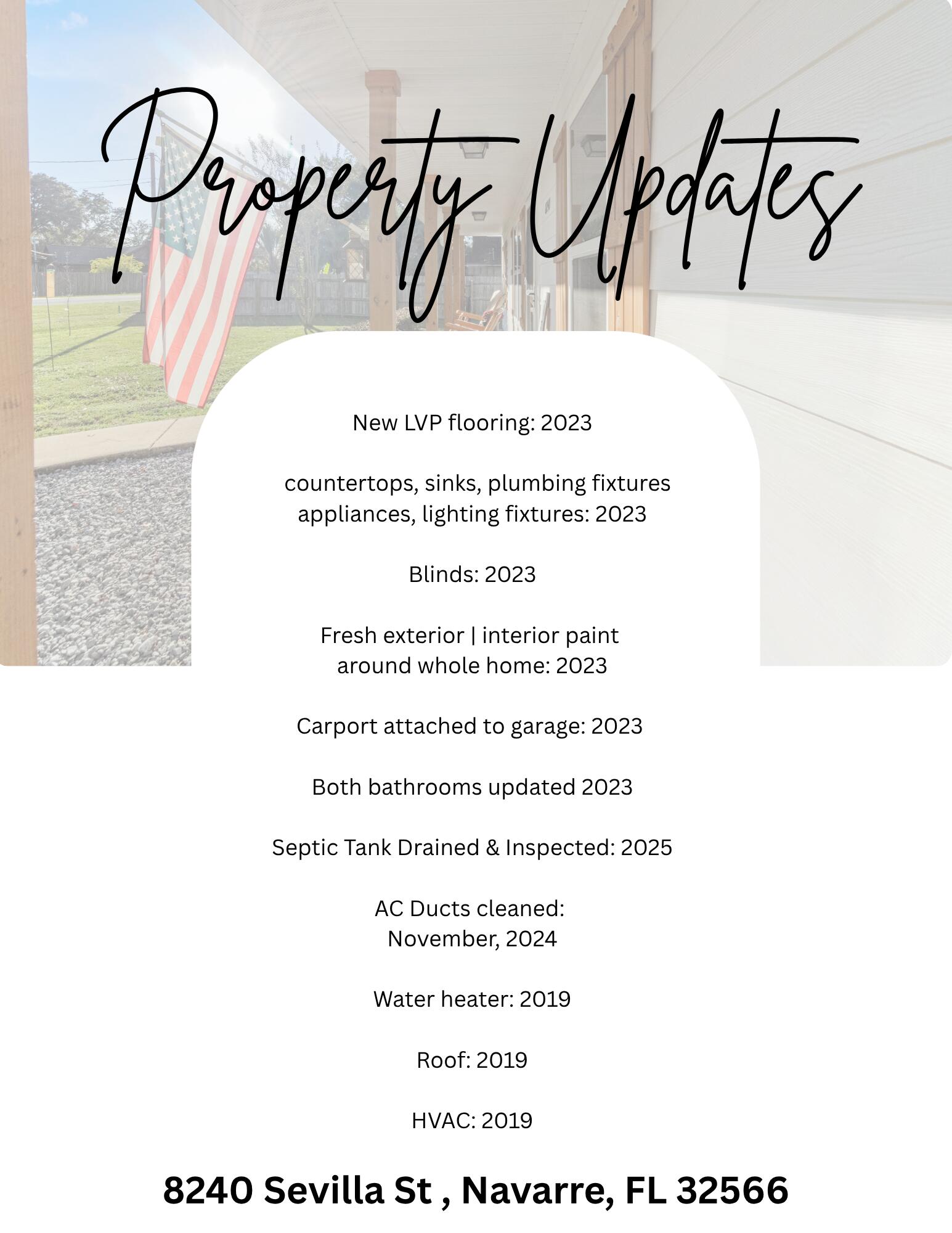 Welcome to your slice of paradise in Navarre! This beautifully renovated 3-bedroom, 2-bath home has been lovingly maintained and thoughtfully updated by its owners with one goal in mind -- comfort and peace. Sitting on a spacious lot, there's plenty of room for family gatherings, outdoor fun, and quiet evenings under the Florida sky.Inside, you'll notice the care that went into every detail. Every wall and ceiling has been freshly textured and painted, complemented by brand new LVP flooring throughout. The kitchen features painted cabinets, new countertops, a modern sink, and updated stainless steel appliances. The bathrooms have been refreshed by adding new fiber glass showers, vanities, and toilets. This home is truly move-in ready -- the AC ducts have been cleaned, the septic tank has been drained and inspected. The exterior has also been freshly painted and features well-kept landscaping that adds to the home's curb appeal. A built-in workshop attached to the garage offers endless possibilities perfect for a car enthusiast, a woodworker, or anyone who loves a good project space.