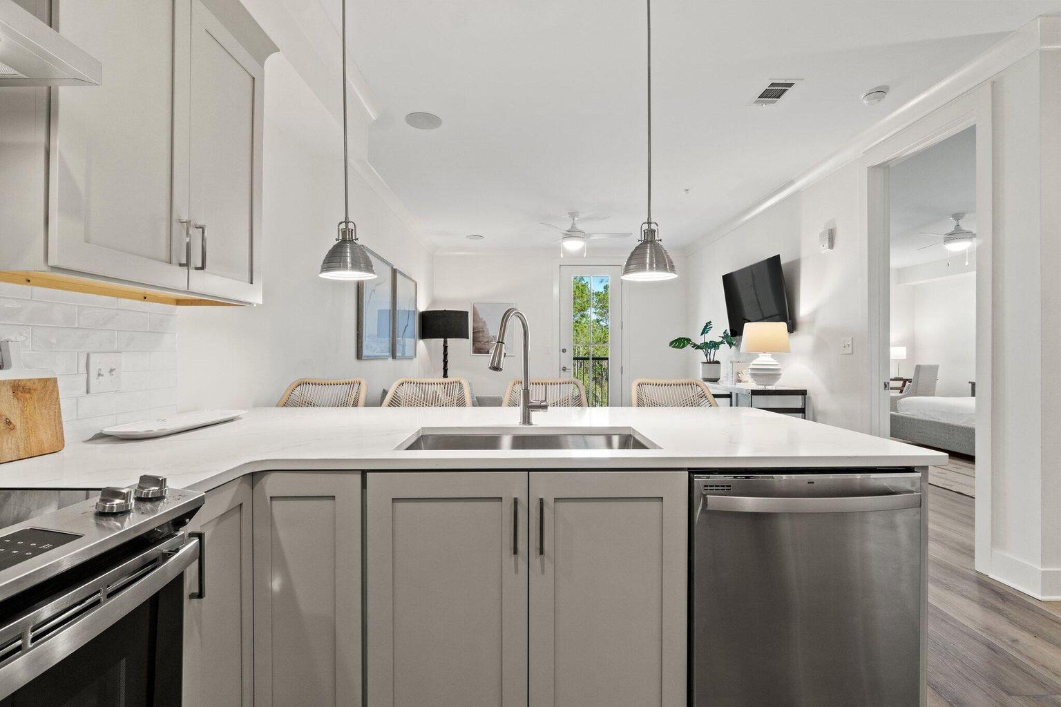 Discover the allure of beach living in this luxury (1) bed, (1) bath never rented or lived in condo in the new and exclusive community of Pinewood 30A. Surrounded by Point Washington State Forest plus a short bike ride to public beach accesses, restaurants and shopping makes this the perfect opportunity for a full-time residence, second home or rental property. A covered parking spot, valued at $12k and closest to building 3, is included in the sales price. Serving as the former model home, luxury features include quartz countertops, subway tile backsplash, expert craftsmanship, stainless GE energy star appliances, luxury vinyl + tile flooring, large walk-in closet with custom wood shelving, 9' ceilings, 8' solid core doors, private covered porches + more!