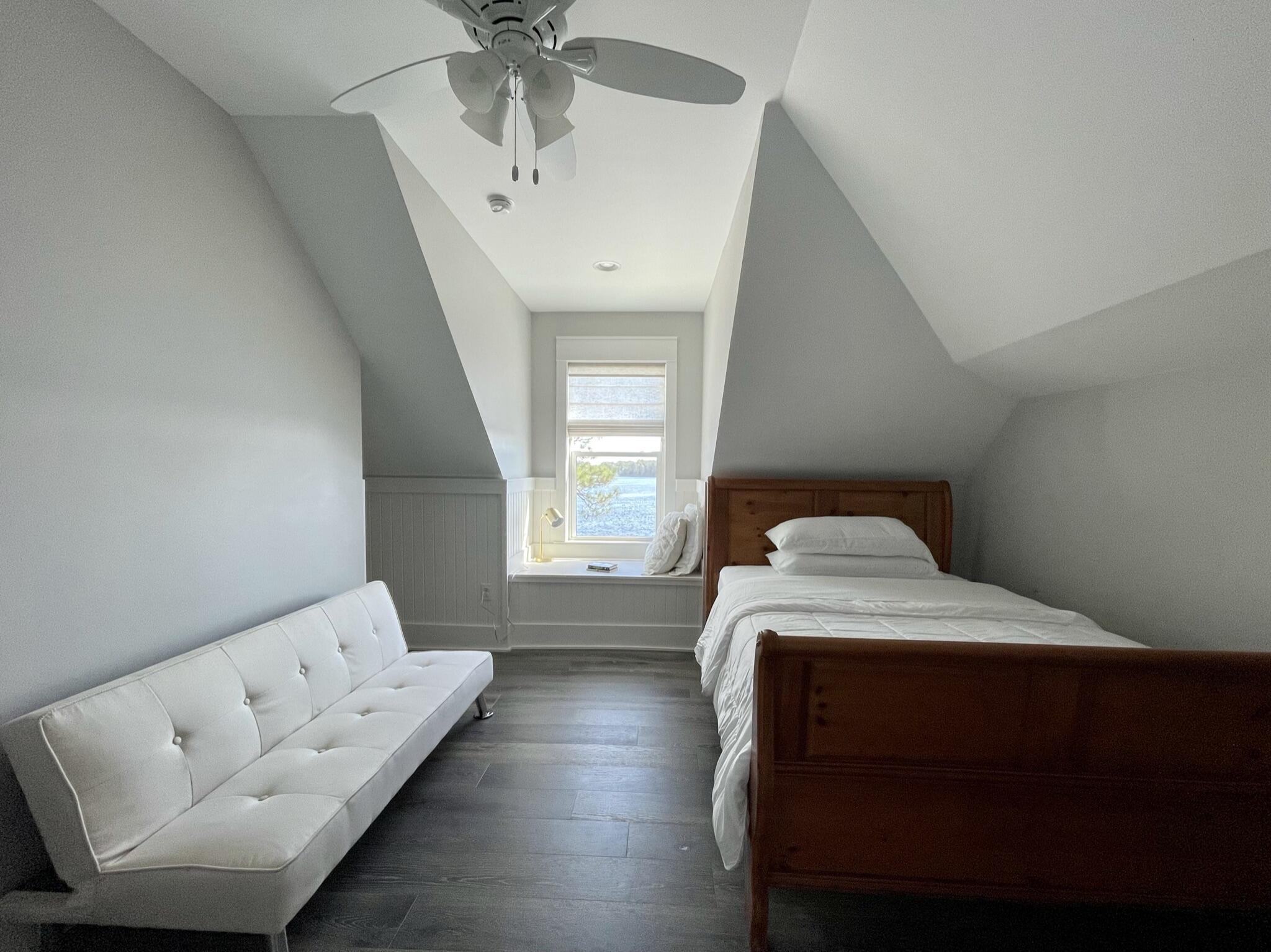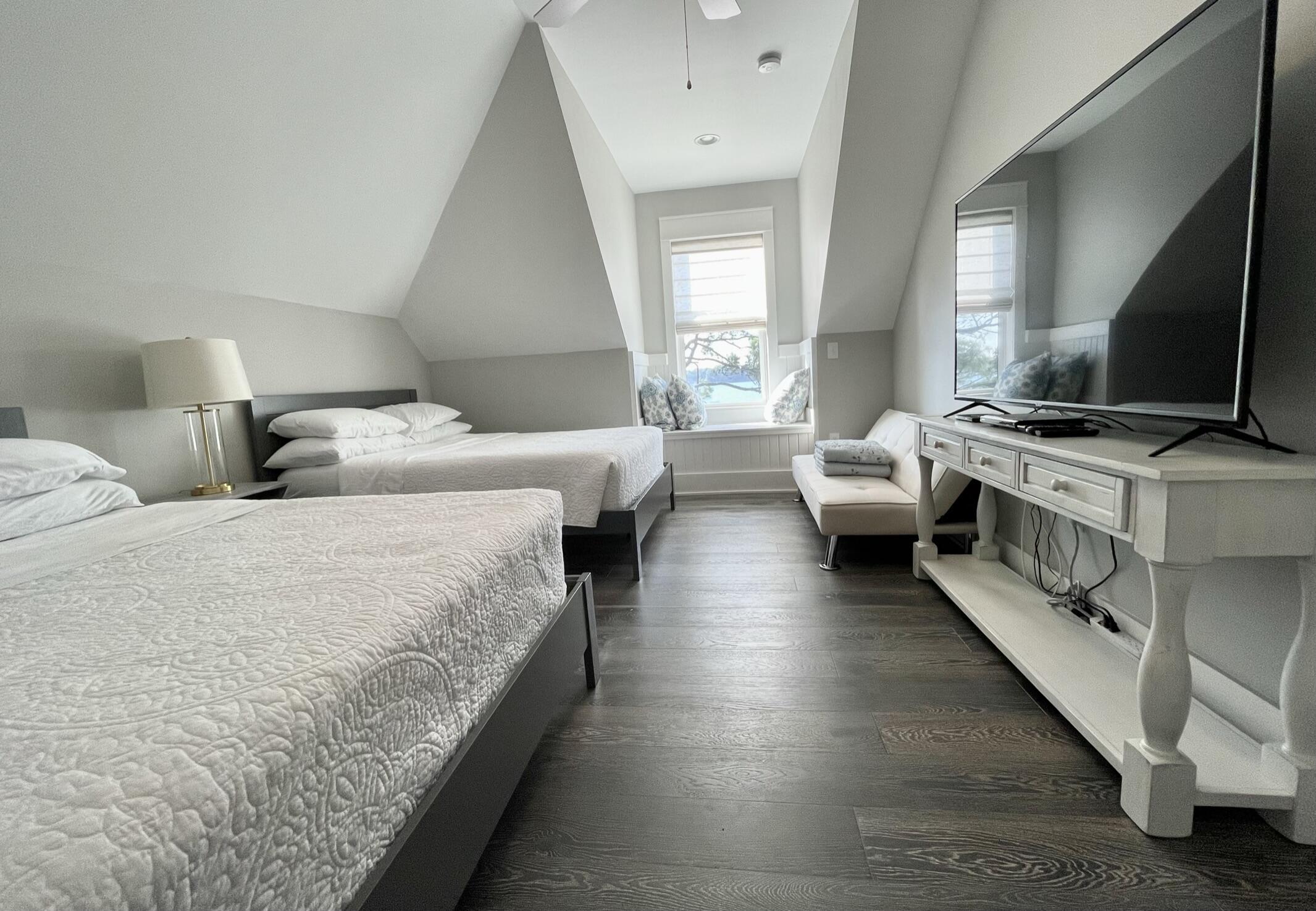 The ground level offers covered parking, a large storage room and an additional finished bonus space with full bath, currently used as extra sleeping room. There is room for a future elevator.