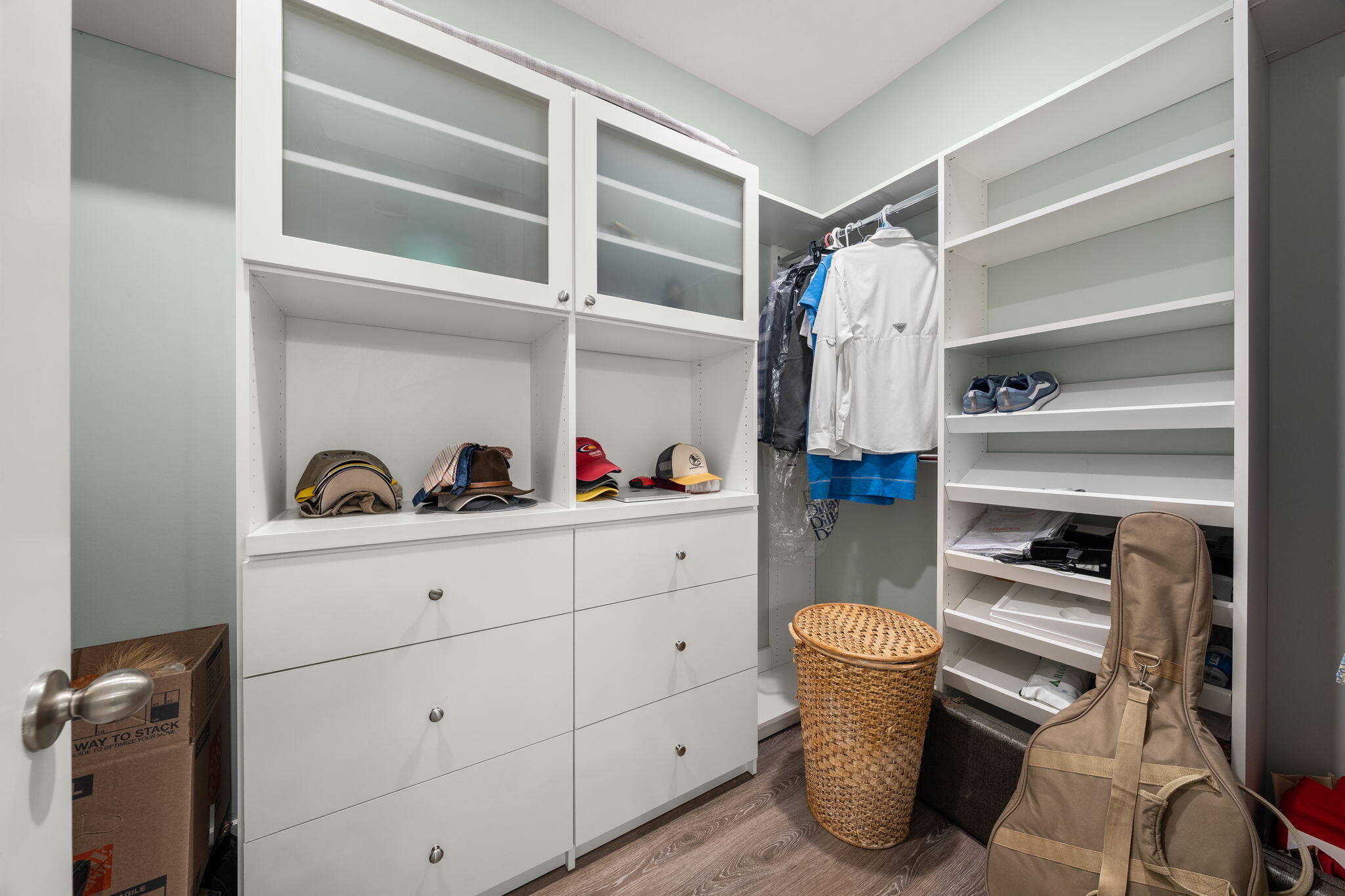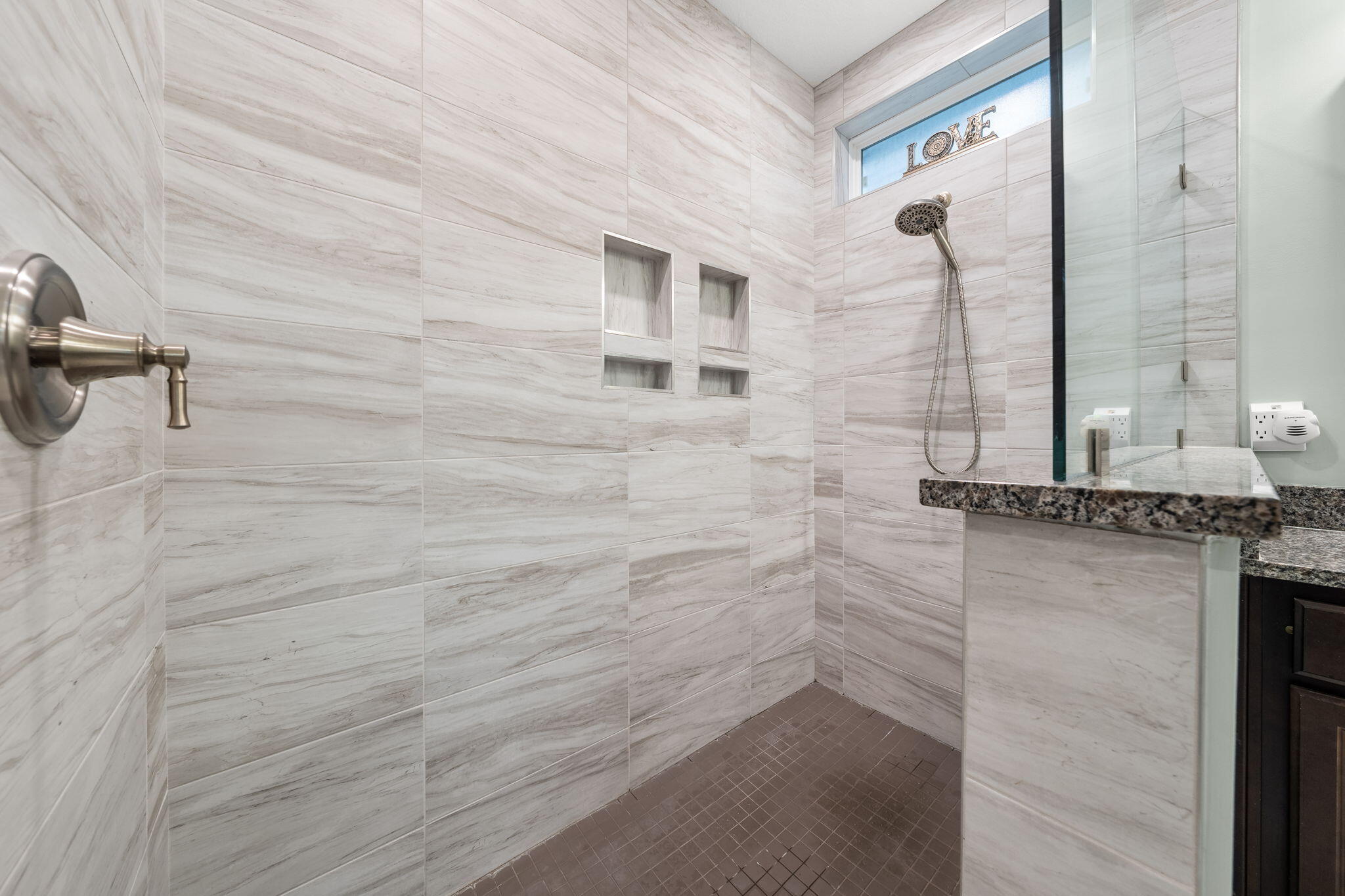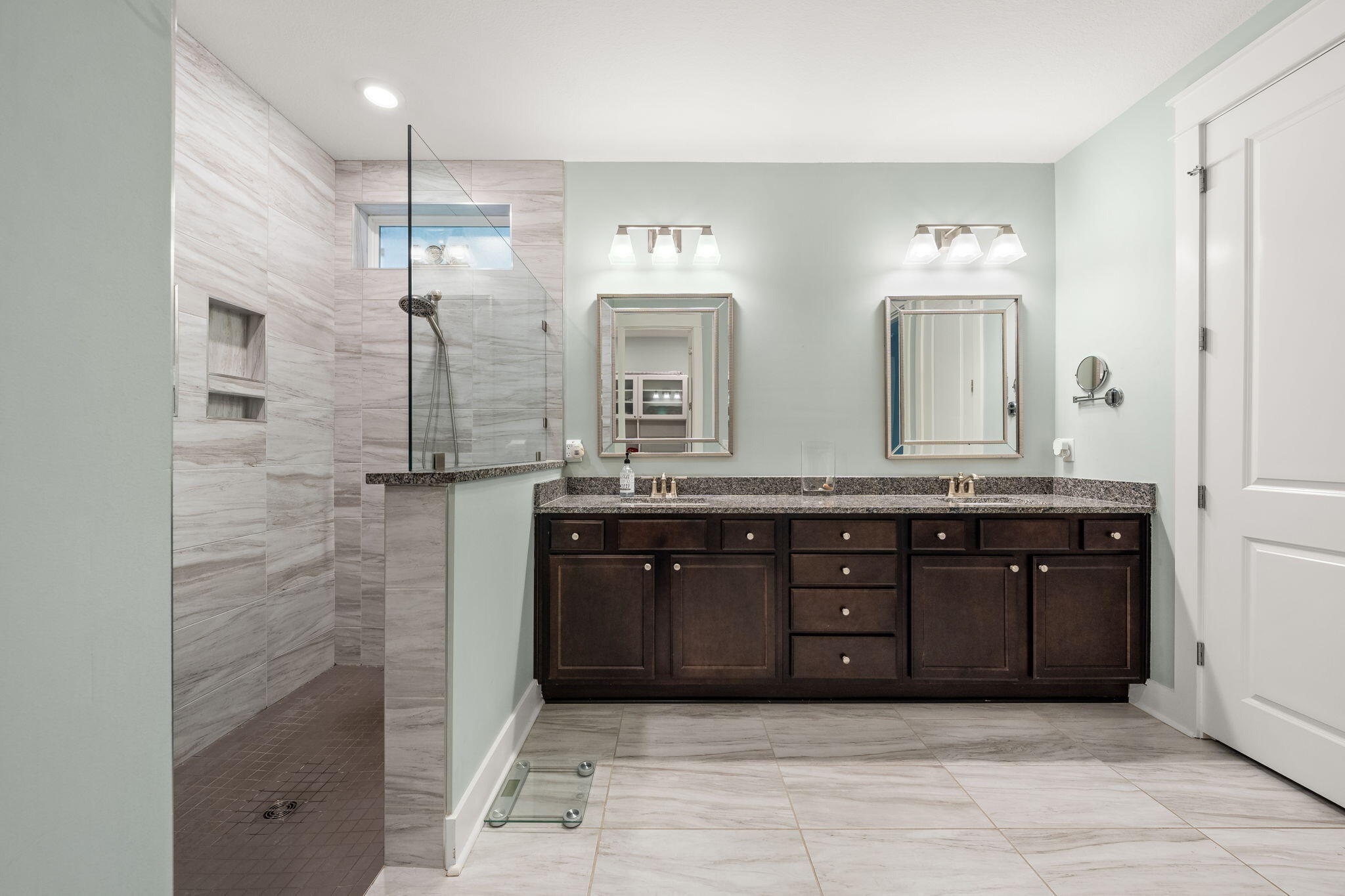 The guest bathroom includes a premium walk-in tub/shower hybrid, combining comfort, safety, and therapeutic design. The primary suite overlooks the serene pool and backyard, creating a peaceful retreat. The ensuite bathroom features a double vanity, a large tiled walk-in shower, and a customized walk-in closet for ample storage.