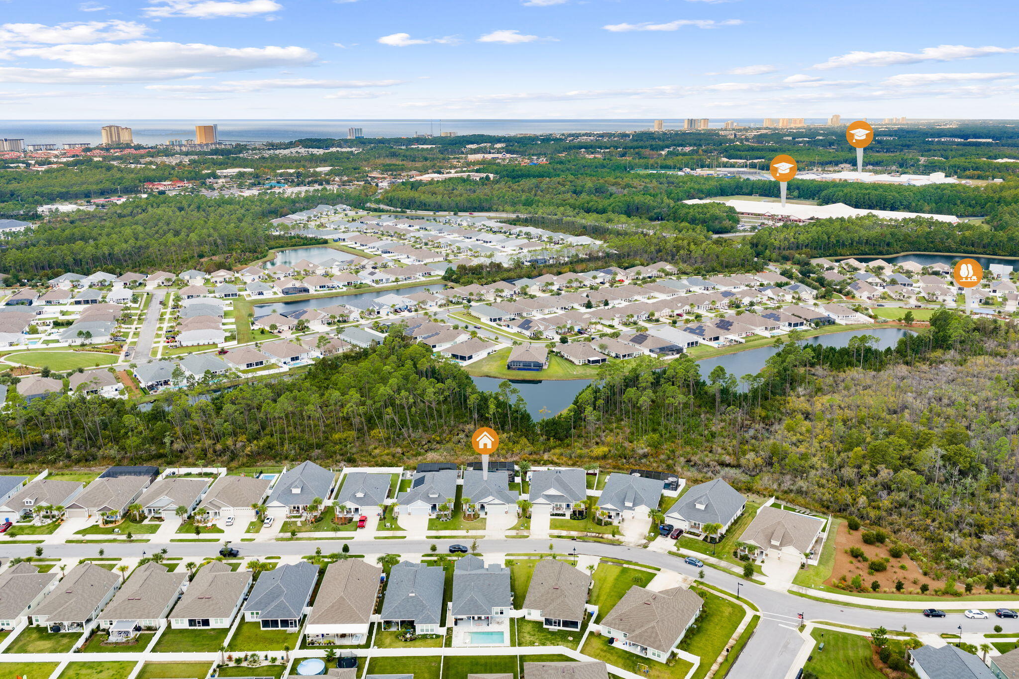At the community entrance, there is a Publix located within the Breakfast Point Marketplace Shopping Center. With this location, you are near various neighborhood playgrounds, minutes from Duplin Winery, and only a short five-mile drive to Pier Park and Frank Brown Park for a plethora of shopping and recreational opportunities.